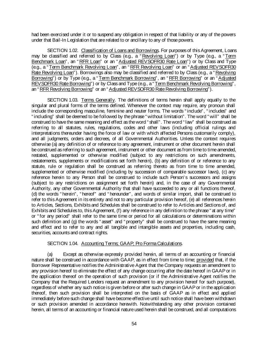 had been exercised under it or to suspend any obligation in respect of that liability or any of the powers under that Bail-In Legislation that are related to or ancillary to any of those powers. SECTION 1.02. Classification of Loans and Borrowings. For purposes of this Agreement, Loans may be classified and referred to by Class (e.g., a “Revolving Loan”) or by Type (e.g., a “Term Benchmark Loan”, an “RFR Loan” or an “Adjusted REVSOFR30 Rate Loan”) or by Class and Type (e.g., a “Term Benchmark Revolving Loan”, an “RFR Revolving Loan” or an “Adjusted REVSOFR30 Rate Revolving Loan”). Borrowings also may be classified and referred to by Class (e.g., a “Revolving Borrowing”) or by Type (e.g., a “Term Benchmark Borrowing”, an “RFR Borrowing” or an “Adjusted REVSOFR30 Rate Borrowing”) or by Class and Type (e.g., a “Term Benchmark Revolving Borrowing”, an “RFR Revolving Borrowing” or an “Adjusted REVSOFR30 Rate Revolving Borrowing”). SECTION 1.03. Terms Generally. The definitions of terms herein shall apply equally to the singular and plural forms of the terms defined. Whenever the context may require, any pronoun shall include the corresponding masculine, feminine and neuter forms. The words “include”, “includes” and “including” shall be deemed to be followed by the phrase “without limitation”. The word “will” shall be construed to have the same meaning and effect as the word “shall”. The word “law” shall be construed as referring to all statutes, rules, regulations, codes and other laws (including official rulings and interpretations thereunder having the force of law or with which affected Persons customarily comply), and all judgments, orders and decrees, of all Governmental Authorities. Unless the context requires otherwise (a) any definition of or reference to any agreement, instrument or other document herein shall be construed as referring to such agreement, instrument or other document as from time to time amended, restated, supplemented or otherwise modified (subject to any restrictions on such amendments, restatements, supplements or modifications set forth herein), (b) any definition of or reference to any statute, rule or regulation shall be construed as referring thereto as from time to time amended, supplemented or otherwise modified (including by succession of comparable successor laws), (c) any reference herein to any Person shall be construed to include such Person’s successors and assigns (subject to any restrictions on assignment set forth herein) and, in the case of any Governmental Authority, any other Governmental Authority that shall have succeeded to any or all functions thereof, (d) the words “herein”, “hereof” and “hereunder”, and words of similar import, shall be construed to refer to this Agreement in its entirety and not to any particular provision hereof, (e) all references herein to Articles, Sections, Exhibits and Schedules shall be construed to refer to Articles and Sections of, and Exhibits and Schedules to, this Agreement, (f) any reference in any definition to the phrase “at any time” or “for any period” shall refer to the same time or period for all calculations or determinations within such definition and (g) the words “asset” and “property” shall be construed to have the same meaning and effect and to refer to any and all tangible and intangible assets and properties, including cash, securities, accounts and contract rights. SECTION 1.04. Accounting Terms; GAAP; Pro Forma Calculations. (a) Except as otherwise expressly provided herein, all terms of an accounting or financial nature shall be construed in accordance with GAAP, as in effect from time to time; provided that, if the Borrower Representative notifies the Administrative Agent that the Company requests an amendment to any provision hereof to eliminate the effect of any change occurring after the date hereof in GAAP or in the application thereof on the operation of such provision (or if the Administrative Agent notifies the Company that the Required Lenders request an amendment to any provision hereof for such purpose), regardless of whether any such notice is given before or after such change in GAAP or in the application thereof, then such provision shall be interpreted on the basis of GAAP as in effect and applied immediately before such change shall have become effective until such notice shall have been withdrawn or such provision amended in accordance herewith. Notwithstanding any other provision contained herein, all terms of an accounting or financial nature used herein shall be construed, and all computations 54