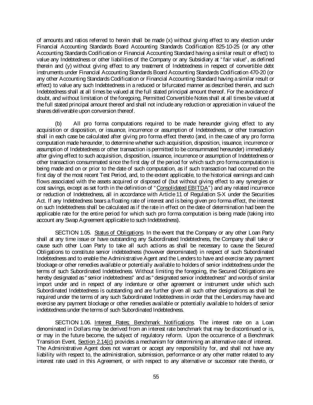 of amounts and ratios referred to herein shall be made (x) without giving effect to any election under Financial Accounting Standards Board Accounting Standards Codification 825-10-25 (or any other Accounting Standards Codification or Financial Accounting Standard having a similar result or effect) to value any Indebtedness or other liabilities of the Company or any Subsidiary at “fair value”, as defined therein and (y) without giving effect to any treatment of Indebtedness in respect of convertible debt instruments under Financial Accounting Standards Board Accounting Standards Codification 470-20 (or any other Accounting Standards Codification or Financial Accounting Standard having a similar result or effect) to value any such Indebtedness in a reduced or bifurcated manner as described therein, and such Indebtedness shall at all times be valued at the full stated principal amount thereof. For the avoidance of doubt, and without limitation of the foregoing, Permitted Convertible Notes shall at all times be valued at the full stated principal amount thereof and shall not include any reduction or appreciation in value of the shares deliverable upon conversion thereof. (b) All pro forma computations required to be made hereunder giving effect to any acquisition or disposition, or issuance, incurrence or assumption of Indebtedness, or other transaction shall in each case be calculated after giving pro forma effect thereto (and, in the case of any pro forma computation made hereunder, to determine whether such acquisition, disposition, issuance, incurrence or assumption of Indebtedness or other transaction is permitted to be consummated hereunder) immediately after giving effect to such acquisition, disposition, issuance, incurrence or assumption of Indebtedness or other transaction consummated since the first day of the period for which such pro forma computation is being made and on or prior to the date of such computation, as if such transaction had occurred on the first day of the most recent Test Period, and, to the extent applicable, to the historical earnings and cash flows associated with the assets acquired or disposed of (but without giving effect to any synergies or cost savings, except as set forth in the definition of “Consolidated EBITDA”) and any related incurrence or reduction of Indebtedness, all in accordance with Article 11 of Regulation S-X under the Securities Act. If any Indebtedness bears a floating rate of interest and is being given pro forma effect, the interest on such Indebtedness shall be calculated as if the rate in effect on the date of determination had been the applicable rate for the entire period for which such pro forma computation is being made (taking into account any Swap Agreement applicable to such Indebtedness). SECTION 1.05. Status of Obligations. In the event that the Company or any other Loan Party shall at any time issue or have outstanding any Subordinated Indebtedness, the Company shall take or cause such other Loan Party to take all such actions as shall be necessary to cause the Secured Obligations to constitute senior indebtedness (however denominated) in respect of such Subordinated Indebtedness and to enable the Administrative Agent and the Lenders to have and exercise any payment blockage or other remedies available or potentially available to holders of senior indebtedness under the terms of such Subordinated Indebtedness. Without limiting the foregoing, the Secured Obligations are hereby designated as “senior indebtedness” and as “designated senior indebtedness” and words of similar import under and in respect of any indenture or other agreement or instrument under which such Subordinated Indebtedness is outstanding and are further given all such other designations as shall be required under the terms of any such Subordinated Indebtedness in order that the Lenders may have and exercise any payment blockage or other remedies available or potentially available to holders of senior indebtedness under the terms of such Subordinated Indebtedness. SECTION 1.06. Interest Rates; Benchmark Notifications. The interest rate on a Loan denominated in Dollars may be derived from an interest rate benchmark that may be discontinued or is, or may in the future become, the subject of regulatory reform. Upon the occurrence of a Benchmark Transition Event, Section 2.14(c) provides a mechanism for determining an alternative rate of interest. The Administrative Agent does not warrant or accept any responsibility for, and shall not have any liability with respect to, the administration, submission, performance or any other matter related to any interest rate used in this Agreement, or with respect to any alternative or successor rate thereto, or 55