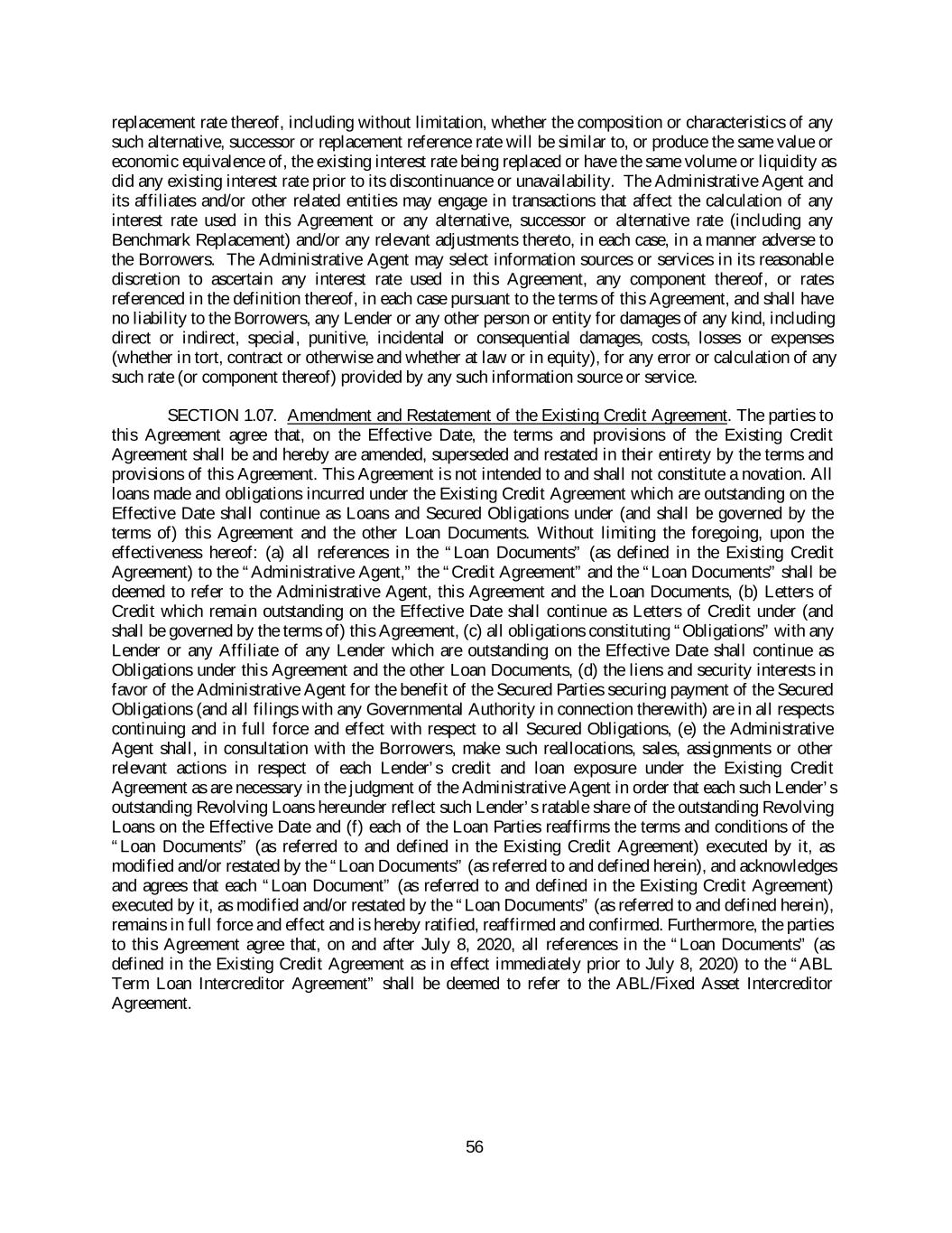 replacement rate thereof, including without limitation, whether the composition or characteristics of any such alternative, successor or replacement reference rate will be similar to, or produce the same value or economic equivalence of, the existing interest rate being replaced or have the same volume or liquidity as did any existing interest rate prior to its discontinuance or unavailability. The Administrative Agent and its affiliates and/or other related entities may engage in transactions that affect the calculation of any interest rate used in this Agreement or any alternative, successor or alternative rate (including any Benchmark Replacement) and/or any relevant adjustments thereto, in each case, in a manner adverse to the Borrowers. The Administrative Agent may select information sources or services in its reasonable discretion to ascertain any interest rate used in this Agreement, any component thereof, or rates referenced in the definition thereof, in each case pursuant to the terms of this Agreement, and shall have no liability to the Borrowers, any Lender or any other person or entity for damages of any kind, including direct or indirect, special, punitive, incidental or consequential damages, costs, losses or expenses (whether in tort, contract or otherwise and whether at law or in equity), for any error or calculation of any such rate (or component thereof) provided by any such information source or service. SECTION 1.07. Amendment and Restatement of the Existing Credit Agreement. The parties to this Agreement agree that, on the Effective Date, the terms and provisions of the Existing Credit Agreement shall be and hereby are amended, superseded and restated in their entirety by the terms and provisions of this Agreement. This Agreement is not intended to and shall not constitute a novation. All loans made and obligations incurred under the Existing Credit Agreement which are outstanding on the Effective Date shall continue as Loans and Secured Obligations under (and shall be governed by the terms of) this Agreement and the other Loan Documents. Without limiting the foregoing, upon the effectiveness hereof: (a) all references in the “Loan Documents” (as defined in the Existing Credit Agreement) to the “Administrative Agent,” the “Credit Agreement” and the “Loan Documents” shall be deemed to refer to the Administrative Agent, this Agreement and the Loan Documents, (b) Letters of Credit which remain outstanding on the Effective Date shall continue as Letters of Credit under (and shall be governed by the terms of) this Agreement, (c) all obligations constituting “Obligations” with any Lender or any Affiliate of any Lender which are outstanding on the Effective Date shall continue as Obligations under this Agreement and the other Loan Documents, (d) the liens and security interests in favor of the Administrative Agent for the benefit of the Secured Parties securing payment of the Secured Obligations (and all filings with any Governmental Authority in connection therewith) are in all respects continuing and in full force and effect with respect to all Secured Obligations, (e) the Administrative Agent shall, in consultation with the Borrowers, make such reallocations, sales, assignments or other relevant actions in respect of each Lender’s credit and loan exposure under the Existing Credit Agreement as are necessary in the judgment of the Administrative Agent in order that each such Lender’s outstanding Revolving Loans hereunder reflect such Lender’s ratable share of the outstanding Revolving Loans on the Effective Date and (f) each of the Loan Parties reaffirms the terms and conditions of the “Loan Documents” (as referred to and defined in the Existing Credit Agreement) executed by it, as modified and/or restated by the “Loan Documents” (as referred to and defined herein), and acknowledges and agrees that each “Loan Document” (as referred to and defined in the Existing Credit Agreement) executed by it, as modified and/or restated by the “Loan Documents” (as referred to and defined herein), remains in full force and effect and is hereby ratified, reaffirmed and confirmed. Furthermore, the parties to this Agreement agree that, on and after July 8, 2020, all references in the “Loan Documents” (as defined in the Existing Credit Agreement as in effect immediately prior to July 8, 2020) to the “ABL Term Loan Intercreditor Agreement” shall be deemed to refer to the ABL/Fixed Asset Intercreditor Agreement. 56