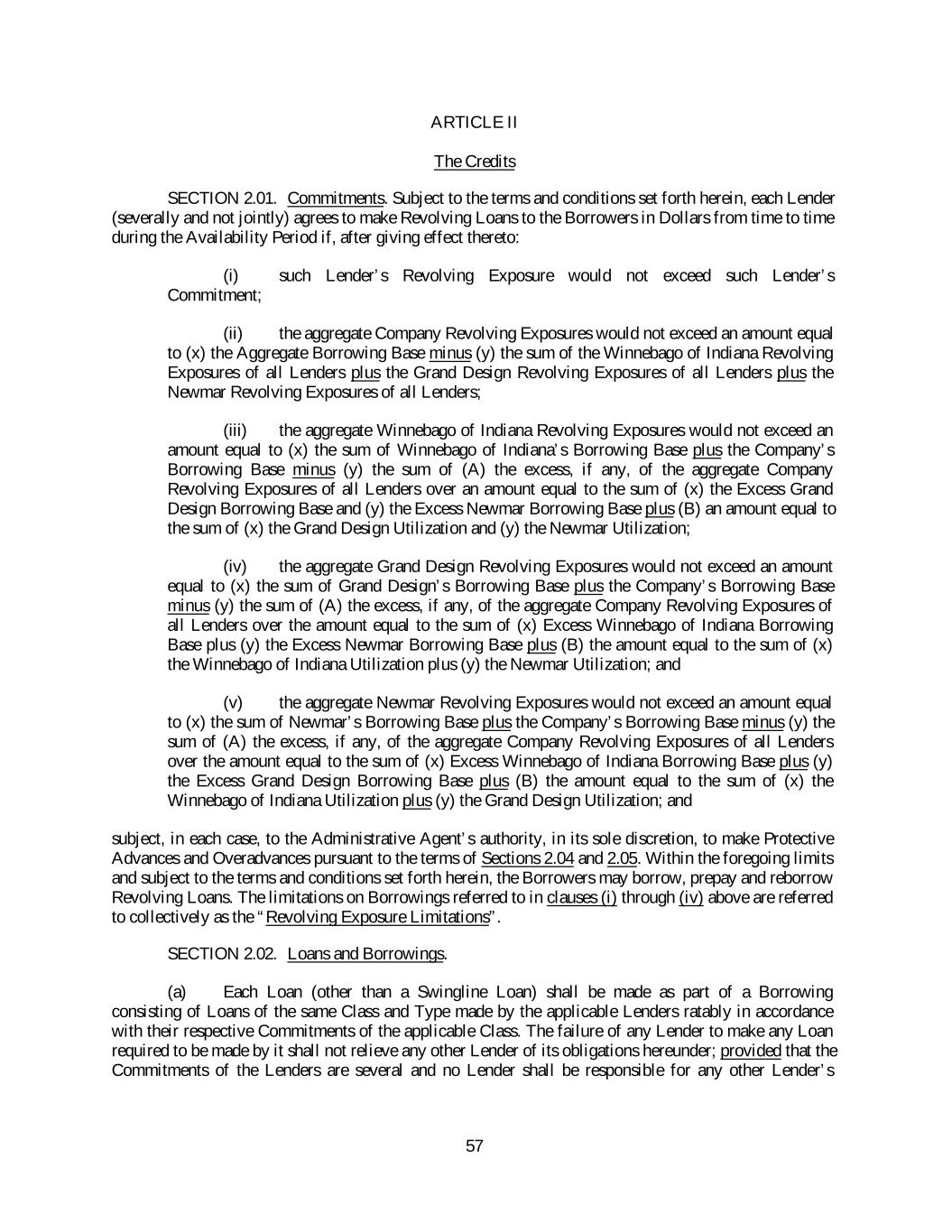 ARTICLE II The Credits SECTION 2.01. Commitments. Subject to the terms and conditions set forth herein, each Lender (severally and not jointly) agrees to make Revolving Loans to the Borrowers in Dollars from time to time during the Availability Period if, after giving effect thereto: (i) such Lender’s Revolving Exposure would not exceed such Lender’s Commitment; (ii) the aggregate Company Revolving Exposures would not exceed an amount equal to (x) the Aggregate Borrowing Base minus (y) the sum of the Winnebago of Indiana Revolving Exposures of all Lenders plus the Grand Design Revolving Exposures of all Lenders plus the Newmar Revolving Exposures of all Lenders; (iii) the aggregate Winnebago of Indiana Revolving Exposures would not exceed an amount equal to (x) the sum of Winnebago of Indiana’s Borrowing Base plus the Company’s Borrowing Base minus (y) the sum of (A) the excess, if any, of the aggregate Company Revolving Exposures of all Lenders over an amount equal to the sum of (x) the Excess Grand Design Borrowing Base and (y) the Excess Newmar Borrowing Base plus (B) an amount equal to the sum of (x) the Grand Design Utilization and (y) the Newmar Utilization; (iv) the aggregate Grand Design Revolving Exposures would not exceed an amount equal to (x) the sum of Grand Design’s Borrowing Base plus the Company’s Borrowing Base minus (y) the sum of (A) the excess, if any, of the aggregate Company Revolving Exposures of all Lenders over the amount equal to the sum of (x) Excess Winnebago of Indiana Borrowing Base plus (y) the Excess Newmar Borrowing Base plus (B) the amount equal to the sum of (x) the Winnebago of Indiana Utilization plus (y) the Newmar Utilization; and (v) the aggregate Newmar Revolving Exposures would not exceed an amount equal to (x) the sum of Newmar’s Borrowing Base plus the Company’s Borrowing Base minus (y) the sum of (A) the excess, if any, of the aggregate Company Revolving Exposures of all Lenders over the amount equal to the sum of (x) Excess Winnebago of Indiana Borrowing Base plus (y) the Excess Grand Design Borrowing Base plus (B) the amount equal to the sum of (x) the Winnebago of Indiana Utilization plus (y) the Grand Design Utilization; and subject, in each case, to the Administrative Agent’s authority, in its sole discretion, to make Protective Advances and Overadvances pursuant to the terms of Sections 2.04 and 2.05. Within the foregoing limits and subject to the terms and conditions set forth herein, the Borrowers may borrow, prepay and reborrow Revolving Loans. The limitations on Borrowings referred to in clauses (i) through (iv) above are referred to collectively as the “Revolving Exposure Limitations”. SECTION 2.02. Loans and Borrowings. (a) Each Loan (other than a Swingline Loan) shall be made as part of a Borrowing consisting of Loans of the same Class and Type made by the applicable Lenders ratably in accordance with their respective Commitments of the applicable Class. The failure of any Lender to make any Loan required to be made by it shall not relieve any other Lender of its obligations hereunder; provided that the Commitments of the Lenders are several and no Lender shall be responsible for any other Lender’s 57