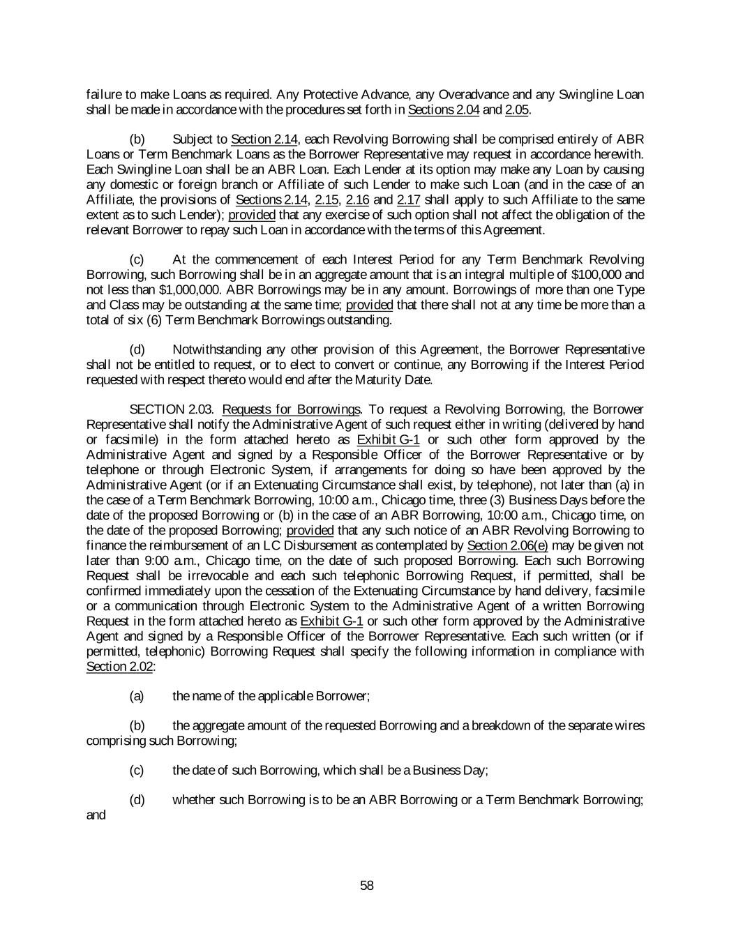 failure to make Loans as required. Any Protective Advance, any Overadvance and any Swingline Loan shall be made in accordance with the procedures set forth in Sections 2.04 and 2.05. (b) Subject to Section 2.14, each Revolving Borrowing shall be comprised entirely of ABR Loans or Term Benchmark Loans as the Borrower Representative may request in accordance herewith. Each Swingline Loan shall be an ABR Loan. Each Lender at its option may make any Loan by causing any domestic or foreign branch or Affiliate of such Lender to make such Loan (and in the case of an Affiliate, the provisions of Sections 2.14, 2.15, 2.16 and 2.17 shall apply to such Affiliate to the same extent as to such Lender); provided that any exercise of such option shall not affect the obligation of the relevant Borrower to repay such Loan in accordance with the terms of this Agreement. (c) At the commencement of each Interest Period for any Term Benchmark Revolving Borrowing, such Borrowing shall be in an aggregate amount that is an integral multiple of $100,000 and not less than $1,000,000. ABR Borrowings may be in any amount. Borrowings of more than one Type and Class may be outstanding at the same time; provided that there shall not at any time be more than a total of six (6) Term Benchmark Borrowings outstanding. (d) Notwithstanding any other provision of this Agreement, the Borrower Representative shall not be entitled to request, or to elect to convert or continue, any Borrowing if the Interest Period requested with respect thereto would end after the Maturity Date. SECTION 2.03. Requests for Borrowings. To request a Revolving Borrowing, the Borrower Representative shall notify the Administrative Agent of such request either in writing (delivered by hand or facsimile) in the form attached hereto as Exhibit G-1 or such other form approved by the Administrative Agent and signed by a Responsible Officer of the Borrower Representative or by telephone or through Electronic System, if arrangements for doing so have been approved by the Administrative Agent (or if an Extenuating Circumstance shall exist, by telephone), not later than (a) in the case of a Term Benchmark Borrowing, 10:00 a.m., Chicago time, three (3) Business Days before the date of the proposed Borrowing or (b) in the case of an ABR Borrowing, 10:00 a.m., Chicago time, on the date of the proposed Borrowing; provided that any such notice of an ABR Revolving Borrowing to finance the reimbursement of an LC Disbursement as contemplated by Section 2.06(e) may be given not later than 9:00 a.m., Chicago time, on the date of such proposed Borrowing. Each such Borrowing Request shall be irrevocable and each such telephonic Borrowing Request, if permitted, shall be confirmed immediately upon the cessation of the Extenuating Circumstance by hand delivery, facsimile or a communication through Electronic System to the Administrative Agent of a written Borrowing Request in the form attached hereto as Exhibit G-1 or such other form approved by the Administrative Agent and signed by a Responsible Officer of the Borrower Representative. Each such written (or if permitted, telephonic) Borrowing Request shall specify the following information in compliance with Section 2.02: (a) the name of the applicable Borrower; (b) the aggregate amount of the requested Borrowing and a breakdown of the separate wires comprising such Borrowing; (c) the date of such Borrowing, which shall be a Business Day; (d) whether such Borrowing is to be an ABR Borrowing or a Term Benchmark Borrowing; and 58