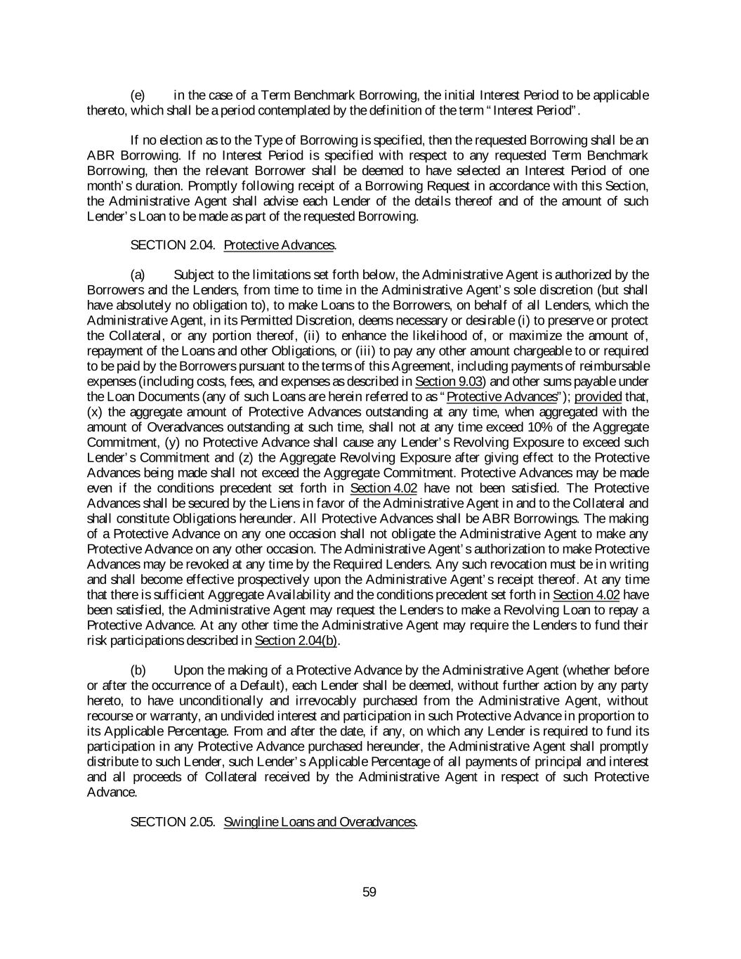 (e) in the case of a Term Benchmark Borrowing, the initial Interest Period to be applicable thereto, which shall be a period contemplated by the definition of the term “Interest Period”. If no election as to the Type of Borrowing is specified, then the requested Borrowing shall be an ABR Borrowing. If no Interest Period is specified with respect to any requested Term Benchmark Borrowing, then the relevant Borrower shall be deemed to have selected an Interest Period of one month’s duration. Promptly following receipt of a Borrowing Request in accordance with this Section, the Administrative Agent shall advise each Lender of the details thereof and of the amount of such Lender’s Loan to be made as part of the requested Borrowing. SECTION 2.04. Protective Advances. (a) Subject to the limitations set forth below, the Administrative Agent is authorized by the Borrowers and the Lenders, from time to time in the Administrative Agent’s sole discretion (but shall have absolutely no obligation to), to make Loans to the Borrowers, on behalf of all Lenders, which the Administrative Agent, in its Permitted Discretion, deems necessary or desirable (i) to preserve or protect the Collateral, or any portion thereof, (ii) to enhance the likelihood of, or maximize the amount of, repayment of the Loans and other Obligations, or (iii) to pay any other amount chargeable to or required to be paid by the Borrowers pursuant to the terms of this Agreement, including payments of reimbursable expenses (including costs, fees, and expenses as described in Section 9.03) and other sums payable under the Loan Documents (any of such Loans are herein referred to as “Protective Advances”); provided that, (x) the aggregate amount of Protective Advances outstanding at any time, when aggregated with the amount of Overadvances outstanding at such time, shall not at any time exceed 10% of the Aggregate Commitment, (y) no Protective Advance shall cause any Lender’s Revolving Exposure to exceed such Lender’s Commitment and (z) the Aggregate Revolving Exposure after giving effect to the Protective Advances being made shall not exceed the Aggregate Commitment. Protective Advances may be made even if the conditions precedent set forth in Section 4.02 have not been satisfied. The Protective Advances shall be secured by the Liens in favor of the Administrative Agent in and to the Collateral and shall constitute Obligations hereunder. All Protective Advances shall be ABR Borrowings. The making of a Protective Advance on any one occasion shall not obligate the Administrative Agent to make any Protective Advance on any other occasion. The Administrative Agent’s authorization to make Protective Advances may be revoked at any time by the Required Lenders. Any such revocation must be in writing and shall become effective prospectively upon the Administrative Agent’s receipt thereof. At any time that there is sufficient Aggregate Availability and the conditions precedent set forth in Section 4.02 have been satisfied, the Administrative Agent may request the Lenders to make a Revolving Loan to repay a Protective Advance. At any other time the Administrative Agent may require the Lenders to fund their risk participations described in Section 2.04(b). (b) Upon the making of a Protective Advance by the Administrative Agent (whether before or after the occurrence of a Default), each Lender shall be deemed, without further action by any party hereto, to have unconditionally and irrevocably purchased from the Administrative Agent, without recourse or warranty, an undivided interest and participation in such Protective Advance in proportion to its Applicable Percentage. From and after the date, if any, on which any Lender is required to fund its participation in any Protective Advance purchased hereunder, the Administrative Agent shall promptly distribute to such Lender, such Lender’s Applicable Percentage of all payments of principal and interest and all proceeds of Collateral received by the Administrative Agent in respect of such Protective Advance. SECTION 2.05. Swingline Loans and Overadvances. 59