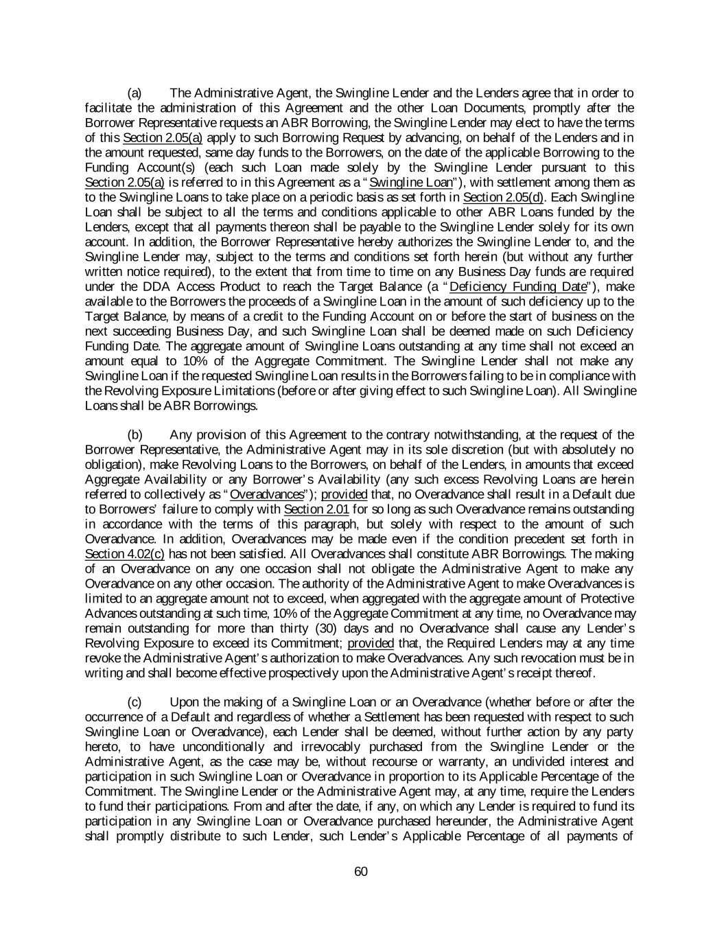 (a) The Administrative Agent, the Swingline Lender and the Lenders agree that in order to facilitate the administration of this Agreement and the other Loan Documents, promptly after the Borrower Representative requests an ABR Borrowing, the Swingline Lender may elect to have the terms of this Section 2.05(a) apply to such Borrowing Request by advancing, on behalf of the Lenders and in the amount requested, same day funds to the Borrowers, on the date of the applicable Borrowing to the Funding Account(s) (each such Loan made solely by the Swingline Lender pursuant to this Section 2.05(a) is referred to in this Agreement as a “Swingline Loan”), with settlement among them as to the Swingline Loans to take place on a periodic basis as set forth in Section 2.05(d). Each Swingline Loan shall be subject to all the terms and conditions applicable to other ABR Loans funded by the Lenders, except that all payments thereon shall be payable to the Swingline Lender solely for its own account. In addition, the Borrower Representative hereby authorizes the Swingline Lender to, and the Swingline Lender may, subject to the terms and conditions set forth herein (but without any further written notice required), to the extent that from time to time on any Business Day funds are required under the DDA Access Product to reach the Target Balance (a “Deficiency Funding Date”), make available to the Borrowers the proceeds of a Swingline Loan in the amount of such deficiency up to the Target Balance, by means of a credit to the Funding Account on or before the start of business on the next succeeding Business Day, and such Swingline Loan shall be deemed made on such Deficiency Funding Date. The aggregate amount of Swingline Loans outstanding at any time shall not exceed an amount equal to 10% of the Aggregate Commitment. The Swingline Lender shall not make any Swingline Loan if the requested Swingline Loan results in the Borrowers failing to be in compliance with the Revolving Exposure Limitations (before or after giving effect to such Swingline Loan). All Swingline Loans shall be ABR Borrowings. (b) Any provision of this Agreement to the contrary notwithstanding, at the request of the Borrower Representative, the Administrative Agent may in its sole discretion (but with absolutely no obligation), make Revolving Loans to the Borrowers, on behalf of the Lenders, in amounts that exceed Aggregate Availability or any Borrower’s Availability (any such excess Revolving Loans are herein referred to collectively as “Overadvances”); provided that, no Overadvance shall result in a Default due to Borrowers’ failure to comply with Section 2.01 for so long as such Overadvance remains outstanding in accordance with the terms of this paragraph, but solely with respect to the amount of such Overadvance. In addition, Overadvances may be made even if the condition precedent set forth in Section 4.02(c) has not been satisfied. All Overadvances shall constitute ABR Borrowings. The making of an Overadvance on any one occasion shall not obligate the Administrative Agent to make any Overadvance on any other occasion. The authority of the Administrative Agent to make Overadvances is limited to an aggregate amount not to exceed, when aggregated with the aggregate amount of Protective Advances outstanding at such time, 10% of the Aggregate Commitment at any time, no Overadvance may remain outstanding for more than thirty (30) days and no Overadvance shall cause any Lender’s Revolving Exposure to exceed its Commitment; provided that, the Required Lenders may at any time revoke the Administrative Agent’s authorization to make Overadvances. Any such revocation must be in writing and shall become effective prospectively upon the Administrative Agent’s receipt thereof. (c) Upon the making of a Swingline Loan or an Overadvance (whether before or after the occurrence of a Default and regardless of whether a Settlement has been requested with respect to such Swingline Loan or Overadvance), each Lender shall be deemed, without further action by any party hereto, to have unconditionally and irrevocably purchased from the Swingline Lender or the Administrative Agent, as the case may be, without recourse or warranty, an undivided interest and participation in such Swingline Loan or Overadvance in proportion to its Applicable Percentage of the Commitment. The Swingline Lender or the Administrative Agent may, at any time, require the Lenders to fund their participations. From and after the date, if any, on which any Lender is required to fund its participation in any Swingline Loan or Overadvance purchased hereunder, the Administrative Agent shall promptly distribute to such Lender, such Lender’s Applicable Percentage of all payments of 60