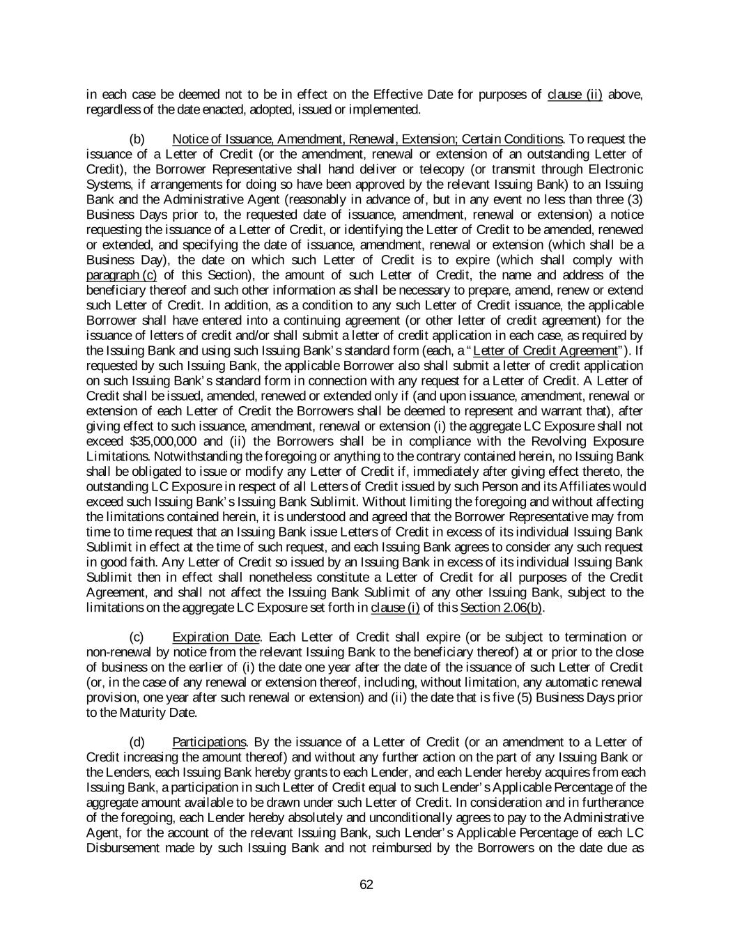 in each case be deemed not to be in effect on the Effective Date for purposes of clause (ii) above, regardless of the date enacted, adopted, issued or implemented. (b) Notice of Issuance, Amendment, Renewal, Extension; Certain Conditions. To request the issuance of a Letter of Credit (or the amendment, renewal or extension of an outstanding Letter of Credit), the Borrower Representative shall hand deliver or telecopy (or transmit through Electronic Systems, if arrangements for doing so have been approved by the relevant Issuing Bank) to an Issuing Bank and the Administrative Agent (reasonably in advance of, but in any event no less than three (3) Business Days prior to, the requested date of issuance, amendment, renewal or extension) a notice requesting the issuance of a Letter of Credit, or identifying the Letter of Credit to be amended, renewed or extended, and specifying the date of issuance, amendment, renewal or extension (which shall be a Business Day), the date on which such Letter of Credit is to expire (which shall comply with paragraph (c) of this Section), the amount of such Letter of Credit, the name and address of the beneficiary thereof and such other information as shall be necessary to prepare, amend, renew or extend such Letter of Credit. In addition, as a condition to any such Letter of Credit issuance, the applicable Borrower shall have entered into a continuing agreement (or other letter of credit agreement) for the issuance of letters of credit and/or shall submit a letter of credit application in each case, as required by the Issuing Bank and using such Issuing Bank’s standard form (each, a “Letter of Credit Agreement”). If requested by such Issuing Bank, the applicable Borrower also shall submit a letter of credit application on such Issuing Bank’s standard form in connection with any request for a Letter of Credit. A Letter of Credit shall be issued, amended, renewed or extended only if (and upon issuance, amendment, renewal or extension of each Letter of Credit the Borrowers shall be deemed to represent and warrant that), after giving effect to such issuance, amendment, renewal or extension (i) the aggregate LC Exposure shall not exceed $35,000,000 and (ii) the Borrowers shall be in compliance with the Revolving Exposure Limitations. Notwithstanding the foregoing or anything to the contrary contained herein, no Issuing Bank shall be obligated to issue or modify any Letter of Credit if, immediately after giving effect thereto, the outstanding LC Exposure in respect of all Letters of Credit issued by such Person and its Affiliates would exceed such Issuing Bank’s Issuing Bank Sublimit. Without limiting the foregoing and without affecting the limitations contained herein, it is understood and agreed that the Borrower Representative may from time to time request that an Issuing Bank issue Letters of Credit in excess of its individual Issuing Bank Sublimit in effect at the time of such request, and each Issuing Bank agrees to consider any such request in good faith. Any Letter of Credit so issued by an Issuing Bank in excess of its individual Issuing Bank Sublimit then in effect shall nonetheless constitute a Letter of Credit for all purposes of the Credit Agreement, and shall not affect the Issuing Bank Sublimit of any other Issuing Bank, subject to the limitations on the aggregate LC Exposure set forth in clause (i) of this Section 2.06(b). (c) Expiration Date. Each Letter of Credit shall expire (or be subject to termination or non-renewal by notice from the relevant Issuing Bank to the beneficiary thereof) at or prior to the close of business on the earlier of (i) the date one year after the date of the issuance of such Letter of Credit (or, in the case of any renewal or extension thereof, including, without limitation, any automatic renewal provision, one year after such renewal or extension) and (ii) the date that is five (5) Business Days prior to the Maturity Date. (d) Participations. By the issuance of a Letter of Credit (or an amendment to a Letter of Credit increasing the amount thereof) and without any further action on the part of any Issuing Bank or the Lenders, each Issuing Bank hereby grants to each Lender, and each Lender hereby acquires from each Issuing Bank, a participation in such Letter of Credit equal to such Lender’s Applicable Percentage of the aggregate amount available to be drawn under such Letter of Credit. In consideration and in furtherance of the foregoing, each Lender hereby absolutely and unconditionally agrees to pay to the Administrative Agent, for the account of the relevant Issuing Bank, such Lender’s Applicable Percentage of each LC Disbursement made by such Issuing Bank and not reimbursed by the Borrowers on the date due as 62