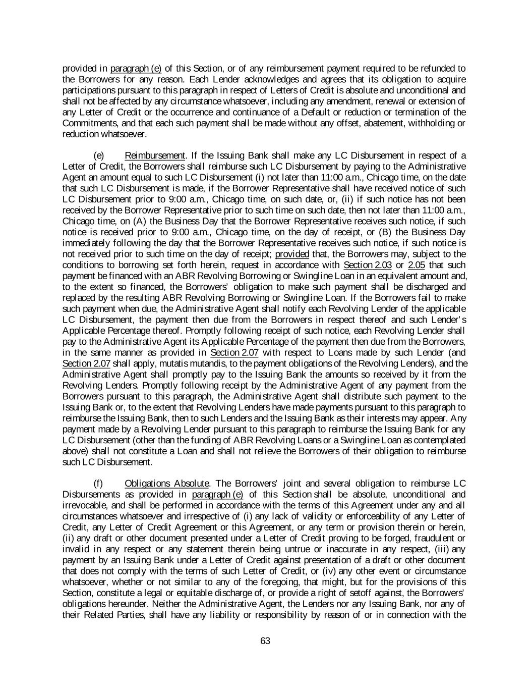 provided in paragraph (e) of this Section, or of any reimbursement payment required to be refunded to the Borrowers for any reason. Each Lender acknowledges and agrees that its obligation to acquire participations pursuant to this paragraph in respect of Letters of Credit is absolute and unconditional and shall not be affected by any circumstance whatsoever, including any amendment, renewal or extension of any Letter of Credit or the occurrence and continuance of a Default or reduction or termination of the Commitments, and that each such payment shall be made without any offset, abatement, withholding or reduction whatsoever. (e) Reimbursement. If the Issuing Bank shall make any LC Disbursement in respect of a Letter of Credit, the Borrowers shall reimburse such LC Disbursement by paying to the Administrative Agent an amount equal to such LC Disbursement (i) not later than 11:00 a.m., Chicago time, on the date that such LC Disbursement is made, if the Borrower Representative shall have received notice of such LC Disbursement prior to 9:00 a.m., Chicago time, on such date, or, (ii) if such notice has not been received by the Borrower Representative prior to such time on such date, then not later than 11:00 a.m., Chicago time, on (A) the Business Day that the Borrower Representative receives such notice, if such notice is received prior to 9:00 a.m., Chicago time, on the day of receipt, or (B) the Business Day immediately following the day that the Borrower Representative receives such notice, if such notice is not received prior to such time on the day of receipt; provided that, the Borrowers may, subject to the conditions to borrowing set forth herein, request in accordance with Section 2.03 or 2.05 that such payment be financed with an ABR Revolving Borrowing or Swingline Loan in an equivalent amount and, to the extent so financed, the Borrowers’ obligation to make such payment shall be discharged and replaced by the resulting ABR Revolving Borrowing or Swingline Loan. If the Borrowers fail to make such payment when due, the Administrative Agent shall notify each Revolving Lender of the applicable LC Disbursement, the payment then due from the Borrowers in respect thereof and such Lender’s Applicable Percentage thereof. Promptly following receipt of such notice, each Revolving Lender shall pay to the Administrative Agent its Applicable Percentage of the payment then due from the Borrowers, in the same manner as provided in Section 2.07 with respect to Loans made by such Lender (and Section 2.07 shall apply, mutatis mutandis, to the payment obligations of the Revolving Lenders), and the Administrative Agent shall promptly pay to the Issuing Bank the amounts so received by it from the Revolving Lenders. Promptly following receipt by the Administrative Agent of any payment from the Borrowers pursuant to this paragraph, the Administrative Agent shall distribute such payment to the Issuing Bank or, to the extent that Revolving Lenders have made payments pursuant to this paragraph to reimburse the Issuing Bank, then to such Lenders and the Issuing Bank as their interests may appear. Any payment made by a Revolving Lender pursuant to this paragraph to reimburse the Issuing Bank for any LC Disbursement (other than the funding of ABR Revolving Loans or a Swingline Loan as contemplated above) shall not constitute a Loan and shall not relieve the Borrowers of their obligation to reimburse such LC Disbursement. (f) Obligations Absolute. The Borrowers’ joint and several obligation to reimburse LC Disbursements as provided in paragraph (e) of this Section shall be absolute, unconditional and irrevocable, and shall be performed in accordance with the terms of this Agreement under any and all circumstances whatsoever and irrespective of (i) any lack of validity or enforceability of any Letter of Credit, any Letter of Credit Agreement or this Agreement, or any term or provision therein or herein, (ii) any draft or other document presented under a Letter of Credit proving to be forged, fraudulent or invalid in any respect or any statement therein being untrue or inaccurate in any respect, (iii) any payment by an Issuing Bank under a Letter of Credit against presentation of a draft or other document that does not comply with the terms of such Letter of Credit, or (iv) any other event or circumstance whatsoever, whether or not similar to any of the foregoing, that might, but for the provisions of this Section, constitute a legal or equitable discharge of, or provide a right of setoff against, the Borrowers’ obligations hereunder. Neither the Administrative Agent, the Lenders nor any Issuing Bank, nor any of their Related Parties, shall have any liability or responsibility by reason of or in connection with the 63