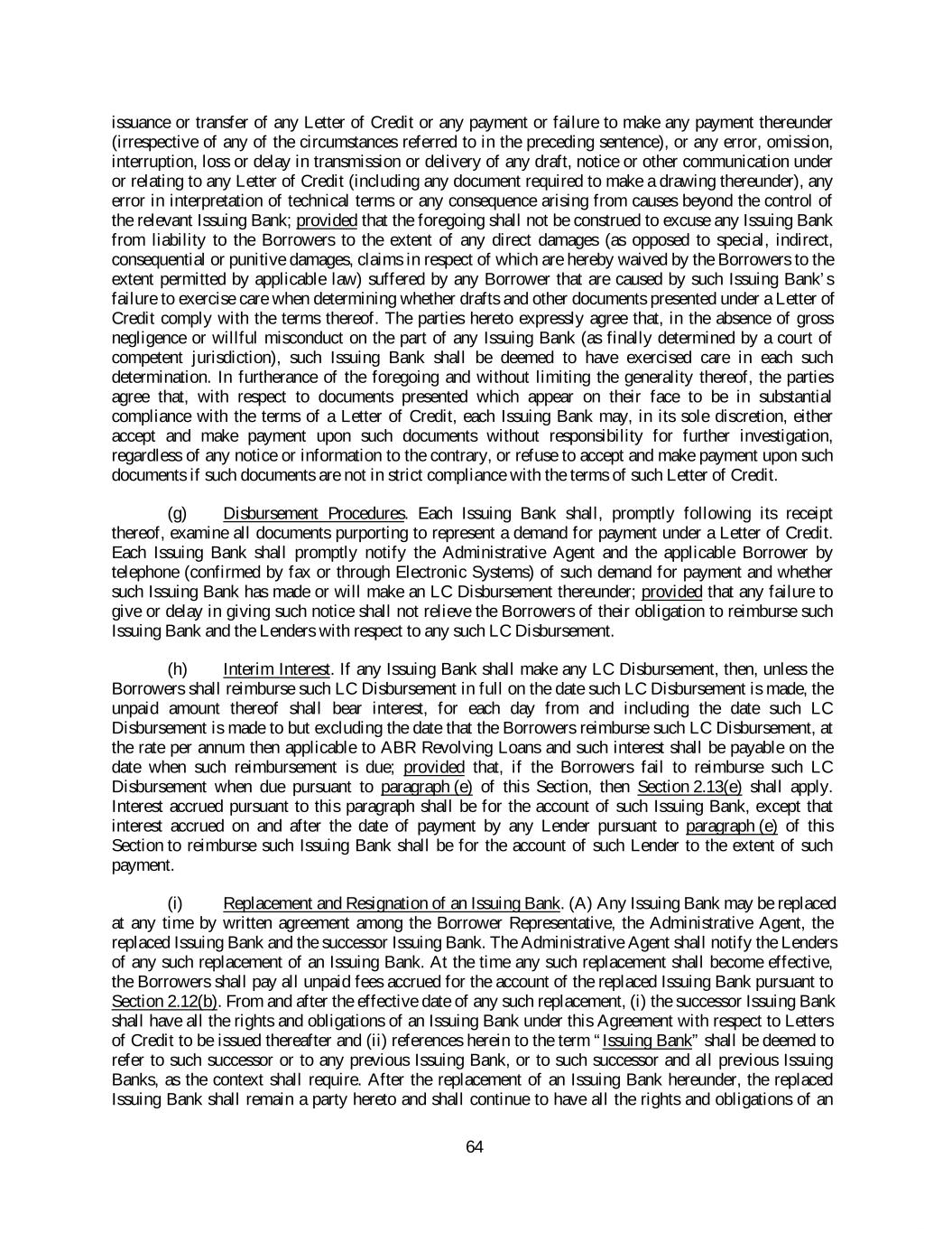 issuance or transfer of any Letter of Credit or any payment or failure to make any payment thereunder (irrespective of any of the circumstances referred to in the preceding sentence), or any error, omission, interruption, loss or delay in transmission or delivery of any draft, notice or other communication under or relating to any Letter of Credit (including any document required to make a drawing thereunder), any error in interpretation of technical terms or any consequence arising from causes beyond the control of the relevant Issuing Bank; provided that the foregoing shall not be construed to excuse any Issuing Bank from liability to the Borrowers to the extent of any direct damages (as opposed to special, indirect, consequential or punitive damages, claims in respect of which are hereby waived by the Borrowers to the extent permitted by applicable law) suffered by any Borrower that are caused by such Issuing Bank’s failure to exercise care when determining whether drafts and other documents presented under a Letter of Credit comply with the terms thereof. The parties hereto expressly agree that, in the absence of gross negligence or willful misconduct on the part of any Issuing Bank (as finally determined by a court of competent jurisdiction), such Issuing Bank shall be deemed to have exercised care in each such determination. In furtherance of the foregoing and without limiting the generality thereof, the parties agree that, with respect to documents presented which appear on their face to be in substantial compliance with the terms of a Letter of Credit, each Issuing Bank may, in its sole discretion, either accept and make payment upon such documents without responsibility for further investigation, regardless of any notice or information to the contrary, or refuse to accept and make payment upon such documents if such documents are not in strict compliance with the terms of such Letter of Credit. (g) Disbursement Procedures. Each Issuing Bank shall, promptly following its receipt thereof, examine all documents purporting to represent a demand for payment under a Letter of Credit. Each Issuing Bank shall promptly notify the Administrative Agent and the applicable Borrower by telephone (confirmed by fax or through Electronic Systems) of such demand for payment and whether such Issuing Bank has made or will make an LC Disbursement thereunder; provided that any failure to give or delay in giving such notice shall not relieve the Borrowers of their obligation to reimburse such Issuing Bank and the Lenders with respect to any such LC Disbursement. (h) Interim Interest. If any Issuing Bank shall make any LC Disbursement, then, unless the Borrowers shall reimburse such LC Disbursement in full on the date such LC Disbursement is made, the unpaid amount thereof shall bear interest, for each day from and including the date such LC Disbursement is made to but excluding the date that the Borrowers reimburse such LC Disbursement, at the rate per annum then applicable to ABR Revolving Loans and such interest shall be payable on the date when such reimbursement is due; provided that, if the Borrowers fail to reimburse such LC Disbursement when due pursuant to paragraph (e) of this Section, then Section 2.13(e) shall apply. Interest accrued pursuant to this paragraph shall be for the account of such Issuing Bank, except that interest accrued on and after the date of payment by any Lender pursuant to paragraph (e) of this Section to reimburse such Issuing Bank shall be for the account of such Lender to the extent of such payment. (i) Replacement and Resignation of an Issuing Bank. (A) Any Issuing Bank may be replaced at any time by written agreement among the Borrower Representative, the Administrative Agent, the replaced Issuing Bank and the successor Issuing Bank. The Administrative Agent shall notify the Lenders of any such replacement of an Issuing Bank. At the time any such replacement shall become effective, the Borrowers shall pay all unpaid fees accrued for the account of the replaced Issuing Bank pursuant to Section 2.12(b). From and after the effective date of any such replacement, (i) the successor Issuing Bank shall have all the rights and obligations of an Issuing Bank under this Agreement with respect to Letters of Credit to be issued thereafter and (ii) references herein to the term “Issuing Bank” shall be deemed to refer to such successor or to any previous Issuing Bank, or to such successor and all previous Issuing Banks, as the context shall require. After the replacement of an Issuing Bank hereunder, the replaced Issuing Bank shall remain a party hereto and shall continue to have all the rights and obligations of an 64