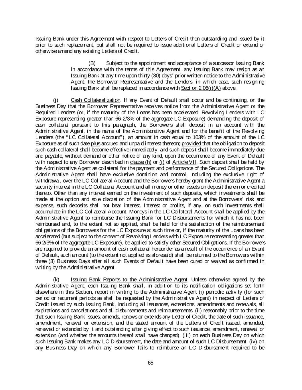 Issuing Bank under this Agreement with respect to Letters of Credit then outstanding and issued by it prior to such replacement, but shall not be required to issue additional Letters of Credit or extend or otherwise amend any existing Letters of Credit. (B) Subject to the appointment and acceptance of a successor Issuing Bank in accordance with the terms of this Agreement, any Issuing Bank may resign as an Issuing Bank at any time upon thirty (30) days’ prior written notice to the Administrative Agent, the Borrower Representative and the Lenders, in which case, such resigning Issuing Bank shall be replaced in accordance with Section 2.06(i)(A) above. (j) Cash Collateralization. If any Event of Default shall occur and be continuing, on the Business Day that the Borrower Representative receives notice from the Administrative Agent or the Required Lenders (or, if the maturity of the Loans has been accelerated, Revolving Lenders with LC Exposure representing greater than 66 2/3% of the aggregate LC Exposure) demanding the deposit of cash collateral pursuant to this paragraph, the Borrowers shall deposit in an account with the Administrative Agent, in the name of the Administrative Agent and for the benefit of the Revolving Lenders (the “LC Collateral Account”), an amount in cash equal to 103% of the amount of the LC Exposure as of such date plus accrued and unpaid interest thereon; provided that the obligation to deposit such cash collateral shall become effective immediately, and such deposit shall become immediately due and payable, without demand or other notice of any kind, upon the occurrence of any Event of Default with respect to any Borrower described in clause (h) or (i) of Article VII. Such deposit shall be held by the Administrative Agent as collateral for the payment and performance of the Secured Obligations. The Administrative Agent shall have exclusive dominion and control, including the exclusive right of withdrawal, over the LC Collateral Account and the Borrowers hereby grant the Administrative Agent a security interest in the LC Collateral Account and all money or other assets on deposit therein or credited thereto. Other than any interest earned on the investment of such deposits, which investments shall be made at the option and sole discretion of the Administrative Agent and at the Borrowers’ risk and expense, such deposits shall not bear interest. Interest or profits, if any, on such investments shall accumulate in the LC Collateral Account. Moneys in the LC Collateral Account shall be applied by the Administrative Agent to reimburse the Issuing Bank for LC Disbursements for which it has not been reimbursed and, to the extent not so applied, shall be held for the satisfaction of the reimbursement obligations of the Borrowers for the LC Exposure at such time or, if the maturity of the Loans has been accelerated (but subject to the consent of Revolving Lenders with LC Exposure representing greater than 66 2/3% of the aggregate LC Exposure), be applied to satisfy other Secured Obligations. If the Borrowers are required to provide an amount of cash collateral hereunder as a result of the occurrence of an Event of Default, such amount (to the extent not applied as aforesaid) shall be returned to the Borrowers within three (3) Business Days after all such Events of Default have been cured or waived as confirmed in writing by the Administrative Agent. (k) Issuing Bank Reports to the Administrative Agent. Unless otherwise agreed by the Administrative Agent, each Issuing Bank shall, in addition to its notification obligations set forth elsewhere in this Section, report in writing to the Administrative Agent (i) periodic activity (for such period or recurrent periods as shall be requested by the Administrative Agent) in respect of Letters of Credit issued by such Issuing Bank, including all issuances, extensions, amendments and renewals, all expirations and cancelations and all disbursements and reimbursements, (ii) reasonably prior to the time that such Issuing Bank issues, amends, renews or extends any Letter of Credit, the date of such issuance, amendment, renewal or extension, and the stated amount of the Letters of Credit issued, amended, renewed or extended by it and outstanding after giving effect to such issuance, amendment, renewal or extension (and whether the amounts thereof shall have changed), (iii) on each Business Day on which such Issuing Bank makes any LC Disbursement, the date and amount of such LC Disbursement, (iv) on any Business Day on which any Borrower fails to reimburse an LC Disbursement required to be 65
