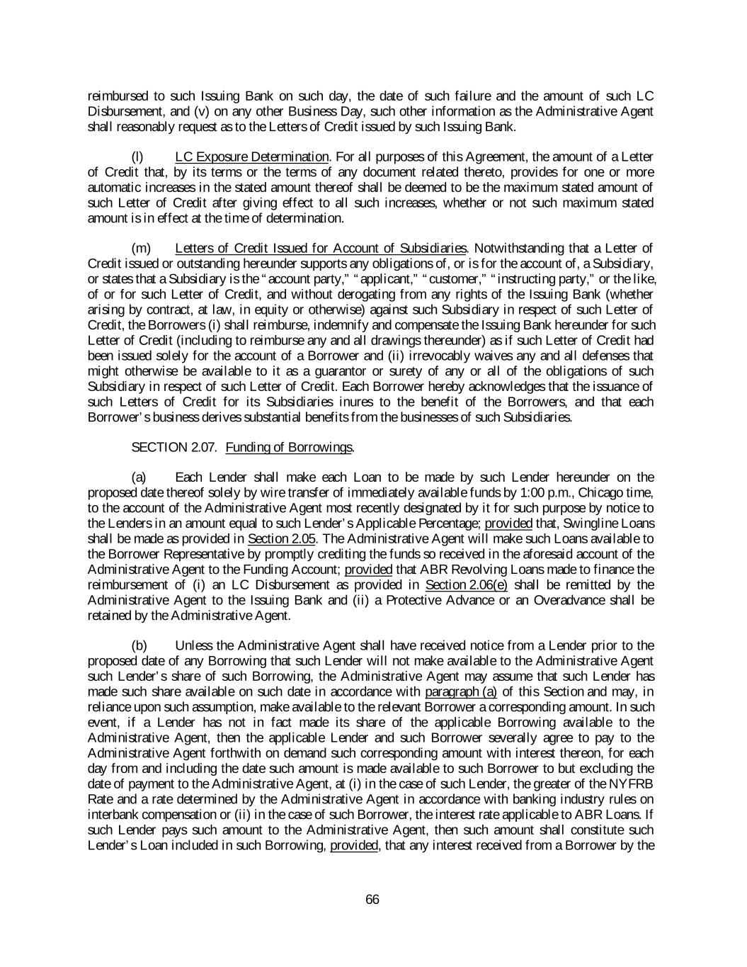 reimbursed to such Issuing Bank on such day, the date of such failure and the amount of such LC Disbursement, and (v) on any other Business Day, such other information as the Administrative Agent shall reasonably request as to the Letters of Credit issued by such Issuing Bank. (l) LC Exposure Determination. For all purposes of this Agreement, the amount of a Letter of Credit that, by its terms or the terms of any document related thereto, provides for one or more automatic increases in the stated amount thereof shall be deemed to be the maximum stated amount of such Letter of Credit after giving effect to all such increases, whether or not such maximum stated amount is in effect at the time of determination. (m) Letters of Credit Issued for Account of Subsidiaries. Notwithstanding that a Letter of Credit issued or outstanding hereunder supports any obligations of, or is for the account of, a Subsidiary, or states that a Subsidiary is the “account party,” “applicant,” “customer,” “instructing party,” or the like, of or for such Letter of Credit, and without derogating from any rights of the Issuing Bank (whether arising by contract, at law, in equity or otherwise) against such Subsidiary in respect of such Letter of Credit, the Borrowers (i) shall reimburse, indemnify and compensate the Issuing Bank hereunder for such Letter of Credit (including to reimburse any and all drawings thereunder) as if such Letter of Credit had been issued solely for the account of a Borrower and (ii) irrevocably waives any and all defenses that might otherwise be available to it as a guarantor or surety of any or all of the obligations of such Subsidiary in respect of such Letter of Credit. Each Borrower hereby acknowledges that the issuance of such Letters of Credit for its Subsidiaries inures to the benefit of the Borrowers, and that each Borrower’s business derives substantial benefits from the businesses of such Subsidiaries. SECTION 2.07. Funding of Borrowings. (a) Each Lender shall make each Loan to be made by such Lender hereunder on the proposed date thereof solely by wire transfer of immediately available funds by 1:00 p.m., Chicago time, to the account of the Administrative Agent most recently designated by it for such purpose by notice to the Lenders in an amount equal to such Lender’s Applicable Percentage; provided that, Swingline Loans shall be made as provided in Section 2.05. The Administrative Agent will make such Loans available to the Borrower Representative by promptly crediting the funds so received in the aforesaid account of the Administrative Agent to the Funding Account; provided that ABR Revolving Loans made to finance the reimbursement of (i) an LC Disbursement as provided in Section 2.06(e) shall be remitted by the Administrative Agent to the Issuing Bank and (ii) a Protective Advance or an Overadvance shall be retained by the Administrative Agent. (b) Unless the Administrative Agent shall have received notice from a Lender prior to the proposed date of any Borrowing that such Lender will not make available to the Administrative Agent such Lender’s share of such Borrowing, the Administrative Agent may assume that such Lender has made such share available on such date in accordance with paragraph (a) of this Section and may, in reliance upon such assumption, make available to the relevant Borrower a corresponding amount. In such event, if a Lender has not in fact made its share of the applicable Borrowing available to the Administrative Agent, then the applicable Lender and such Borrower severally agree to pay to the Administrative Agent forthwith on demand such corresponding amount with interest thereon, for each day from and including the date such amount is made available to such Borrower to but excluding the date of payment to the Administrative Agent, at (i) in the case of such Lender, the greater of the NYFRB Rate and a rate determined by the Administrative Agent in accordance with banking industry rules on interbank compensation or (ii) in the case of such Borrower, the interest rate applicable to ABR Loans. If such Lender pays such amount to the Administrative Agent, then such amount shall constitute such Lender’s Loan included in such Borrowing, provided, that any interest received from a Borrower by the 66