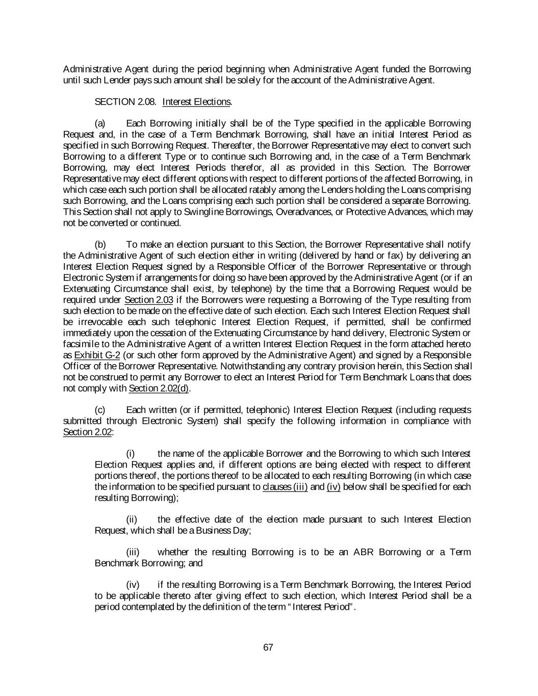 Administrative Agent during the period beginning when Administrative Agent funded the Borrowing until such Lender pays such amount shall be solely for the account of the Administrative Agent. SECTION 2.08. Interest Elections. (a) Each Borrowing initially shall be of the Type specified in the applicable Borrowing Request and, in the case of a Term Benchmark Borrowing, shall have an initial Interest Period as specified in such Borrowing Request. Thereafter, the Borrower Representative may elect to convert such Borrowing to a different Type or to continue such Borrowing and, in the case of a Term Benchmark Borrowing, may elect Interest Periods therefor, all as provided in this Section. The Borrower Representative may elect different options with respect to different portions of the affected Borrowing, in which case each such portion shall be allocated ratably among the Lenders holding the Loans comprising such Borrowing, and the Loans comprising each such portion shall be considered a separate Borrowing. This Section shall not apply to Swingline Borrowings, Overadvances, or Protective Advances, which may not be converted or continued. (b) To make an election pursuant to this Section, the Borrower Representative shall notify the Administrative Agent of such election either in writing (delivered by hand or fax) by delivering an Interest Election Request signed by a Responsible Officer of the Borrower Representative or through Electronic System if arrangements for doing so have been approved by the Administrative Agent (or if an Extenuating Circumstance shall exist, by telephone) by the time that a Borrowing Request would be required under Section 2.03 if the Borrowers were requesting a Borrowing of the Type resulting from such election to be made on the effective date of such election. Each such Interest Election Request shall be irrevocable each such telephonic Interest Election Request, if permitted, shall be confirmed immediately upon the cessation of the Extenuating Circumstance by hand delivery, Electronic System or facsimile to the Administrative Agent of a written Interest Election Request in the form attached hereto as Exhibit G-2 (or such other form approved by the Administrative Agent) and signed by a Responsible Officer of the Borrower Representative. Notwithstanding any contrary provision herein, this Section shall not be construed to permit any Borrower to elect an Interest Period for Term Benchmark Loans that does not comply with Section 2.02(d). (c) Each written (or if permitted, telephonic) Interest Election Request (including requests submitted through Electronic System) shall specify the following information in compliance with Section 2.02: (i) the name of the applicable Borrower and the Borrowing to which such Interest Election Request applies and, if different options are being elected with respect to different portions thereof, the portions thereof to be allocated to each resulting Borrowing (in which case the information to be specified pursuant to clauses (iii) and (iv) below shall be specified for each resulting Borrowing); (ii) the effective date of the election made pursuant to such Interest Election Request, which shall be a Business Day; (iii) whether the resulting Borrowing is to be an ABR Borrowing or a Term Benchmark Borrowing; and (iv) if the resulting Borrowing is a Term Benchmark Borrowing, the Interest Period to be applicable thereto after giving effect to such election, which Interest Period shall be a period contemplated by the definition of the term “Interest Period”. 67