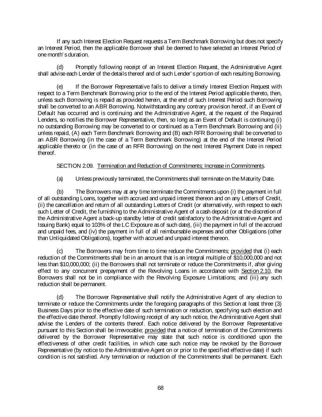 If any such Interest Election Request requests a Term Benchmark Borrowing but does not specify an Interest Period, then the applicable Borrower shall be deemed to have selected an Interest Period of one month’s duration. (d) Promptly following receipt of an Interest Election Request, the Administrative Agent shall advise each Lender of the details thereof and of such Lender’s portion of each resulting Borrowing. (e) If the Borrower Representative fails to deliver a timely Interest Election Request with respect to a Term Benchmark Borrowing prior to the end of the Interest Period applicable thereto, then, unless such Borrowing is repaid as provided herein, at the end of such Interest Period such Borrowing shall be converted to an ABR Borrowing. Notwithstanding any contrary provision hereof, if an Event of Default has occurred and is continuing and the Administrative Agent, at the request of the Required Lenders, so notifies the Borrower Representative, then, so long as an Event of Default is continuing (i) no outstanding Borrowing may be converted to or continued as a Term Benchmark Borrowing and (ii) unless repaid, (A) each Term Benchmark Borrowing and (B) each RFR Borrowing shall be converted to an ABR Borrowing (in the case of a Term Benchmark Borrowing) at the end of the Interest Period applicable thereto or (in the case of an RFR Borrowing) on the next Interest Payment Date in respect thereof. SECTION 2.09. Termination and Reduction of Commitments; Increase in Commitments. (a) Unless previously terminated, the Commitments shall terminate on the Maturity Date. (b) The Borrowers may at any time terminate the Commitments upon (i) the payment in full of all outstanding Loans, together with accrued and unpaid interest thereon and on any Letters of Credit, (ii) the cancellation and return of all outstanding Letters of Credit (or alternatively, with respect to each such Letter of Credit, the furnishing to the Administrative Agent of a cash deposit (or at the discretion of the Administrative Agent a back-up standby letter of credit satisfactory to the Administrative Agent and Issuing Bank) equal to 103% of the LC Exposure as of such date), (iii) the payment in full of the accrued and unpaid fees, and (iv) the payment in full of all reimbursable expenses and other Obligations (other than Unliquidated Obligations), together with accrued and unpaid interest thereon. (c) The Borrowers may from time to time reduce the Commitments; provided that (i) each reduction of the Commitments shall be in an amount that is an integral multiple of $10,000,000 and not less than $10,000,000; (ii) the Borrowers shall not terminate or reduce the Commitments if, after giving effect to any concurrent prepayment of the Revolving Loans in accordance with Section 2.10, the Borrowers shall not be in compliance with the Revolving Exposure Limitations; and (iii) any such reduction shall be permanent. (d) The Borrower Representative shall notify the Administrative Agent of any election to terminate or reduce the Commitments under the foregoing paragraphs of this Section at least three (3) Business Days prior to the effective date of such termination or reduction, specifying such election and the effective date thereof. Promptly following receipt of any such notice, the Administrative Agent shall advise the Lenders of the contents thereof. Each notice delivered by the Borrower Representative pursuant to this Section shall be irrevocable; provided that a notice of termination of the Commitments delivered by the Borrower Representative may state that such notice is conditioned upon the effectiveness of other credit facilities, in which case such notice may be revoked by the Borrower Representative (by notice to the Administrative Agent on or prior to the specified effective date) if such condition is not satisfied. Any termination or reduction of the Commitments shall be permanent. Each 68