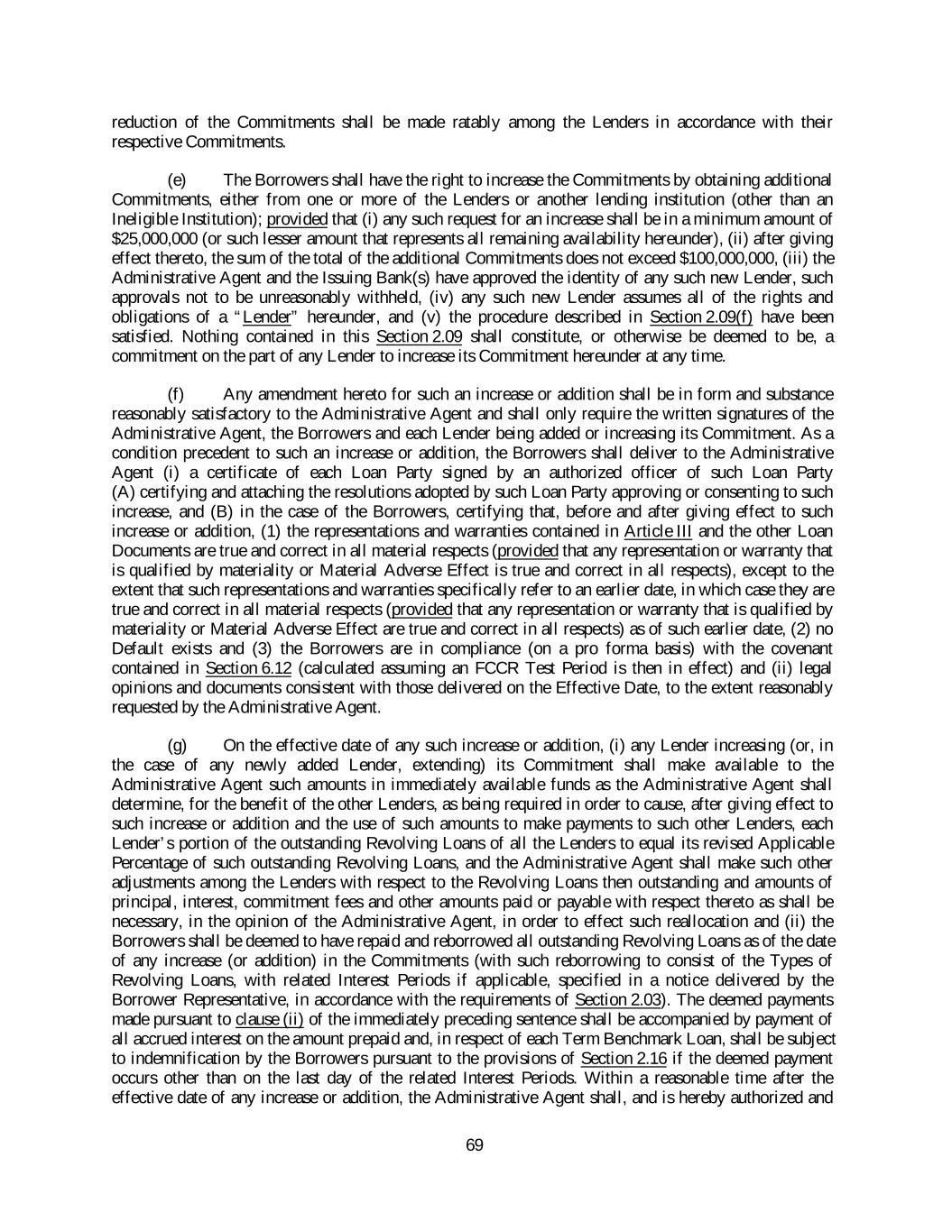 reduction of the Commitments shall be made ratably among the Lenders in accordance with their respective Commitments. (e) The Borrowers shall have the right to increase the Commitments by obtaining additional Commitments, either from one or more of the Lenders or another lending institution (other than an Ineligible Institution); provided that (i) any such request for an increase shall be in a minimum amount of $25,000,000 (or such lesser amount that represents all remaining availability hereunder), (ii) after giving effect thereto, the sum of the total of the additional Commitments does not exceed $100,000,000, (iii) the Administrative Agent and the Issuing Bank(s) have approved the identity of any such new Lender, such approvals not to be unreasonably withheld, (iv) any such new Lender assumes all of the rights and obligations of a “Lender” hereunder, and (v) the procedure described in Section 2.09(f) have been satisfied. Nothing contained in this Section 2.09 shall constitute, or otherwise be deemed to be, a commitment on the part of any Lender to increase its Commitment hereunder at any time. (f) Any amendment hereto for such an increase or addition shall be in form and substance reasonably satisfactory to the Administrative Agent and shall only require the written signatures of the Administrative Agent, the Borrowers and each Lender being added or increasing its Commitment. As a condition precedent to such an increase or addition, the Borrowers shall deliver to the Administrative Agent (i) a certificate of each Loan Party signed by an authorized officer of such Loan Party (A) certifying and attaching the resolutions adopted by such Loan Party approving or consenting to such increase, and (B) in the case of the Borrowers, certifying that, before and after giving effect to such increase or addition, (1) the representations and warranties contained in Article III and the other Loan Documents are true and correct in all material respects (provided that any representation or warranty that is qualified by materiality or Material Adverse Effect is true and correct in all respects), except to the extent that such representations and warranties specifically refer to an earlier date, in which case they are true and correct in all material respects (provided that any representation or warranty that is qualified by materiality or Material Adverse Effect are true and correct in all respects) as of such earlier date, (2) no Default exists and (3) the Borrowers are in compliance (on a pro forma basis) with the covenant contained in Section 6.12 (calculated assuming an FCCR Test Period is then in effect) and (ii) legal opinions and documents consistent with those delivered on the Effective Date, to the extent reasonably requested by the Administrative Agent. (g) On the effective date of any such increase or addition, (i) any Lender increasing (or, in the case of any newly added Lender, extending) its Commitment shall make available to the Administrative Agent such amounts in immediately available funds as the Administrative Agent shall determine, for the benefit of the other Lenders, as being required in order to cause, after giving effect to such increase or addition and the use of such amounts to make payments to such other Lenders, each Lender’s portion of the outstanding Revolving Loans of all the Lenders to equal its revised Applicable Percentage of such outstanding Revolving Loans, and the Administrative Agent shall make such other adjustments among the Lenders with respect to the Revolving Loans then outstanding and amounts of principal, interest, commitment fees and other amounts paid or payable with respect thereto as shall be necessary, in the opinion of the Administrative Agent, in order to effect such reallocation and (ii) the Borrowers shall be deemed to have repaid and reborrowed all outstanding Revolving Loans as of the date of any increase (or addition) in the Commitments (with such reborrowing to consist of the Types of Revolving Loans, with related Interest Periods if applicable, specified in a notice delivered by the Borrower Representative, in accordance with the requirements of Section 2.03). The deemed payments made pursuant to clause (ii) of the immediately preceding sentence shall be accompanied by payment of all accrued interest on the amount prepaid and, in respect of each Term Benchmark Loan, shall be subject to indemnification by the Borrowers pursuant to the provisions of Section 2.16 if the deemed payment occurs other than on the last day of the related Interest Periods. Within a reasonable time after the effective date of any increase or addition, the Administrative Agent shall, and is hereby authorized and 69