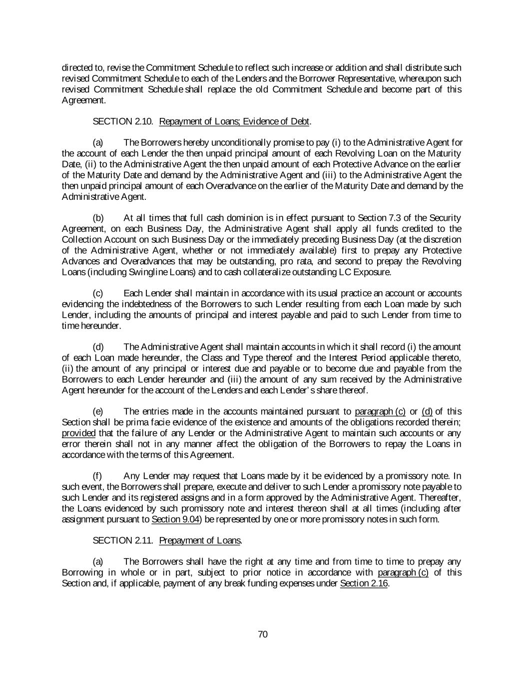 directed to, revise the Commitment Schedule to reflect such increase or addition and shall distribute such revised Commitment Schedule to each of the Lenders and the Borrower Representative, whereupon such revised Commitment Schedule shall replace the old Commitment Schedule and become part of this Agreement. SECTION 2.10. Repayment of Loans; Evidence of Debt. (a) The Borrowers hereby unconditionally promise to pay (i) to the Administrative Agent for the account of each Lender the then unpaid principal amount of each Revolving Loan on the Maturity Date, (ii) to the Administrative Agent the then unpaid amount of each Protective Advance on the earlier of the Maturity Date and demand by the Administrative Agent and (iii) to the Administrative Agent the then unpaid principal amount of each Overadvance on the earlier of the Maturity Date and demand by the Administrative Agent. (b) At all times that full cash dominion is in effect pursuant to Section 7.3 of the Security Agreement, on each Business Day, the Administrative Agent shall apply all funds credited to the Collection Account on such Business Day or the immediately preceding Business Day (at the discretion of the Administrative Agent, whether or not immediately available) first to prepay any Protective Advances and Overadvances that may be outstanding, pro rata, and second to prepay the Revolving Loans (including Swingline Loans) and to cash collateralize outstanding LC Exposure. (c) Each Lender shall maintain in accordance with its usual practice an account or accounts evidencing the indebtedness of the Borrowers to such Lender resulting from each Loan made by such Lender, including the amounts of principal and interest payable and paid to such Lender from time to time hereunder. (d) The Administrative Agent shall maintain accounts in which it shall record (i) the amount of each Loan made hereunder, the Class and Type thereof and the Interest Period applicable thereto, (ii) the amount of any principal or interest due and payable or to become due and payable from the Borrowers to each Lender hereunder and (iii) the amount of any sum received by the Administrative Agent hereunder for the account of the Lenders and each Lender’s share thereof. (e) The entries made in the accounts maintained pursuant to paragraph (c) or (d) of this Section shall be prima facie evidence of the existence and amounts of the obligations recorded therein; provided that the failure of any Lender or the Administrative Agent to maintain such accounts or any error therein shall not in any manner affect the obligation of the Borrowers to repay the Loans in accordance with the terms of this Agreement. (f) Any Lender may request that Loans made by it be evidenced by a promissory note. In such event, the Borrowers shall prepare, execute and deliver to such Lender a promissory note payable to such Lender and its registered assigns and in a form approved by the Administrative Agent. Thereafter, the Loans evidenced by such promissory note and interest thereon shall at all times (including after assignment pursuant to Section 9.04) be represented by one or more promissory notes in such form. SECTION 2.11. Prepayment of Loans. (a) The Borrowers shall have the right at any time and from time to time to prepay any Borrowing in whole or in part, subject to prior notice in accordance with paragraph (c) of this Section and, if applicable, payment of any break funding expenses under Section 2.16. 70