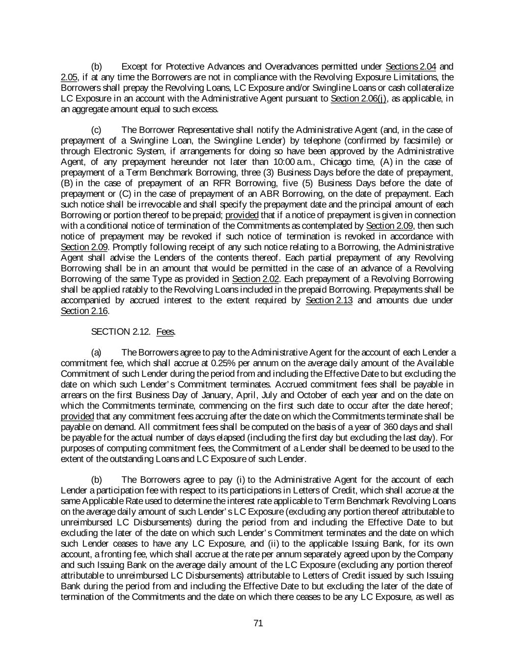 (b) Except for Protective Advances and Overadvances permitted under Sections 2.04 and 2.05, if at any time the Borrowers are not in compliance with the Revolving Exposure Limitations, the Borrowers shall prepay the Revolving Loans, LC Exposure and/or Swingline Loans or cash collateralize LC Exposure in an account with the Administrative Agent pursuant to Section 2.06(j), as applicable, in an aggregate amount equal to such excess. (c) The Borrower Representative shall notify the Administrative Agent (and, in the case of prepayment of a Swingline Loan, the Swingline Lender) by telephone (confirmed by facsimile) or through Electronic System, if arrangements for doing so have been approved by the Administrative Agent, of any prepayment hereunder not later than 10:00 a.m., Chicago time, (A) in the case of prepayment of a Term Benchmark Borrowing, three (3) Business Days before the date of prepayment, (B) in the case of prepayment of an RFR Borrowing, five (5) Business Days before the date of prepayment or (C) in the case of prepayment of an ABR Borrowing, on the date of prepayment. Each such notice shall be irrevocable and shall specify the prepayment date and the principal amount of each Borrowing or portion thereof to be prepaid; provided that if a notice of prepayment is given in connection with a conditional notice of termination of the Commitments as contemplated by Section 2.09, then such notice of prepayment may be revoked if such notice of termination is revoked in accordance with Section 2.09. Promptly following receipt of any such notice relating to a Borrowing, the Administrative Agent shall advise the Lenders of the contents thereof. Each partial prepayment of any Revolving Borrowing shall be in an amount that would be permitted in the case of an advance of a Revolving Borrowing of the same Type as provided in Section 2.02. Each prepayment of a Revolving Borrowing shall be applied ratably to the Revolving Loans included in the prepaid Borrowing. Prepayments shall be accompanied by accrued interest to the extent required by Section 2.13 and amounts due under Section 2.16. SECTION 2.12. Fees. (a) The Borrowers agree to pay to the Administrative Agent for the account of each Lender a commitment fee, which shall accrue at 0.25% per annum on the average daily amount of the Available Commitment of such Lender during the period from and including the Effective Date to but excluding the date on which such Lender’s Commitment terminates. Accrued commitment fees shall be payable in arrears on the first Business Day of January, April, July and October of each year and on the date on which the Commitments terminate, commencing on the first such date to occur after the date hereof; provided that any commitment fees accruing after the date on which the Commitments terminate shall be payable on demand. All commitment fees shall be computed on the basis of a year of 360 days and shall be payable for the actual number of days elapsed (including the first day but excluding the last day). For purposes of computing commitment fees, the Commitment of a Lender shall be deemed to be used to the extent of the outstanding Loans and LC Exposure of such Lender. (b) The Borrowers agree to pay (i) to the Administrative Agent for the account of each Lender a participation fee with respect to its participations in Letters of Credit, which shall accrue at the same Applicable Rate used to determine the interest rate applicable to Term Benchmark Revolving Loans on the average daily amount of such Lender’s LC Exposure (excluding any portion thereof attributable to unreimbursed LC Disbursements) during the period from and including the Effective Date to but excluding the later of the date on which such Lender’s Commitment terminates and the date on which such Lender ceases to have any LC Exposure, and (ii) to the applicable Issuing Bank, for its own account, a fronting fee, which shall accrue at the rate per annum separately agreed upon by the Company and such Issuing Bank on the average daily amount of the LC Exposure (excluding any portion thereof attributable to unreimbursed LC Disbursements) attributable to Letters of Credit issued by such Issuing Bank during the period from and including the Effective Date to but excluding the later of the date of termination of the Commitments and the date on which there ceases to be any LC Exposure, as well as 71