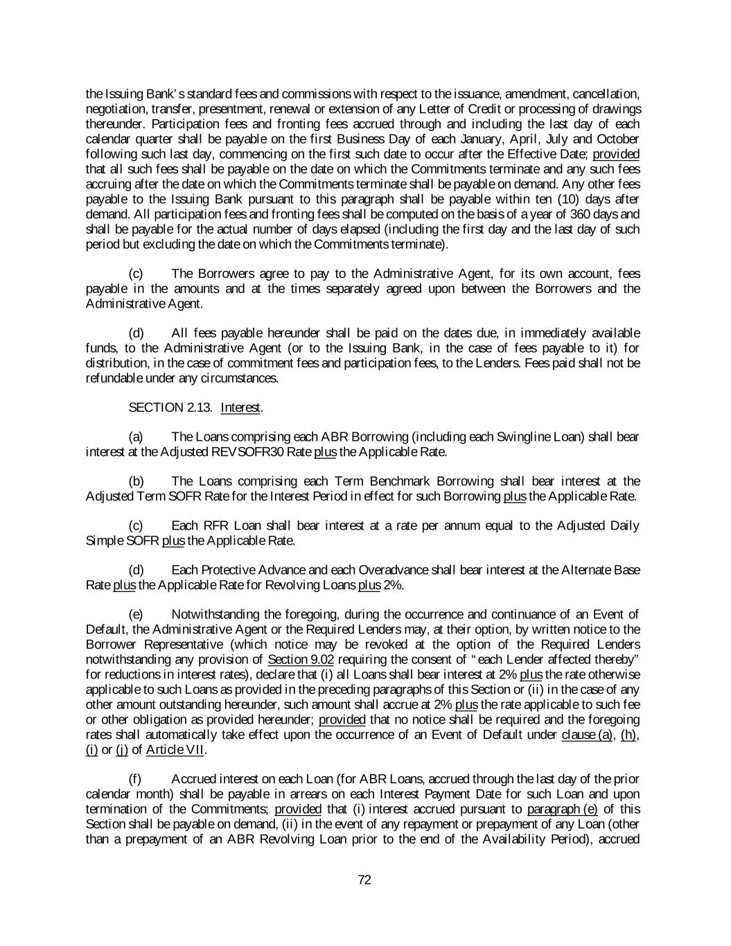 the Issuing Bank’s standard fees and commissions with respect to the issuance, amendment, cancellation, negotiation, transfer, presentment, renewal or extension of any Letter of Credit or processing of drawings thereunder. Participation fees and fronting fees accrued through and including the last day of each calendar quarter shall be payable on the first Business Day of each January, April, July and October following such last day, commencing on the first such date to occur after the Effective Date; provided that all such fees shall be payable on the date on which the Commitments terminate and any such fees accruing after the date on which the Commitments terminate shall be payable on demand. Any other fees payable to the Issuing Bank pursuant to this paragraph shall be payable within ten (10) days after demand. All participation fees and fronting fees shall be computed on the basis of a year of 360 days and shall be payable for the actual number of days elapsed (including the first day and the last day of such period but excluding the date on which the Commitments terminate). (c) The Borrowers agree to pay to the Administrative Agent, for its own account, fees payable in the amounts and at the times separately agreed upon between the Borrowers and the Administrative Agent. (d) All fees payable hereunder shall be paid on the dates due, in immediately available funds, to the Administrative Agent (or to the Issuing Bank, in the case of fees payable to it) for distribution, in the case of commitment fees and participation fees, to the Lenders. Fees paid shall not be refundable under any circumstances. SECTION 2.13. Interest. (a) The Loans comprising each ABR Borrowing (including each Swingline Loan) shall bear interest at the Adjusted REVSOFR30 Rate plus the Applicable Rate. (b) The Loans comprising each Term Benchmark Borrowing shall bear interest at the Adjusted Term SOFR Rate for the Interest Period in effect for such Borrowing plus the Applicable Rate. (c) Each RFR Loan shall bear interest at a rate per annum equal to the Adjusted Daily Simple SOFR plus the Applicable Rate. (d) Each Protective Advance and each Overadvance shall bear interest at the Alternate Base Rate plus the Applicable Rate for Revolving Loans plus 2%. (e) Notwithstanding the foregoing, during the occurrence and continuance of an Event of Default, the Administrative Agent or the Required Lenders may, at their option, by written notice to the Borrower Representative (which notice may be revoked at the option of the Required Lenders notwithstanding any provision of Section 9.02 requiring the consent of “each Lender affected thereby” for reductions in interest rates), declare that (i) all Loans shall bear interest at 2% plus the rate otherwise applicable to such Loans as provided in the preceding paragraphs of this Section or (ii) in the case of any other amount outstanding hereunder, such amount shall accrue at 2% plus the rate applicable to such fee or other obligation as provided hereunder; provided that no notice shall be required and the foregoing rates shall automatically take effect upon the occurrence of an Event of Default under clause (a), (h), (i) or (j) of Article VII. (f) Accrued interest on each Loan (for ABR Loans, accrued through the last day of the prior calendar month) shall be payable in arrears on each Interest Payment Date for such Loan and upon termination of the Commitments; provided that (i) interest accrued pursuant to paragraph (e) of this Section shall be payable on demand, (ii) in the event of any repayment or prepayment of any Loan (other than a prepayment of an ABR Revolving Loan prior to the end of the Availability Period), accrued 72