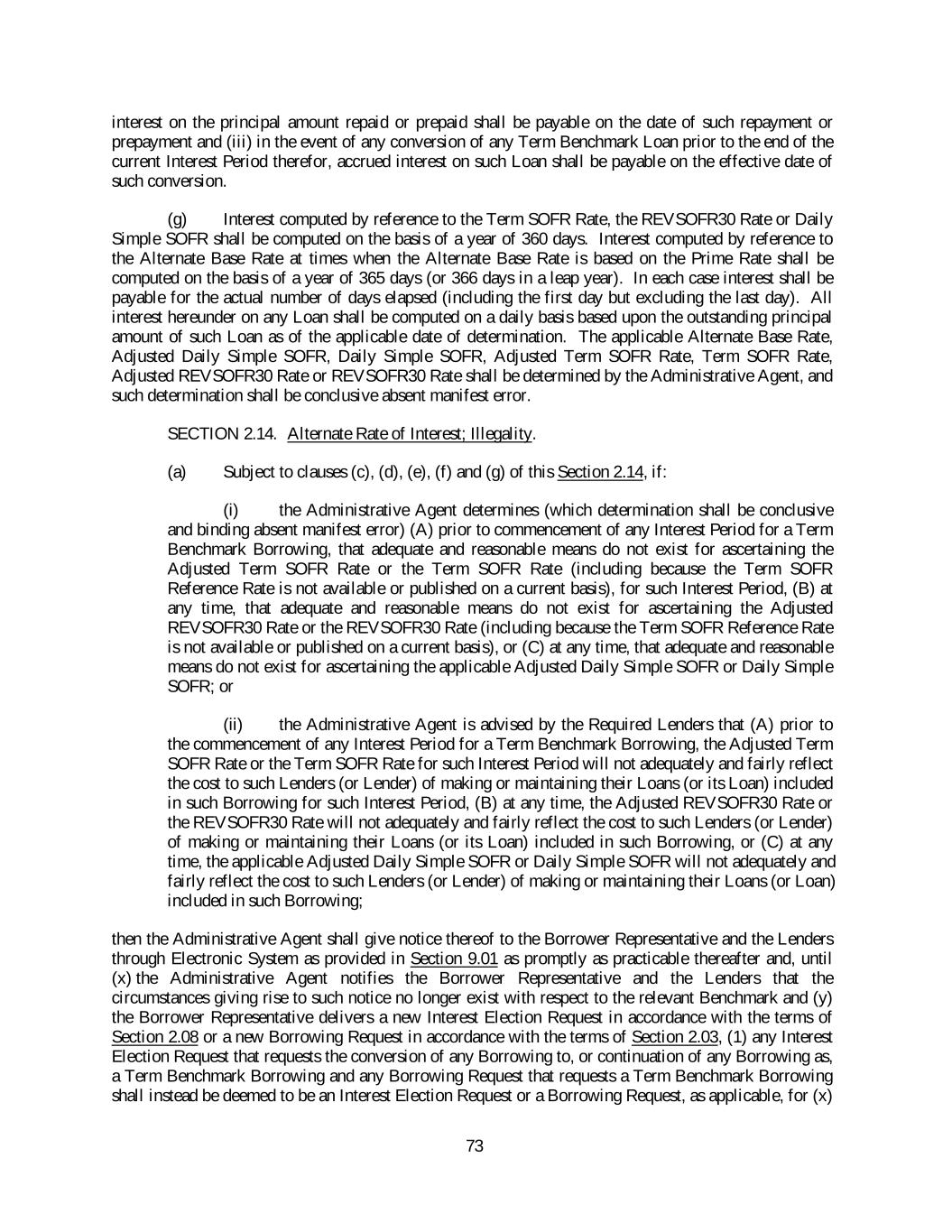 interest on the principal amount repaid or prepaid shall be payable on the date of such repayment or prepayment and (iii) in the event of any conversion of any Term Benchmark Loan prior to the end of the current Interest Period therefor, accrued interest on such Loan shall be payable on the effective date of such conversion. (g) Interest computed by reference to the Term SOFR Rate, the REVSOFR30 Rate or Daily Simple SOFR shall be computed on the basis of a year of 360 days. Interest computed by reference to the Alternate Base Rate at times when the Alternate Base Rate is based on the Prime Rate shall be computed on the basis of a year of 365 days (or 366 days in a leap year). In each case interest shall be payable for the actual number of days elapsed (including the first day but excluding the last day). All interest hereunder on any Loan shall be computed on a daily basis based upon the outstanding principal amount of such Loan as of the applicable date of determination. The applicable Alternate Base Rate, Adjusted Daily Simple SOFR, Daily Simple SOFR, Adjusted Term SOFR Rate, Term SOFR Rate, Adjusted REVSOFR30 Rate or REVSOFR30 Rate shall be determined by the Administrative Agent, and such determination shall be conclusive absent manifest error. SECTION 2.14. Alternate Rate of Interest; Illegality. (a) Subject to clauses (c), (d), (e), (f) and (g) of this Section 2.14, if: (i) the Administrative Agent determines (which determination shall be conclusive and binding absent manifest error) (A) prior to commencement of any Interest Period for a Term Benchmark Borrowing, that adequate and reasonable means do not exist for ascertaining the Adjusted Term SOFR Rate or the Term SOFR Rate (including because the Term SOFR Reference Rate is not available or published on a current basis), for such Interest Period, (B) at any time, that adequate and reasonable means do not exist for ascertaining the Adjusted REVSOFR30 Rate or the REVSOFR30 Rate (including because the Term SOFR Reference Rate is not available or published on a current basis), or (C) at any time, that adequate and reasonable means do not exist for ascertaining the applicable Adjusted Daily Simple SOFR or Daily Simple SOFR; or (ii) the Administrative Agent is advised by the Required Lenders that (A) prior to the commencement of any Interest Period for a Term Benchmark Borrowing, the Adjusted Term SOFR Rate or the Term SOFR Rate for such Interest Period will not adequately and fairly reflect the cost to such Lenders (or Lender) of making or maintaining their Loans (or its Loan) included in such Borrowing for such Interest Period, (B) at any time, the Adjusted REVSOFR30 Rate or the REVSOFR30 Rate will not adequately and fairly reflect the cost to such Lenders (or Lender) of making or maintaining their Loans (or its Loan) included in such Borrowing, or (C) at any time, the applicable Adjusted Daily Simple SOFR or Daily Simple SOFR will not adequately and fairly reflect the cost to such Lenders (or Lender) of making or maintaining their Loans (or Loan) included in such Borrowing; then the Administrative Agent shall give notice thereof to the Borrower Representative and the Lenders through Electronic System as provided in Section 9.01 as promptly as practicable thereafter and, until (x) the Administrative Agent notifies the Borrower Representative and the Lenders that the circumstances giving rise to such notice no longer exist with respect to the relevant Benchmark and (y) the Borrower Representative delivers a new Interest Election Request in accordance with the terms of Section 2.08 or a new Borrowing Request in accordance with the terms of Section 2.03, (1) any Interest Election Request that requests the conversion of any Borrowing to, or continuation of any Borrowing as, a Term Benchmark Borrowing and any Borrowing Request that requests a Term Benchmark Borrowing shall instead be deemed to be an Interest Election Request or a Borrowing Request, as applicable, for (x) 73