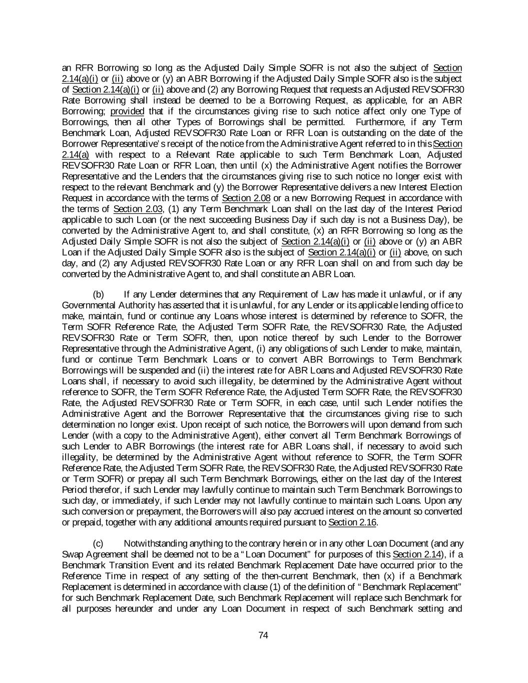 an RFR Borrowing so long as the Adjusted Daily Simple SOFR is not also the subject of Section 2.14(a)(i) or (ii) above or (y) an ABR Borrowing if the Adjusted Daily Simple SOFR also is the subject of Section 2.14(a)(i) or (ii) above and (2) any Borrowing Request that requests an Adjusted REVSOFR30 Rate Borrowing shall instead be deemed to be a Borrowing Request, as applicable, for an ABR Borrowing; provided that if the circumstances giving rise to such notice affect only one Type of Borrowings, then all other Types of Borrowings shall be permitted. Furthermore, if any Term Benchmark Loan, Adjusted REVSOFR30 Rate Loan or RFR Loan is outstanding on the date of the Borrower Representative’s receipt of the notice from the Administrative Agent referred to in this Section 2.14(a) with respect to a Relevant Rate applicable to such Term Benchmark Loan, Adjusted REVSOFR30 Rate Loan or RFR Loan, then until (x) the Administrative Agent notifies the Borrower Representative and the Lenders that the circumstances giving rise to such notice no longer exist with respect to the relevant Benchmark and (y) the Borrower Representative delivers a new Interest Election Request in accordance with the terms of Section 2.08 or a new Borrowing Request in accordance with the terms of Section 2.03, (1) any Term Benchmark Loan shall on the last day of the Interest Period applicable to such Loan (or the next succeeding Business Day if such day is not a Business Day), be converted by the Administrative Agent to, and shall constitute, (x) an RFR Borrowing so long as the Adjusted Daily Simple SOFR is not also the subject of Section 2.14(a)(i) or (ii) above or (y) an ABR Loan if the Adjusted Daily Simple SOFR also is the subject of Section 2.14(a)(i) or (ii) above, on such day, and (2) any Adjusted REVSOFR30 Rate Loan or any RFR Loan shall on and from such day be converted by the Administrative Agent to, and shall constitute an ABR Loan. (b) If any Lender determines that any Requirement of Law has made it unlawful, or if any Governmental Authority has asserted that it is unlawful, for any Lender or its applicable lending office to make, maintain, fund or continue any Loans whose interest is determined by reference to SOFR, the Term SOFR Reference Rate, the Adjusted Term SOFR Rate, the REVSOFR30 Rate, the Adjusted REVSOFR30 Rate or Term SOFR, then, upon notice thereof by such Lender to the Borrower Representative through the Administrative Agent, (i) any obligations of such Lender to make, maintain, fund or continue Term Benchmark Loans or to convert ABR Borrowings to Term Benchmark Borrowings will be suspended and (ii) the interest rate for ABR Loans and Adjusted REVSOFR30 Rate Loans shall, if necessary to avoid such illegality, be determined by the Administrative Agent without reference to SOFR, the Term SOFR Reference Rate, the Adjusted Term SOFR Rate, the REVSOFR30 Rate, the Adjusted REVSOFR30 Rate or Term SOFR, in each case, until such Lender notifies the Administrative Agent and the Borrower Representative that the circumstances giving rise to such determination no longer exist. Upon receipt of such notice, the Borrowers will upon demand from such Lender (with a copy to the Administrative Agent), either convert all Term Benchmark Borrowings of such Lender to ABR Borrowings (the interest rate for ABR Loans shall, if necessary to avoid such illegality, be determined by the Administrative Agent without reference to SOFR, the Term SOFR Reference Rate, the Adjusted Term SOFR Rate, the REVSOFR30 Rate, the Adjusted REVSOFR30 Rate or Term SOFR) or prepay all such Term Benchmark Borrowings, either on the last day of the Interest Period therefor, if such Lender may lawfully continue to maintain such Term Benchmark Borrowings to such day, or immediately, if such Lender may not lawfully continue to maintain such Loans. Upon any such conversion or prepayment, the Borrowers will also pay accrued interest on the amount so converted or prepaid, together with any additional amounts required pursuant to Section 2.16. (c) Notwithstanding anything to the contrary herein or in any other Loan Document (and any Swap Agreement shall be deemed not to be a “Loan Document” for purposes of this Section 2.14), if a Benchmark Transition Event and its related Benchmark Replacement Date have occurred prior to the Reference Time in respect of any setting of the then-current Benchmark, then (x) if a Benchmark Replacement is determined in accordance with clause (1) of the definition of “Benchmark Replacement” for such Benchmark Replacement Date, such Benchmark Replacement will replace such Benchmark for all purposes hereunder and under any Loan Document in respect of such Benchmark setting and 74
