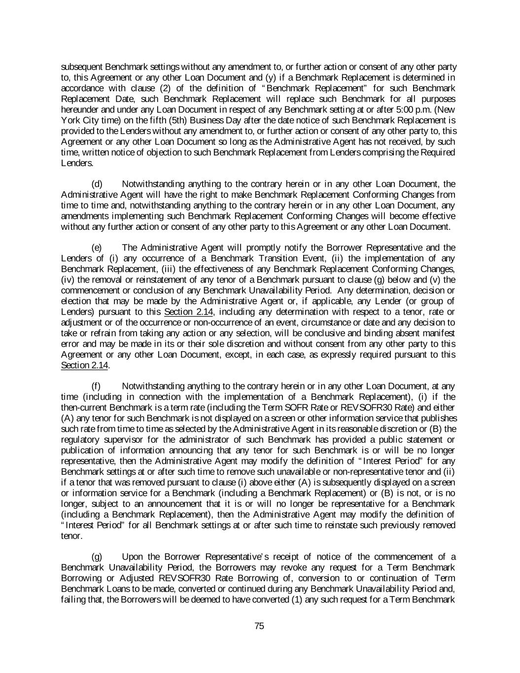 subsequent Benchmark settings without any amendment to, or further action or consent of any other party to, this Agreement or any other Loan Document and (y) if a Benchmark Replacement is determined in accordance with clause (2) of the definition of “Benchmark Replacement” for such Benchmark Replacement Date, such Benchmark Replacement will replace such Benchmark for all purposes hereunder and under any Loan Document in respect of any Benchmark setting at or after 5:00 p.m. (New York City time) on the fifth (5th) Business Day after the date notice of such Benchmark Replacement is provided to the Lenders without any amendment to, or further action or consent of any other party to, this Agreement or any other Loan Document so long as the Administrative Agent has not received, by such time, written notice of objection to such Benchmark Replacement from Lenders comprising the Required Lenders. (d) Notwithstanding anything to the contrary herein or in any other Loan Document, the Administrative Agent will have the right to make Benchmark Replacement Conforming Changes from time to time and, notwithstanding anything to the contrary herein or in any other Loan Document, any amendments implementing such Benchmark Replacement Conforming Changes will become effective without any further action or consent of any other party to this Agreement or any other Loan Document. (e) The Administrative Agent will promptly notify the Borrower Representative and the Lenders of (i) any occurrence of a Benchmark Transition Event, (ii) the implementation of any Benchmark Replacement, (iii) the effectiveness of any Benchmark Replacement Conforming Changes, (iv) the removal or reinstatement of any tenor of a Benchmark pursuant to clause (g) below and (v) the commencement or conclusion of any Benchmark Unavailability Period. Any determination, decision or election that may be made by the Administrative Agent or, if applicable, any Lender (or group of Lenders) pursuant to this Section 2.14, including any determination with respect to a tenor, rate or adjustment or of the occurrence or non-occurrence of an event, circumstance or date and any decision to take or refrain from taking any action or any selection, will be conclusive and binding absent manifest error and may be made in its or their sole discretion and without consent from any other party to this Agreement or any other Loan Document, except, in each case, as expressly required pursuant to this Section 2.14. (f) Notwithstanding anything to the contrary herein or in any other Loan Document, at any time (including in connection with the implementation of a Benchmark Replacement), (i) if the then-current Benchmark is a term rate (including the Term SOFR Rate or REVSOFR30 Rate) and either (A) any tenor for such Benchmark is not displayed on a screen or other information service that publishes such rate from time to time as selected by the Administrative Agent in its reasonable discretion or (B) the regulatory supervisor for the administrator of such Benchmark has provided a public statement or publication of information announcing that any tenor for such Benchmark is or will be no longer representative, then the Administrative Agent may modify the definition of “Interest Period” for any Benchmark settings at or after such time to remove such unavailable or non-representative tenor and (ii) if a tenor that was removed pursuant to clause (i) above either (A) is subsequently displayed on a screen or information service for a Benchmark (including a Benchmark Replacement) or (B) is not, or is no longer, subject to an announcement that it is or will no longer be representative for a Benchmark (including a Benchmark Replacement), then the Administrative Agent may modify the definition of “Interest Period” for all Benchmark settings at or after such time to reinstate such previously removed tenor. (g) Upon the Borrower Representative’s receipt of notice of the commencement of a Benchmark Unavailability Period, the Borrowers may revoke any request for a Term Benchmark Borrowing or Adjusted REVSOFR30 Rate Borrowing of, conversion to or continuation of Term Benchmark Loans to be made, converted or continued during any Benchmark Unavailability Period and, failing that, the Borrowers will be deemed to have converted (1) any such request for a Term Benchmark 75