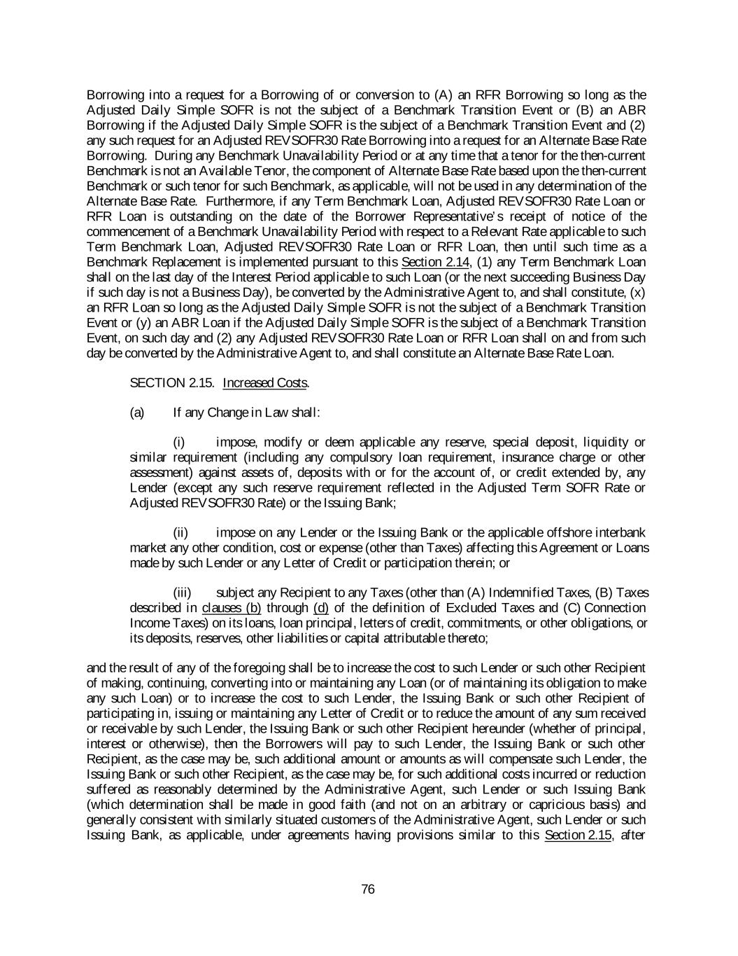Borrowing into a request for a Borrowing of or conversion to (A) an RFR Borrowing so long as the Adjusted Daily Simple SOFR is not the subject of a Benchmark Transition Event or (B) an ABR Borrowing if the Adjusted Daily Simple SOFR is the subject of a Benchmark Transition Event and (2) any such request for an Adjusted REVSOFR30 Rate Borrowing into a request for an Alternate Base Rate Borrowing. During any Benchmark Unavailability Period or at any time that a tenor for the then-current Benchmark is not an Available Tenor, the component of Alternate Base Rate based upon the then-current Benchmark or such tenor for such Benchmark, as applicable, will not be used in any determination of the Alternate Base Rate. Furthermore, if any Term Benchmark Loan, Adjusted REVSOFR30 Rate Loan or RFR Loan is outstanding on the date of the Borrower Representative’s receipt of notice of the commencement of a Benchmark Unavailability Period with respect to a Relevant Rate applicable to such Term Benchmark Loan, Adjusted REVSOFR30 Rate Loan or RFR Loan, then until such time as a Benchmark Replacement is implemented pursuant to this Section 2.14, (1) any Term Benchmark Loan shall on the last day of the Interest Period applicable to such Loan (or the next succeeding Business Day if such day is not a Business Day), be converted by the Administrative Agent to, and shall constitute, (x) an RFR Loan so long as the Adjusted Daily Simple SOFR is not the subject of a Benchmark Transition Event or (y) an ABR Loan if the Adjusted Daily Simple SOFR is the subject of a Benchmark Transition Event, on such day and (2) any Adjusted REVSOFR30 Rate Loan or RFR Loan shall on and from such day be converted by the Administrative Agent to, and shall constitute an Alternate Base Rate Loan. SECTION 2.15. Increased Costs. (a) If any Change in Law shall: (i) impose, modify or deem applicable any reserve, special deposit, liquidity or similar requirement (including any compulsory loan requirement, insurance charge or other assessment) against assets of, deposits with or for the account of, or credit extended by, any Lender (except any such reserve requirement reflected in the Adjusted Term SOFR Rate or Adjusted REVSOFR30 Rate) or the Issuing Bank; (ii) impose on any Lender or the Issuing Bank or the applicable offshore interbank market any other condition, cost or expense (other than Taxes) affecting this Agreement or Loans made by such Lender or any Letter of Credit or participation therein; or (iii) subject any Recipient to any Taxes (other than (A) Indemnified Taxes, (B) Taxes described in clauses (b) through (d) of the definition of Excluded Taxes and (C) Connection Income Taxes) on its loans, loan principal, letters of credit, commitments, or other obligations, or its deposits, reserves, other liabilities or capital attributable thereto; and the result of any of the foregoing shall be to increase the cost to such Lender or such other Recipient of making, continuing, converting into or maintaining any Loan (or of maintaining its obligation to make any such Loan) or to increase the cost to such Lender, the Issuing Bank or such other Recipient of participating in, issuing or maintaining any Letter of Credit or to reduce the amount of any sum received or receivable by such Lender, the Issuing Bank or such other Recipient hereunder (whether of principal, interest or otherwise), then the Borrowers will pay to such Lender, the Issuing Bank or such other Recipient, as the case may be, such additional amount or amounts as will compensate such Lender, the Issuing Bank or such other Recipient, as the case may be, for such additional costs incurred or reduction suffered as reasonably determined by the Administrative Agent, such Lender or such Issuing Bank (which determination shall be made in good faith (and not on an arbitrary or capricious basis) and generally consistent with similarly situated customers of the Administrative Agent, such Lender or such Issuing Bank, as applicable, under agreements having provisions similar to this Section 2.15, after 76
