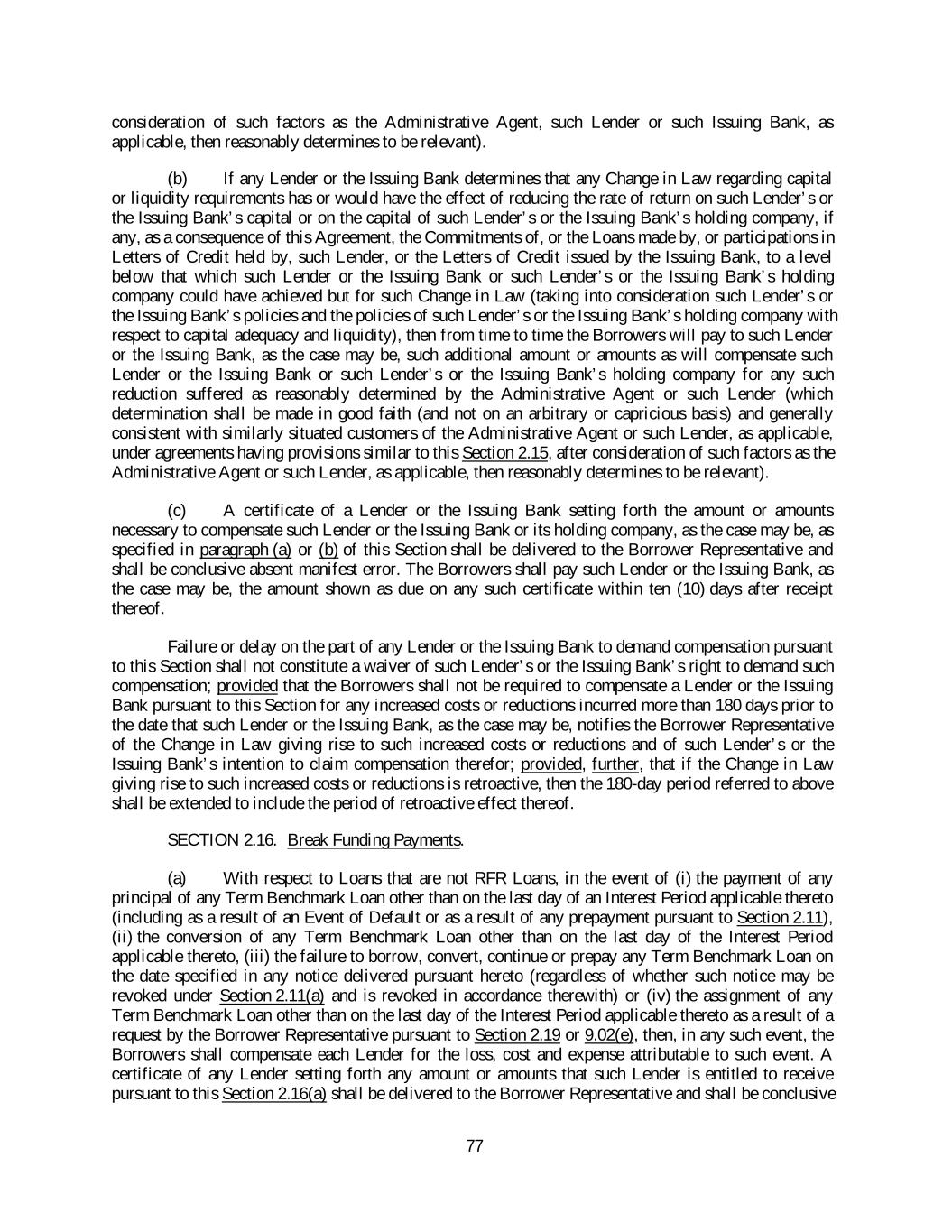 consideration of such factors as the Administrative Agent, such Lender or such Issuing Bank, as applicable, then reasonably determines to be relevant). (b) If any Lender or the Issuing Bank determines that any Change in Law regarding capital or liquidity requirements has or would have the effect of reducing the rate of return on such Lender’s or the Issuing Bank’s capital or on the capital of such Lender’s or the Issuing Bank’s holding company, if any, as a consequence of this Agreement, the Commitments of, or the Loans made by, or participations in Letters of Credit held by, such Lender, or the Letters of Credit issued by the Issuing Bank, to a level below that which such Lender or the Issuing Bank or such Lender’s or the Issuing Bank’s holding company could have achieved but for such Change in Law (taking into consideration such Lender’s or the Issuing Bank’s policies and the policies of such Lender’s or the Issuing Bank’s holding company with respect to capital adequacy and liquidity), then from time to time the Borrowers will pay to such Lender or the Issuing Bank, as the case may be, such additional amount or amounts as will compensate such Lender or the Issuing Bank or such Lender’s or the Issuing Bank’s holding company for any such reduction suffered as reasonably determined by the Administrative Agent or such Lender (which determination shall be made in good faith (and not on an arbitrary or capricious basis) and generally consistent with similarly situated customers of the Administrative Agent or such Lender, as applicable, under agreements having provisions similar to this Section 2.15, after consideration of such factors as the Administrative Agent or such Lender, as applicable, then reasonably determines to be relevant). (c) A certificate of a Lender or the Issuing Bank setting forth the amount or amounts necessary to compensate such Lender or the Issuing Bank or its holding company, as the case may be, as specified in paragraph (a) or (b) of this Section shall be delivered to the Borrower Representative and shall be conclusive absent manifest error. The Borrowers shall pay such Lender or the Issuing Bank, as the case may be, the amount shown as due on any such certificate within ten (10) days after receipt thereof. Failure or delay on the part of any Lender or the Issuing Bank to demand compensation pursuant to this Section shall not constitute a waiver of such Lender’s or the Issuing Bank’s right to demand such compensation; provided that the Borrowers shall not be required to compensate a Lender or the Issuing Bank pursuant to this Section for any increased costs or reductions incurred more than 180 days prior to the date that such Lender or the Issuing Bank, as the case may be, notifies the Borrower Representative of the Change in Law giving rise to such increased costs or reductions and of such Lender’s or the Issuing Bank’s intention to claim compensation therefor; provided, further, that if the Change in Law giving rise to such increased costs or reductions is retroactive, then the 180-day period referred to above shall be extended to include the period of retroactive effect thereof. SECTION 2.16. Break Funding Payments. (a) With respect to Loans that are not RFR Loans, in the event of (i) the payment of any principal of any Term Benchmark Loan other than on the last day of an Interest Period applicable thereto (including as a result of an Event of Default or as a result of any prepayment pursuant to Section 2.11), (ii) the conversion of any Term Benchmark Loan other than on the last day of the Interest Period applicable thereto, (iii) the failure to borrow, convert, continue or prepay any Term Benchmark Loan on the date specified in any notice delivered pursuant hereto (regardless of whether such notice may be revoked under Section 2.11(a) and is revoked in accordance therewith) or (iv) the assignment of any Term Benchmark Loan other than on the last day of the Interest Period applicable thereto as a result of a request by the Borrower Representative pursuant to Section 2.19 or 9.02(e), then, in any such event, the Borrowers shall compensate each Lender for the loss, cost and expense attributable to such event. A certificate of any Lender setting forth any amount or amounts that such Lender is entitled to receive pursuant to this Section 2.16(a) shall be delivered to the Borrower Representative and shall be conclusive 77
