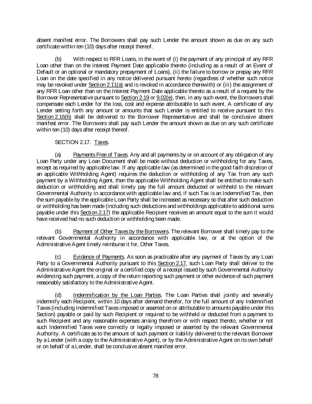 absent manifest error. The Borrowers shall pay such Lender the amount shown as due on any such certificate within ten (10) days after receipt thereof. (b) With respect to RFR Loans, in the event of (i) the payment of any principal of any RFR Loan other than on the Interest Payment Date applicable thereto (including as a result of an Event of Default or an optional or mandatory prepayment of Loans), (ii) the failure to borrow or prepay any RFR Loan on the date specified in any notice delivered pursuant hereto (regardless of whether such notice may be revoked under Section 2.11(a) and is revoked in accordance therewith) or (iii) the assignment of any RFR Loan other than on the Interest Payment Date applicable thereto as a result of a request by the Borrower Representative pursuant to Section 2.19 or 9.02(e), then, in any such event, the Borrowers shall compensate each Lender for the loss, cost and expense attributable to such event. A certificate of any Lender setting forth any amount or amounts that such Lender is entitled to receive pursuant to this Section 2.16(b) shall be delivered to the Borrower Representative and shall be conclusive absent manifest error. The Borrowers shall pay such Lender the amount shown as due on any such certificate within ten (10) days after receipt thereof. SECTION 2.17. Taxes. (a) Payments Free of Taxes. Any and all payments by or on account of any obligation of any Loan Party under any Loan Document shall be made without deduction or withholding for any Taxes, except as required by applicable law. If any applicable law (as determined in the good faith discretion of an applicable Withholding Agent) requires the deduction or withholding of any Tax from any such payment by a Withholding Agent, then the applicable Withholding Agent shall be entitled to make such deduction or withholding and shall timely pay the full amount deducted or withheld to the relevant Governmental Authority in accordance with applicable law and, if such Tax is an Indemnified Tax, then the sum payable by the applicable Loan Party shall be increased as necessary so that after such deduction or withholding has been made (including such deductions and withholdings applicable to additional sums payable under this Section 2.17) the applicable Recipient receives an amount equal to the sum it would have received had no such deduction or withholding been made. (b) Payment of Other Taxes by the Borrowers. The relevant Borrower shall timely pay to the relevant Governmental Authority in accordance with applicable law, or at the option of the Administrative Agent timely reimburse it for, Other Taxes. (c) Evidence of Payments. As soon as practicable after any payment of Taxes by any Loan Party to a Governmental Authority pursuant to this Section 2.17, such Loan Party shall deliver to the Administrative Agent the original or a certified copy of a receipt issued by such Governmental Authority evidencing such payment, a copy of the return reporting such payment or other evidence of such payment reasonably satisfactory to the Administrative Agent. (d) Indemnification by the Loan Parties. The Loan Parties shall jointly and severally indemnify each Recipient, within 10 days after demand therefor, for the full amount of any Indemnified Taxes (including Indemnified Taxes imposed or asserted on or attributable to amounts payable under this Section) payable or paid by such Recipient or required to be withheld or deducted from a payment to such Recipient and any reasonable expenses arising therefrom or with respect thereto, whether or not such Indemnified Taxes were correctly or legally imposed or asserted by the relevant Governmental Authority. A certificate as to the amount of such payment or liability delivered to the relevant Borrower by a Lender (with a copy to the Administrative Agent), or by the Administrative Agent on its own behalf or on behalf of a Lender, shall be conclusive absent manifest error. 78