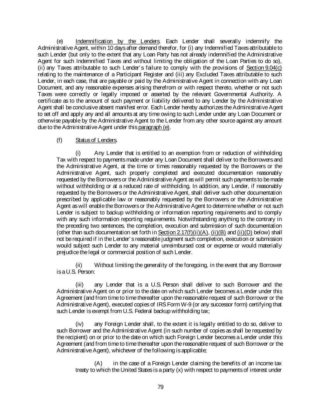 (e) Indemnification by the Lenders. Each Lender shall severally indemnify the Administrative Agent, within 10 days after demand therefor, for (i) any Indemnified Taxes attributable to such Lender (but only to the extent that any Loan Party has not already indemnified the Administrative Agent for such Indemnified Taxes and without limiting the obligation of the Loan Parties to do so), (ii) any Taxes attributable to such Lender’s failure to comply with the provisions of Section 9.04(c) relating to the maintenance of a Participant Register and (iii) any Excluded Taxes attributable to such Lender, in each case, that are payable or paid by the Administrative Agent in connection with any Loan Document, and any reasonable expenses arising therefrom or with respect thereto, whether or not such Taxes were correctly or legally imposed or asserted by the relevant Governmental Authority. A certificate as to the amount of such payment or liability delivered to any Lender by the Administrative Agent shall be conclusive absent manifest error. Each Lender hereby authorizes the Administrative Agent to set off and apply any and all amounts at any time owing to such Lender under any Loan Document or otherwise payable by the Administrative Agent to the Lender from any other source against any amount due to the Administrative Agent under this paragraph (e). (f) Status of Lenders. (i) Any Lender that is entitled to an exemption from or reduction of withholding Tax with respect to payments made under any Loan Document shall deliver to the Borrowers and the Administrative Agent, at the time or times reasonably requested by the Borrowers or the Administrative Agent, such properly completed and executed documentation reasonably requested by the Borrowers or the Administrative Agent as will permit such payments to be made without withholding or at a reduced rate of withholding. In addition, any Lender, if reasonably requested by the Borrowers or the Administrative Agent, shall deliver such other documentation prescribed by applicable law or reasonably requested by the Borrowers or the Administrative Agent as will enable the Borrowers or the Administrative Agent to determine whether or not such Lender is subject to backup withholding or information reporting requirements and to comply with any such information reporting requirements. Notwithstanding anything to the contrary in the preceding two sentences, the completion, execution and submission of such documentation (other than such documentation set forth in Section 2.17(f)(ii)(A), (ii)(B) and (ii)(D) below) shall not be required if in the Lender’s reasonable judgment such completion, execution or submission would subject such Lender to any material unreimbursed cost or expense or would materially prejudice the legal or commercial position of such Lender. (ii) Without limiting the generality of the foregoing, in the event that any Borrower is a U.S. Person: (iii) any Lender that is a U.S. Person shall deliver to such Borrower and the Administrative Agent on or prior to the date on which such Lender becomes a Lender under this Agreement (and from time to time thereafter upon the reasonable request of such Borrower or the Administrative Agent), executed copies of IRS Form W-9 (or any successor form) certifying that such Lender is exempt from U.S. Federal backup withholding tax; (iv) any Foreign Lender shall, to the extent it is legally entitled to do so, deliver to such Borrower and the Administrative Agent (in such number of copies as shall be requested by the recipient) on or prior to the date on which such Foreign Lender becomes a Lender under this Agreement (and from time to time thereafter upon the reasonable request of such Borrower or the Administrative Agent), whichever of the following is applicable; (A) in the case of a Foreign Lender claiming the benefits of an income tax treaty to which the United States is a party (x) with respect to payments of interest under 79