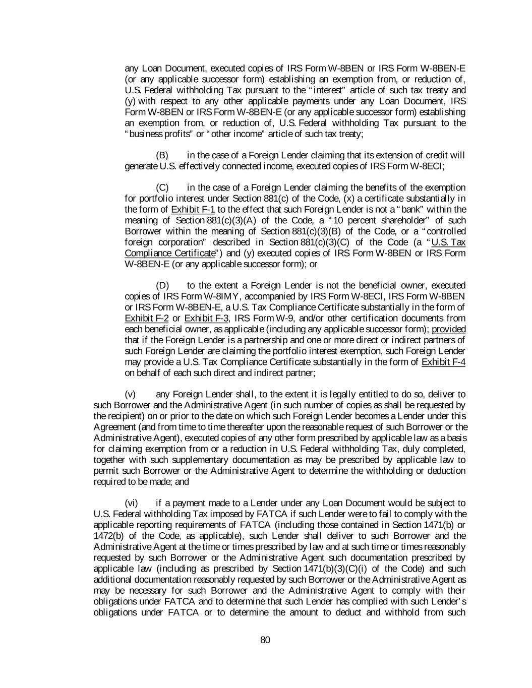 any Loan Document, executed copies of IRS Form W-8BEN or IRS Form W-8BEN-E (or any applicable successor form) establishing an exemption from, or reduction of, U.S. Federal withholding Tax pursuant to the “interest” article of such tax treaty and (y) with respect to any other applicable payments under any Loan Document, IRS Form W-8BEN or IRS Form W-8BEN-E (or any applicable successor form) establishing an exemption from, or reduction of, U.S. Federal withholding Tax pursuant to the “business profits” or “other income” article of such tax treaty; (B) in the case of a Foreign Lender claiming that its extension of credit will generate U.S. effectively connected income, executed copies of IRS Form W-8ECI; (C) in the case of a Foreign Lender claiming the benefits of the exemption for portfolio interest under Section 881(c) of the Code, (x) a certificate substantially in the form of Exhibit F-1 to the effect that such Foreign Lender is not a “bank” within the meaning of Section 881(c)(3)(A) of the Code, a “10 percent shareholder” of such Borrower within the meaning of Section 881(c)(3)(B) of the Code, or a “controlled foreign corporation” described in Section 881(c)(3)(C) of the Code (a “U.S. Tax Compliance Certificate”) and (y) executed copies of IRS Form W-8BEN or IRS Form W-8BEN-E (or any applicable successor form); or (D) to the extent a Foreign Lender is not the beneficial owner, executed copies of IRS Form W-8IMY, accompanied by IRS Form W-8ECI, IRS Form W-8BEN or IRS Form W-8BEN-E, a U.S. Tax Compliance Certificate substantially in the form of Exhibit F-2 or Exhibit F-3, IRS Form W-9, and/or other certification documents from each beneficial owner, as applicable (including any applicable successor form); provided that if the Foreign Lender is a partnership and one or more direct or indirect partners of such Foreign Lender are claiming the portfolio interest exemption, such Foreign Lender may provide a U.S. Tax Compliance Certificate substantially in the form of Exhibit F-4 on behalf of each such direct and indirect partner; (v) any Foreign Lender shall, to the extent it is legally entitled to do so, deliver to such Borrower and the Administrative Agent (in such number of copies as shall be requested by the recipient) on or prior to the date on which such Foreign Lender becomes a Lender under this Agreement (and from time to time thereafter upon the reasonable request of such Borrower or the Administrative Agent), executed copies of any other form prescribed by applicable law as a basis for claiming exemption from or a reduction in U.S. Federal withholding Tax, duly completed, together with such supplementary documentation as may be prescribed by applicable law to permit such Borrower or the Administrative Agent to determine the withholding or deduction required to be made; and (vi) if a payment made to a Lender under any Loan Document would be subject to U.S. Federal withholding Tax imposed by FATCA if such Lender were to fail to comply with the applicable reporting requirements of FATCA (including those contained in Section 1471(b) or 1472(b) of the Code, as applicable), such Lender shall deliver to such Borrower and the Administrative Agent at the time or times prescribed by law and at such time or times reasonably requested by such Borrower or the Administrative Agent such documentation prescribed by applicable law (including as prescribed by Section 1471(b)(3)(C)(i) of the Code) and such additional documentation reasonably requested by such Borrower or the Administrative Agent as may be necessary for such Borrower and the Administrative Agent to comply with their obligations under FATCA and to determine that such Lender has complied with such Lender’s obligations under FATCA or to determine the amount to deduct and withhold from such 80