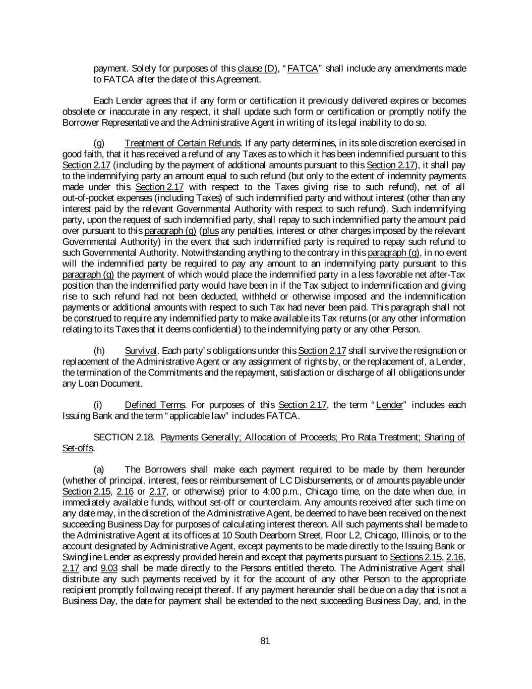payment. Solely for purposes of this clause (D), “FATCA” shall include any amendments made to FATCA after the date of this Agreement. Each Lender agrees that if any form or certification it previously delivered expires or becomes obsolete or inaccurate in any respect, it shall update such form or certification or promptly notify the Borrower Representative and the Administrative Agent in writing of its legal inability to do so. (g) Treatment of Certain Refunds. If any party determines, in its sole discretion exercised in good faith, that it has received a refund of any Taxes as to which it has been indemnified pursuant to this Section 2.17 (including by the payment of additional amounts pursuant to this Section 2.17), it shall pay to the indemnifying party an amount equal to such refund (but only to the extent of indemnity payments made under this Section 2.17 with respect to the Taxes giving rise to such refund), net of all out-of-pocket expenses (including Taxes) of such indemnified party and without interest (other than any interest paid by the relevant Governmental Authority with respect to such refund). Such indemnifying party, upon the request of such indemnified party, shall repay to such indemnified party the amount paid over pursuant to this paragraph (g) (plus any penalties, interest or other charges imposed by the relevant Governmental Authority) in the event that such indemnified party is required to repay such refund to such Governmental Authority. Notwithstanding anything to the contrary in this paragraph (g), in no event will the indemnified party be required to pay any amount to an indemnifying party pursuant to this paragraph (g) the payment of which would place the indemnified party in a less favorable net after-Tax position than the indemnified party would have been in if the Tax subject to indemnification and giving rise to such refund had not been deducted, withheld or otherwise imposed and the indemnification payments or additional amounts with respect to such Tax had never been paid. This paragraph shall not be construed to require any indemnified party to make available its Tax returns (or any other information relating to its Taxes that it deems confidential) to the indemnifying party or any other Person. (h) Survival. Each party’s obligations under this Section 2.17 shall survive the resignation or replacement of the Administrative Agent or any assignment of rights by, or the replacement of, a Lender, the termination of the Commitments and the repayment, satisfaction or discharge of all obligations under any Loan Document. (i) Defined Terms. For purposes of this Section 2.17, the term “Lender” includes each Issuing Bank and the term “applicable law” includes FATCA. SECTION 2.18. Payments Generally; Allocation of Proceeds; Pro Rata Treatment; Sharing of Set-offs. (a) The Borrowers shall make each payment required to be made by them hereunder (whether of principal, interest, fees or reimbursement of LC Disbursements, or of amounts payable under Section 2.15, 2.16 or 2.17, or otherwise) prior to 4:00 p.m., Chicago time, on the date when due, in immediately available funds, without set-off or counterclaim. Any amounts received after such time on any date may, in the discretion of the Administrative Agent, be deemed to have been received on the next succeeding Business Day for purposes of calculating interest thereon. All such payments shall be made to the Administrative Agent at its offices at 10 South Dearborn Street, Floor L2, Chicago, Illinois, or to the account designated by Administrative Agent, except payments to be made directly to the Issuing Bank or Swingline Lender as expressly provided herein and except that payments pursuant to Sections 2.15, 2.16, 2.17 and 9.03 shall be made directly to the Persons entitled thereto. The Administrative Agent shall distribute any such payments received by it for the account of any other Person to the appropriate recipient promptly following receipt thereof. If any payment hereunder shall be due on a day that is not a Business Day, the date for payment shall be extended to the next succeeding Business Day, and, in the 81