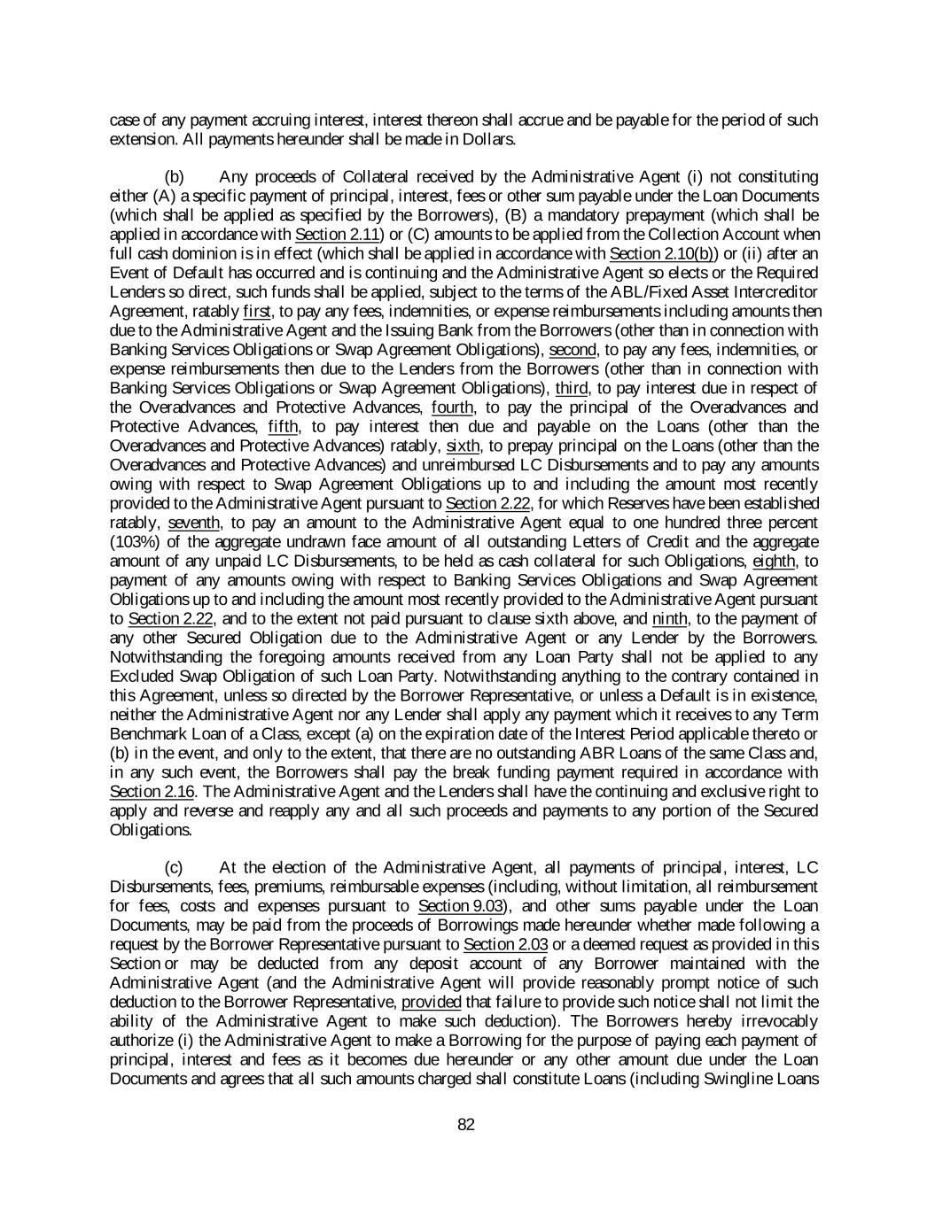case of any payment accruing interest, interest thereon shall accrue and be payable for the period of such extension. All payments hereunder shall be made in Dollars. (b) Any proceeds of Collateral received by the Administrative Agent (i) not constituting either (A) a specific payment of principal, interest, fees or other sum payable under the Loan Documents (which shall be applied as specified by the Borrowers), (B) a mandatory prepayment (which shall be applied in accordance with Section 2.11) or (C) amounts to be applied from the Collection Account when full cash dominion is in effect (which shall be applied in accordance with Section 2.10(b)) or (ii) after an Event of Default has occurred and is continuing and the Administrative Agent so elects or the Required Lenders so direct, such funds shall be applied, subject to the terms of the ABL/Fixed Asset Intercreditor Agreement, ratably first, to pay any fees, indemnities, or expense reimbursements including amounts then due to the Administrative Agent and the Issuing Bank from the Borrowers (other than in connection with Banking Services Obligations or Swap Agreement Obligations), second, to pay any fees, indemnities, or expense reimbursements then due to the Lenders from the Borrowers (other than in connection with Banking Services Obligations or Swap Agreement Obligations), third, to pay interest due in respect of the Overadvances and Protective Advances, fourth, to pay the principal of the Overadvances and Protective Advances, fifth, to pay interest then due and payable on the Loans (other than the Overadvances and Protective Advances) ratably, sixth, to prepay principal on the Loans (other than the Overadvances and Protective Advances) and unreimbursed LC Disbursements and to pay any amounts owing with respect to Swap Agreement Obligations up to and including the amount most recently provided to the Administrative Agent pursuant to Section 2.22, for which Reserves have been established ratably, seventh, to pay an amount to the Administrative Agent equal to one hundred three percent (103%) of the aggregate undrawn face amount of all outstanding Letters of Credit and the aggregate amount of any unpaid LC Disbursements, to be held as cash collateral for such Obligations, eighth, to payment of any amounts owing with respect to Banking Services Obligations and Swap Agreement Obligations up to and including the amount most recently provided to the Administrative Agent pursuant to Section 2.22, and to the extent not paid pursuant to clause sixth above, and ninth, to the payment of any other Secured Obligation due to the Administrative Agent or any Lender by the Borrowers. Notwithstanding the foregoing amounts received from any Loan Party shall not be applied to any Excluded Swap Obligation of such Loan Party. Notwithstanding anything to the contrary contained in this Agreement, unless so directed by the Borrower Representative, or unless a Default is in existence, neither the Administrative Agent nor any Lender shall apply any payment which it receives to any Term Benchmark Loan of a Class, except (a) on the expiration date of the Interest Period applicable thereto or (b) in the event, and only to the extent, that there are no outstanding ABR Loans of the same Class and, in any such event, the Borrowers shall pay the break funding payment required in accordance with Section 2.16. The Administrative Agent and the Lenders shall have the continuing and exclusive right to apply and reverse and reapply any and all such proceeds and payments to any portion of the Secured Obligations. (c) At the election of the Administrative Agent, all payments of principal, interest, LC Disbursements, fees, premiums, reimbursable expenses (including, without limitation, all reimbursement for fees, costs and expenses pursuant to Section 9.03), and other sums payable under the Loan Documents, may be paid from the proceeds of Borrowings made hereunder whether made following a request by the Borrower Representative pursuant to Section 2.03 or a deemed request as provided in this Section or may be deducted from any deposit account of any Borrower maintained with the Administrative Agent (and the Administrative Agent will provide reasonably prompt notice of such deduction to the Borrower Representative, provided that failure to provide such notice shall not limit the ability of the Administrative Agent to make such deduction). The Borrowers hereby irrevocably authorize (i) the Administrative Agent to make a Borrowing for the purpose of paying each payment of principal, interest and fees as it becomes due hereunder or any other amount due under the Loan Documents and agrees that all such amounts charged shall constitute Loans (including Swingline Loans 82
