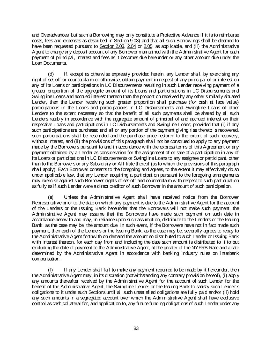 and Overadvances, but such a Borrowing may only constitute a Protective Advance if it is to reimburse costs, fees and expenses as described in Section 9.03) and that all such Borrowings shall be deemed to have been requested pursuant to Section 2.03, 2.04 or 2.05, as applicable, and (ii) the Administrative Agent to charge any deposit account of any Borrower maintained with the Administrative Agent for each payment of principal, interest and fees as it becomes due hereunder or any other amount due under the Loan Documents. (d) If, except as otherwise expressly provided herein, any Lender shall, by exercising any right of set-off or counterclaim or otherwise, obtain payment in respect of any principal of or interest on any of its Loans or participations in LC Disbursements resulting in such Lender receiving payment of a greater proportion of the aggregate amount of its Loans and participations in LC Disbursements and Swingline Loans and accrued interest thereon than the proportion received by any other similarly situated Lender, then the Lender receiving such greater proportion shall purchase (for cash at face value) participations in the Loans and participations in LC Disbursements and Swingline Loans of other Lenders to the extent necessary so that the benefit of all such payments shall be shared by all such Lenders ratably in accordance with the aggregate amount of principal of and accrued interest on their respective Loans and participations in LC Disbursements and Swingline Loans; provided that (i) if any such participations are purchased and all or any portion of the payment giving rise thereto is recovered, such participations shall be rescinded and the purchase price restored to the extent of such recovery, without interest, and (ii) the provisions of this paragraph shall not be construed to apply to any payment made by the Borrowers pursuant to and in accordance with the express terms of this Agreement or any payment obtained by a Lender as consideration for the assignment of or sale of a participation in any of its Loans or participations in LC Disbursements or Swingline Loans to any assignee or participant, other than to the Borrowers or any Subsidiary or Affiliate thereof (as to which the provisions of this paragraph shall apply). Each Borrower consents to the foregoing and agrees, to the extent it may effectively do so under applicable law, that any Lender acquiring a participation pursuant to the foregoing arrangements may exercise against such Borrower rights of set-off and counterclaim with respect to such participation as fully as if such Lender were a direct creditor of such Borrower in the amount of such participation. (e) Unless the Administrative Agent shall have received notice from the Borrower Representative prior to the date on which any payment is due to the Administrative Agent for the account of the Lenders or the Issuing Bank hereunder that the Borrowers will not make such payment, the Administrative Agent may assume that the Borrowers have made such payment on such date in accordance herewith and may, in reliance upon such assumption, distribute to the Lenders or the Issuing Bank, as the case may be, the amount due. In such event, if the Borrowers have not in fact made such payment, then each of the Lenders or the Issuing Bank, as the case may be, severally agrees to repay to the Administrative Agent forthwith on demand the amount so distributed to such Lender or Issuing Bank with interest thereon, for each day from and including the date such amount is distributed to it to but excluding the date of payment to the Administrative Agent, at the greater of the NYFRB Rate and a rate determined by the Administrative Agent in accordance with banking industry rules on interbank compensation. (f) If any Lender shall fail to make any payment required to be made by it hereunder, then the Administrative Agent may, in its discretion (notwithstanding any contrary provision hereof), (i) apply any amounts thereafter received by the Administrative Agent for the account of such Lender for the benefit of the Administrative Agent, the Swingline Lender or the Issuing Bank to satisfy such Lender’s obligations to it under such Sections until all such unsatisfied obligations are fully paid and/or (ii) hold any such amounts in a segregated account over which the Administrative Agent shall have exclusive control as cash collateral for, and application to, any future funding obligations of such Lender under any 83