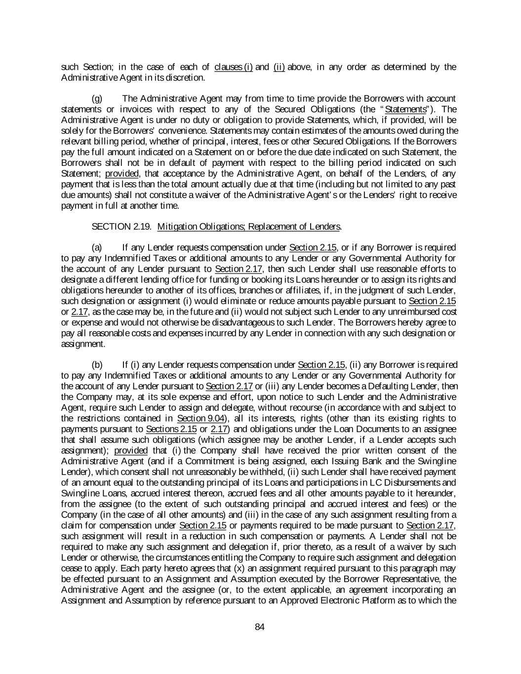 such Section; in the case of each of clauses (i) and (ii) above, in any order as determined by the Administrative Agent in its discretion. (g) The Administrative Agent may from time to time provide the Borrowers with account statements or invoices with respect to any of the Secured Obligations (the “Statements”). The Administrative Agent is under no duty or obligation to provide Statements, which, if provided, will be solely for the Borrowers’ convenience. Statements may contain estimates of the amounts owed during the relevant billing period, whether of principal, interest, fees or other Secured Obligations. If the Borrowers pay the full amount indicated on a Statement on or before the due date indicated on such Statement, the Borrowers shall not be in default of payment with respect to the billing period indicated on such Statement; provided, that acceptance by the Administrative Agent, on behalf of the Lenders, of any payment that is less than the total amount actually due at that time (including but not limited to any past due amounts) shall not constitute a waiver of the Administrative Agent’s or the Lenders’ right to receive payment in full at another time. SECTION 2.19. Mitigation Obligations; Replacement of Lenders. (a) If any Lender requests compensation under Section 2.15, or if any Borrower is required to pay any Indemnified Taxes or additional amounts to any Lender or any Governmental Authority for the account of any Lender pursuant to Section 2.17, then such Lender shall use reasonable efforts to designate a different lending office for funding or booking its Loans hereunder or to assign its rights and obligations hereunder to another of its offices, branches or affiliates, if, in the judgment of such Lender, such designation or assignment (i) would eliminate or reduce amounts payable pursuant to Section 2.15 or 2.17, as the case may be, in the future and (ii) would not subject such Lender to any unreimbursed cost or expense and would not otherwise be disadvantageous to such Lender. The Borrowers hereby agree to pay all reasonable costs and expenses incurred by any Lender in connection with any such designation or assignment. (b) If (i) any Lender requests compensation under Section 2.15, (ii) any Borrower is required to pay any Indemnified Taxes or additional amounts to any Lender or any Governmental Authority for the account of any Lender pursuant to Section 2.17 or (iii) any Lender becomes a Defaulting Lender, then the Company may, at its sole expense and effort, upon notice to such Lender and the Administrative Agent, require such Lender to assign and delegate, without recourse (in accordance with and subject to the restrictions contained in Section 9.04), all its interests, rights (other than its existing rights to payments pursuant to Sections 2.15 or 2.17) and obligations under the Loan Documents to an assignee that shall assume such obligations (which assignee may be another Lender, if a Lender accepts such assignment); provided that (i) the Company shall have received the prior written consent of the Administrative Agent (and if a Commitment is being assigned, each Issuing Bank and the Swingline Lender), which consent shall not unreasonably be withheld, (ii) such Lender shall have received payment of an amount equal to the outstanding principal of its Loans and participations in LC Disbursements and Swingline Loans, accrued interest thereon, accrued fees and all other amounts payable to it hereunder, from the assignee (to the extent of such outstanding principal and accrued interest and fees) or the Company (in the case of all other amounts) and (iii) in the case of any such assignment resulting from a claim for compensation under Section 2.15 or payments required to be made pursuant to Section 2.17, such assignment will result in a reduction in such compensation or payments. A Lender shall not be required to make any such assignment and delegation if, prior thereto, as a result of a waiver by such Lender or otherwise, the circumstances entitling the Company to require such assignment and delegation cease to apply. Each party hereto agrees that (x) an assignment required pursuant to this paragraph may be effected pursuant to an Assignment and Assumption executed by the Borrower Representative, the Administrative Agent and the assignee (or, to the extent applicable, an agreement incorporating an Assignment and Assumption by reference pursuant to an Approved Electronic Platform as to which the 84