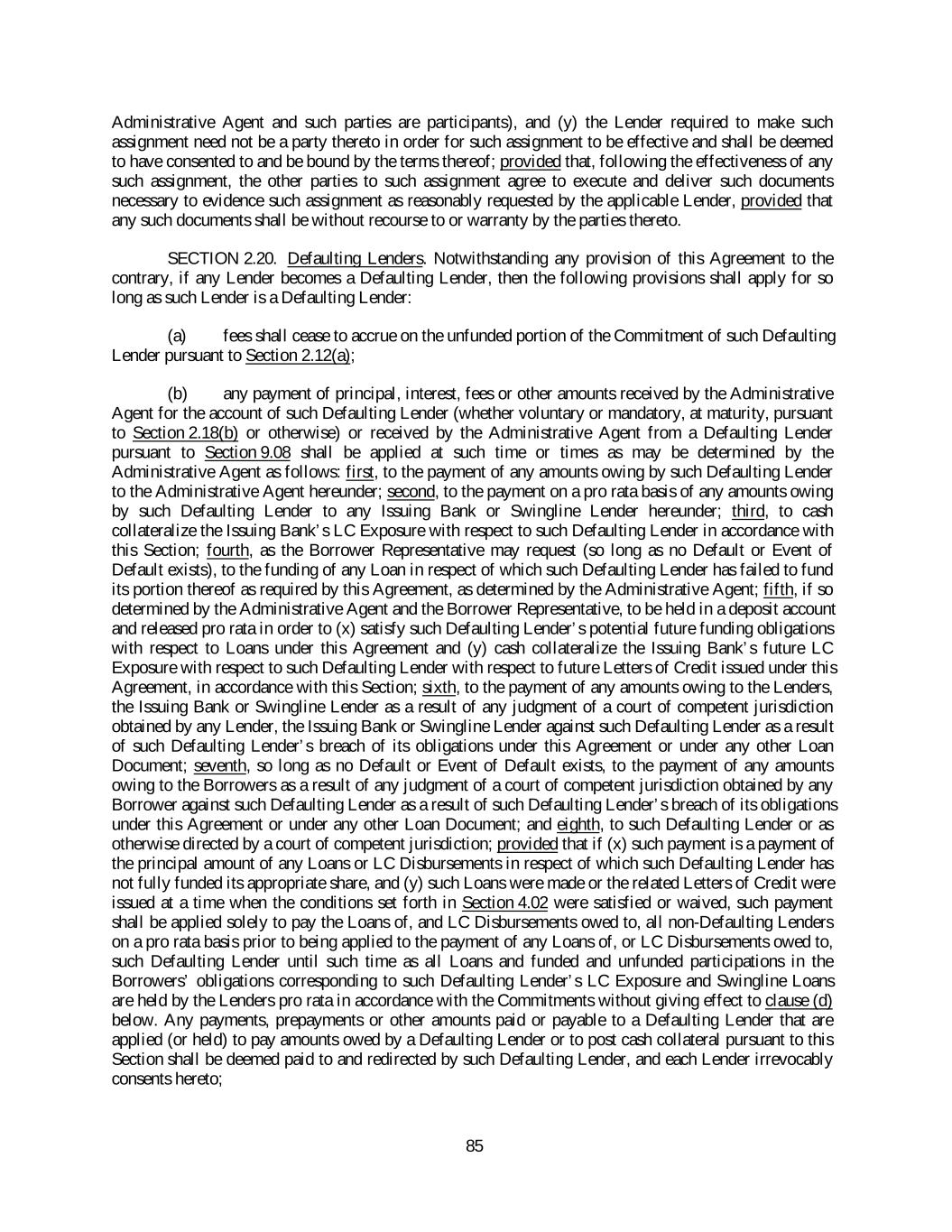Administrative Agent and such parties are participants), and (y) the Lender required to make such assignment need not be a party thereto in order for such assignment to be effective and shall be deemed to have consented to and be bound by the terms thereof; provided that, following the effectiveness of any such assignment, the other parties to such assignment agree to execute and deliver such documents necessary to evidence such assignment as reasonably requested by the applicable Lender, provided that any such documents shall be without recourse to or warranty by the parties thereto. SECTION 2.20. Defaulting Lenders. Notwithstanding any provision of this Agreement to the contrary, if any Lender becomes a Defaulting Lender, then the following provisions shall apply for so long as such Lender is a Defaulting Lender: (a) fees shall cease to accrue on the unfunded portion of the Commitment of such Defaulting Lender pursuant to Section 2.12(a); (b) any payment of principal, interest, fees or other amounts received by the Administrative Agent for the account of such Defaulting Lender (whether voluntary or mandatory, at maturity, pursuant to Section 2.18(b) or otherwise) or received by the Administrative Agent from a Defaulting Lender pursuant to Section 9.08 shall be applied at such time or times as may be determined by the Administrative Agent as follows: first, to the payment of any amounts owing by such Defaulting Lender to the Administrative Agent hereunder; second, to the payment on a pro rata basis of any amounts owing by such Defaulting Lender to any Issuing Bank or Swingline Lender hereunder; third, to cash collateralize the Issuing Bank’s LC Exposure with respect to such Defaulting Lender in accordance with this Section; fourth, as the Borrower Representative may request (so long as no Default or Event of Default exists), to the funding of any Loan in respect of which such Defaulting Lender has failed to fund its portion thereof as required by this Agreement, as determined by the Administrative Agent; fifth, if so determined by the Administrative Agent and the Borrower Representative, to be held in a deposit account and released pro rata in order to (x) satisfy such Defaulting Lender’s potential future funding obligations with respect to Loans under this Agreement and (y) cash collateralize the Issuing Bank’s future LC Exposure with respect to such Defaulting Lender with respect to future Letters of Credit issued under this Agreement, in accordance with this Section; sixth, to the payment of any amounts owing to the Lenders, the Issuing Bank or Swingline Lender as a result of any judgment of a court of competent jurisdiction obtained by any Lender, the Issuing Bank or Swingline Lender against such Defaulting Lender as a result of such Defaulting Lender’s breach of its obligations under this Agreement or under any other Loan Document; seventh, so long as no Default or Event of Default exists, to the payment of any amounts owing to the Borrowers as a result of any judgment of a court of competent jurisdiction obtained by any Borrower against such Defaulting Lender as a result of such Defaulting Lender’s breach of its obligations under this Agreement or under any other Loan Document; and eighth, to such Defaulting Lender or as otherwise directed by a court of competent jurisdiction; provided that if (x) such payment is a payment of the principal amount of any Loans or LC Disbursements in respect of which such Defaulting Lender has not fully funded its appropriate share, and (y) such Loans were made or the related Letters of Credit were issued at a time when the conditions set forth in Section 4.02 were satisfied or waived, such payment shall be applied solely to pay the Loans of, and LC Disbursements owed to, all non-Defaulting Lenders on a pro rata basis prior to being applied to the payment of any Loans of, or LC Disbursements owed to, such Defaulting Lender until such time as all Loans and funded and unfunded participations in the Borrowers’ obligations corresponding to such Defaulting Lender’s LC Exposure and Swingline Loans are held by the Lenders pro rata in accordance with the Commitments without giving effect to clause (d) below. Any payments, prepayments or other amounts paid or payable to a Defaulting Lender that are applied (or held) to pay amounts owed by a Defaulting Lender or to post cash collateral pursuant to this Section shall be deemed paid to and redirected by such Defaulting Lender, and each Lender irrevocably consents hereto; 85