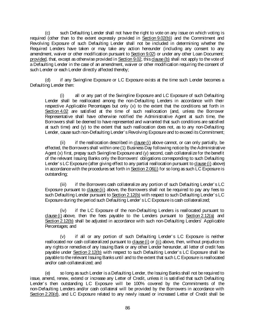 (c) such Defaulting Lender shall not have the right to vote on any issue on which voting is required (other than to the extent expressly provided in Section 9.02(b)) and the Commitment and Revolving Exposure of such Defaulting Lender shall not be included in determining whether the Required Lenders have taken or may take any action hereunder (including any consent to any amendment, waiver or other modification pursuant to Section 9.02) or under any other Loan Document; provided, that, except as otherwise provided in Section 9.02, this clause (b) shall not apply to the vote of a Defaulting Lender in the case of an amendment, waiver or other modification requiring the consent of such Lender or each Lender directly affected thereby; (d) if any Swingline Exposure or LC Exposure exists at the time such Lender becomes a Defaulting Lender then: (i) all or any part of the Swingline Exposure and LC Exposure of such Defaulting Lender shall be reallocated among the non-Defaulting Lenders in accordance with their respective Applicable Percentages but only (x) to the extent that the conditions set forth in Section 4.02 are satisfied at the time of such reallocation (and, unless the Borrower Representative shall have otherwise notified the Administrative Agent at such time, the Borrowers shall be deemed to have represented and warranted that such conditions are satisfied at such time) and (y) to the extent that such reallocation does not, as to any non-Defaulting Lender, cause such non-Defaulting Lender’s Revolving Exposure and to exceed its Commitment; (ii) if the reallocation described in clause (i) above cannot, or can only partially, be effected, the Borrowers shall within one (1) Business Day following notice by the Administrative Agent (x) first, prepay such Swingline Exposure and (y) second, cash collateralize for the benefit of the relevant Issuing Banks only the Borrowers’ obligations corresponding to such Defaulting Lender’s LC Exposure (after giving effect to any partial reallocation pursuant to clause (i) above) in accordance with the procedures set forth in Section 2.06(j) for so long as such LC Exposure is outstanding; (iii) if the Borrowers cash collateralize any portion of such Defaulting Lender’s LC Exposure pursuant to clause (ii) above, the Borrowers shall not be required to pay any fees to such Defaulting Lender pursuant to Section 2.12(b) with respect to such Defaulting Lender’s LC Exposure during the period such Defaulting Lender’s LC Exposure is cash collateralized; (iv) if the LC Exposure of the non-Defaulting Lenders is reallocated pursuant to clause (i) above, then the fees payable to the Lenders pursuant to Section 2.12(a) and Section 2.12(b) shall be adjusted in accordance with such non-Defaulting Lenders’ Applicable Percentages; and (v) if all or any portion of such Defaulting Lender’s LC Exposure is neither reallocated nor cash collateralized pursuant to clause (i) or (ii) above, then, without prejudice to any rights or remedies of any Issuing Bank or any other Lender hereunder, all letter of credit fees payable under Section 2.12(b) with respect to such Defaulting Lender’s LC Exposure shall be payable to the relevant Issuing Banks until and to the extent that such LC Exposure is reallocated and/or cash collateralized; and (e) so long as such Lender is a Defaulting Lender, the Issuing Banks shall not be required to issue, amend, renew, extend or increase any Letter of Credit, unless it is satisfied that such Defaulting Lender’s then outstanding LC Exposure will be 100% covered by the Commitments of the non-Defaulting Lenders and/or cash collateral will be provided by the Borrowers in accordance with Section 2.20(d), and LC Exposure related to any newly issued or increased Letter of Credit shall be 86