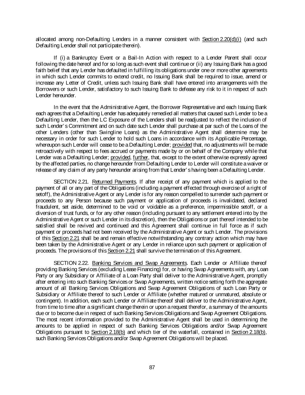 allocated among non-Defaulting Lenders in a manner consistent with Section 2.20(d)(i) (and such Defaulting Lender shall not participate therein). If (i) a Bankruptcy Event or a Bail-In Action with respect to a Lender Parent shall occur following the date hereof and for so long as such event shall continue or (ii) any Issuing Bank has a good faith belief that any Lender has defaulted in fulfilling its obligations under one or more other agreements in which such Lender commits to extend credit, no Issuing Bank shall be required to issue, amend or increase any Letter of Credit, unless such Issuing Bank shall have entered into arrangements with the Borrowers or such Lender, satisfactory to such Issuing Bank to defease any risk to it in respect of such Lender hereunder. In the event that the Administrative Agent, the Borrower Representative and each Issuing Bank each agrees that a Defaulting Lender has adequately remedied all matters that caused such Lender to be a Defaulting Lender, then the LC Exposure of the Lenders shall be readjusted to reflect the inclusion of such Lender’s Commitment and on such date such Lender shall purchase at par such of the Loans of the other Lenders (other than Swingline Loans) as the Administrative Agent shall determine may be necessary in order for such Lender to hold such Loans in accordance with its Applicable Percentage, whereupon such Lender will cease to be a Defaulting Lender; provided that, no adjustments will be made retroactively with respect to fees accrued or payments made by or on behalf of the Company while that Lender was a Defaulting Lender; provided, further, that, except to the extent otherwise expressly agreed by the affected parties, no change hereunder from Defaulting Lender to Lender will constitute a waiver or release of any claim of any party hereunder arising from that Lender’s having been a Defaulting Lender. SECTION 2.21. Returned Payments. If after receipt of any payment which is applied to the payment of all or any part of the Obligations (including a payment effected through exercise of a right of setoff), the Administrative Agent or any Lender is for any reason compelled to surrender such payment or proceeds to any Person because such payment or application of proceeds is invalidated, declared fraudulent, set aside, determined to be void or voidable as a preference, impermissible setoff, or a diversion of trust funds, or for any other reason (including pursuant to any settlement entered into by the Administrative Agent or such Lender in its discretion), then the Obligations or part thereof intended to be satisfied shall be revived and continued and this Agreement shall continue in full force as if such payment or proceeds had not been received by the Administrative Agent or such Lender. The provisions of this Section 2.21 shall be and remain effective notwithstanding any contrary action which may have been taken by the Administrative Agent or any Lender in reliance upon such payment or application of proceeds. The provisions of this Section 2.21 shall survive the termination of this Agreement. SECTION 2.22. Banking Services and Swap Agreements. Each Lender or Affiliate thereof providing Banking Services (excluding Lease Financing) for, or having Swap Agreements with, any Loan Party or any Subsidiary or Affiliate of a Loan Party shall deliver to the Administrative Agent, promptly after entering into such Banking Services or Swap Agreements, written notice setting forth the aggregate amount of all Banking Services Obligations and Swap Agreement Obligations of such Loan Party or Subsidiary or Affiliate thereof to such Lender or Affiliate (whether matured or unmatured, absolute or contingent). In addition, each such Lender or Affiliate thereof shall deliver to the Administrative Agent, from time to time after a significant change therein or upon a request therefor, a summary of the amounts due or to become due in respect of such Banking Services Obligations and Swap Agreement Obligations. The most recent information provided to the Administrative Agent shall be used in determining the amounts to be applied in respect of such Banking Services Obligations and/or Swap Agreement Obligations pursuant to Section 2.18(b) and which tier of the waterfall, contained in Section 2.18(b), such Banking Services Obligations and/or Swap Agreement Obligations will be placed. 87
