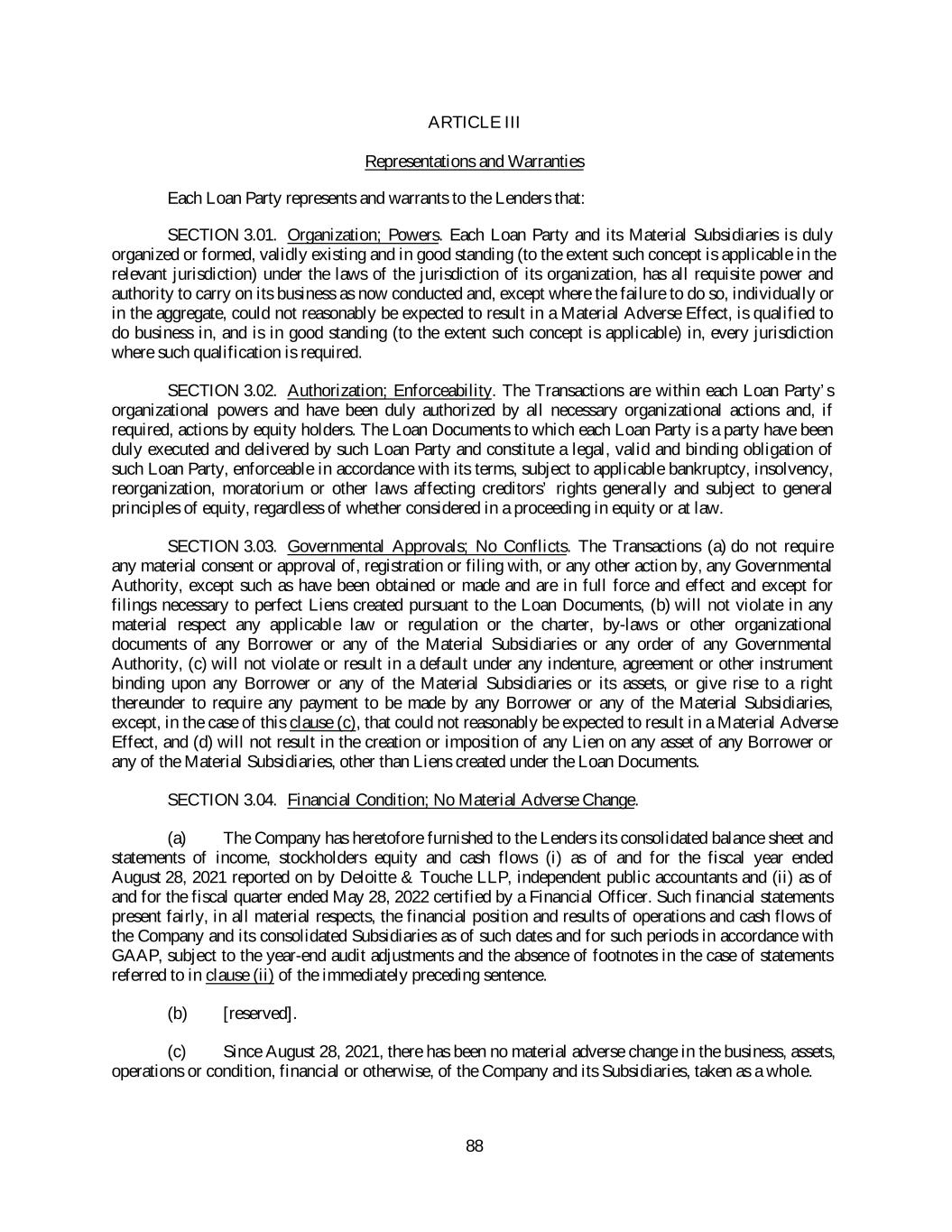ARTICLE III Representations and Warranties Each Loan Party represents and warrants to the Lenders that: SECTION 3.01. Organization; Powers. Each Loan Party and its Material Subsidiaries is duly organized or formed, validly existing and in good standing (to the extent such concept is applicable in the relevant jurisdiction) under the laws of the jurisdiction of its organization, has all requisite power and authority to carry on its business as now conducted and, except where the failure to do so, individually or in the aggregate, could not reasonably be expected to result in a Material Adverse Effect, is qualified to do business in, and is in good standing (to the extent such concept is applicable) in, every jurisdiction where such qualification is required. SECTION 3.02. Authorization; Enforceability. The Transactions are within each Loan Party’s organizational powers and have been duly authorized by all necessary organizational actions and, if required, actions by equity holders. The Loan Documents to which each Loan Party is a party have been duly executed and delivered by such Loan Party and constitute a legal, valid and binding obligation of such Loan Party, enforceable in accordance with its terms, subject to applicable bankruptcy, insolvency, reorganization, moratorium or other laws affecting creditors’ rights generally and subject to general principles of equity, regardless of whether considered in a proceeding in equity or at law. SECTION 3.03. Governmental Approvals; No Conflicts. The Transactions (a) do not require any material consent or approval of, registration or filing with, or any other action by, any Governmental Authority, except such as have been obtained or made and are in full force and effect and except for filings necessary to perfect Liens created pursuant to the Loan Documents, (b) will not violate in any material respect any applicable law or regulation or the charter, by-laws or other organizational documents of any Borrower or any of the Material Subsidiaries or any order of any Governmental Authority, (c) will not violate or result in a default under any indenture, agreement or other instrument binding upon any Borrower or any of the Material Subsidiaries or its assets, or give rise to a right thereunder to require any payment to be made by any Borrower or any of the Material Subsidiaries, except, in the case of this clause (c), that could not reasonably be expected to result in a Material Adverse Effect, and (d) will not result in the creation or imposition of any Lien on any asset of any Borrower or any of the Material Subsidiaries, other than Liens created under the Loan Documents. SECTION 3.04. Financial Condition; No Material Adverse Change. (a) The Company has heretofore furnished to the Lenders its consolidated balance sheet and statements of income, stockholders equity and cash flows (i) as of and for the fiscal year ended August 28, 2021 reported on by Deloitte & Touche LLP, independent public accountants and (ii) as of and for the fiscal quarter ended May 28, 2022 certified by a Financial Officer. Such financial statements present fairly, in all material respects, the financial position and results of operations and cash flows of the Company and its consolidated Subsidiaries as of such dates and for such periods in accordance with GAAP, subject to the year-end audit adjustments and the absence of footnotes in the case of statements referred to in clause (ii) of the immediately preceding sentence. (b) [reserved]. (c) Since August 28, 2021, there has been no material adverse change in the business, assets, operations or condition, financial or otherwise, of the Company and its Subsidiaries, taken as a whole. 88