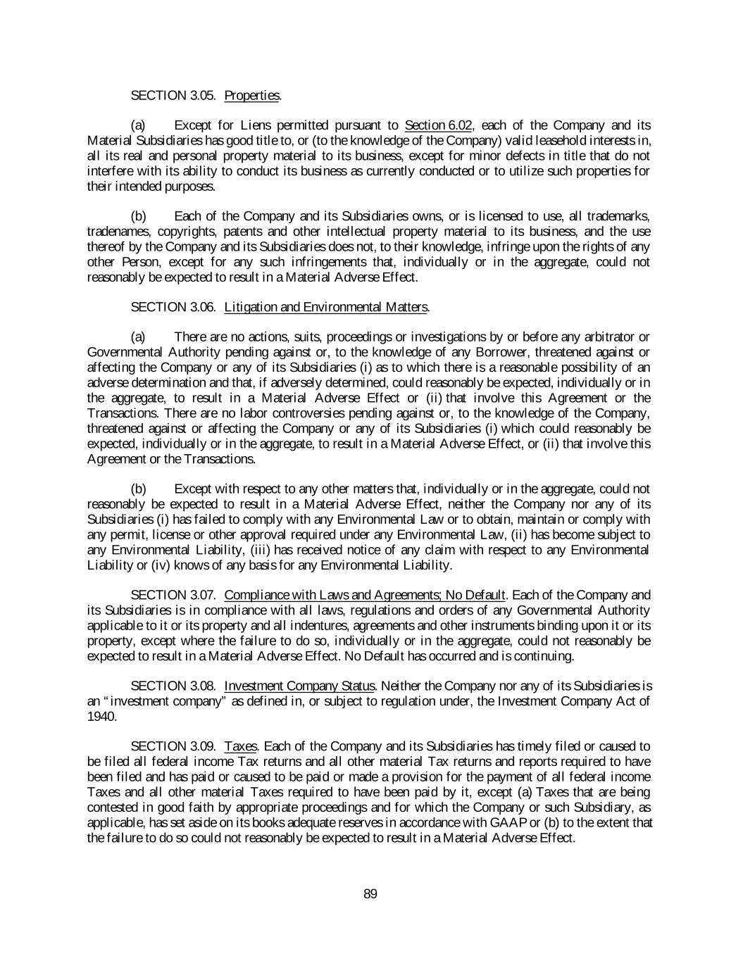 SECTION 3.05. Properties. (a) Except for Liens permitted pursuant to Section 6.02, each of the Company and its Material Subsidiaries has good title to, or (to the knowledge of the Company) valid leasehold interests in, all its real and personal property material to its business, except for minor defects in title that do not interfere with its ability to conduct its business as currently conducted or to utilize such properties for their intended purposes. (b) Each of the Company and its Subsidiaries owns, or is licensed to use, all trademarks, tradenames, copyrights, patents and other intellectual property material to its business, and the use thereof by the Company and its Subsidiaries does not, to their knowledge, infringe upon the rights of any other Person, except for any such infringements that, individually or in the aggregate, could not reasonably be expected to result in a Material Adverse Effect. SECTION 3.06. Litigation and Environmental Matters. (a) There are no actions, suits, proceedings or investigations by or before any arbitrator or Governmental Authority pending against or, to the knowledge of any Borrower, threatened against or affecting the Company or any of its Subsidiaries (i) as to which there is a reasonable possibility of an adverse determination and that, if adversely determined, could reasonably be expected, individually or in the aggregate, to result in a Material Adverse Effect or (ii) that involve this Agreement or the Transactions. There are no labor controversies pending against or, to the knowledge of the Company, threatened against or affecting the Company or any of its Subsidiaries (i) which could reasonably be expected, individually or in the aggregate, to result in a Material Adverse Effect, or (ii) that involve this Agreement or the Transactions. (b) Except with respect to any other matters that, individually or in the aggregate, could not reasonably be expected to result in a Material Adverse Effect, neither the Company nor any of its Subsidiaries (i) has failed to comply with any Environmental Law or to obtain, maintain or comply with any permit, license or other approval required under any Environmental Law, (ii) has become subject to any Environmental Liability, (iii) has received notice of any claim with respect to any Environmental Liability or (iv) knows of any basis for any Environmental Liability. SECTION 3.07. Compliance with Laws and Agreements; No Default. Each of the Company and its Subsidiaries is in compliance with all laws, regulations and orders of any Governmental Authority applicable to it or its property and all indentures, agreements and other instruments binding upon it or its property, except where the failure to do so, individually or in the aggregate, could not reasonably be expected to result in a Material Adverse Effect. No Default has occurred and is continuing. SECTION 3.08. Investment Company Status. Neither the Company nor any of its Subsidiaries is an “investment company” as defined in, or subject to regulation under, the Investment Company Act of 1940. SECTION 3.09. Taxes. Each of the Company and its Subsidiaries has timely filed or caused to be filed all federal income Tax returns and all other material Tax returns and reports required to have been filed and has paid or caused to be paid or made a provision for the payment of all federal income Taxes and all other material Taxes required to have been paid by it, except (a) Taxes that are being contested in good faith by appropriate proceedings and for which the Company or such Subsidiary, as applicable, has set aside on its books adequate reserves in accordance with GAAP or (b) to the extent that the failure to do so could not reasonably be expected to result in a Material Adverse Effect. 89