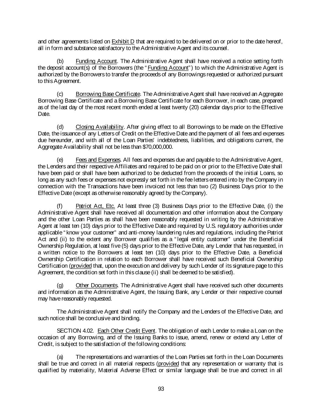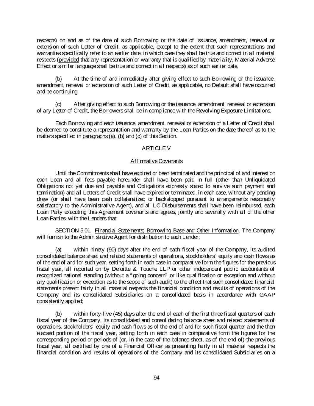 respects) on and as of the date of such Borrowing or the date of issuance, amendment, renewal or extension of such Letter of Credit, as applicable, except to the extent that such representations and warranties specifically refer to an earlier date, in which case they shall be true and correct in all material respects (provided that any representation or warranty that is qualified by materiality, Material Adverse Effect or similar language shall be true and correct in all respects) as of such earlier date. (b) At the time of and immediately after giving effect to such Borrowing or the issuance, amendment, renewal or extension of such Letter of Credit, as applicable, no Default shall have occurred and be continuing. (c) After giving effect to such Borrowing or the issuance, amendment, renewal or extension of any Letter of Credit, the Borrowers shall be in compliance with the Revolving Exposure Limitations. Each Borrowing and each issuance, amendment, renewal or extension of a Letter of Credit shall be deemed to constitute a representation and warranty by the Loan Parties on the date thereof as to the matters specified in paragraphs (a), (b) and (c) of this Section. ARTICLE V Affirmative Covenants Until the Commitments shall have expired or been terminated and the principal of and interest on each Loan and all fees payable hereunder shall have been paid in full (other than Unliquidated Obligations not yet due and payable and Obligations expressly stated to survive such payment and termination) and all Letters of Credit shall have expired or terminated, in each case, without any pending draw (or shall have been cash collateralized or backstopped pursuant to arrangements reasonably satisfactory to the Administrative Agent), and all LC Disbursements shall have been reimbursed, each Loan Party executing this Agreement covenants and agrees, jointly and severally with all of the other Loan Parties, with the Lenders that: SECTION 5.01. Financial Statements; Borrowing Base and Other Information. The Company will furnish to the Administrative Agent for distribution to each Lender: (a) within ninety (90) days after the end of each fiscal year of the Company, its audited consolidated balance sheet and related statements of operations, stockholders’ equity and cash flows as of the end of and for such year, setting forth in each case in comparative form the figures for the previous fiscal year, all reported on by Deloitte & Touche LLP or other independent public accountants of recognized national standing (without a “going concern” or like qualification or exception and without any qualification or exception as to the scope of such audit) to the effect that such consolidated financial statements present fairly in all material respects the financial condition and results of operations of the Company and its consolidated Subsidiaries on a consolidated basis in accordance with GAAP consistently applied; (b) within forty-five (45) days after the end of each of the first three fiscal quarters of each fiscal year of the Company, its consolidated and consolidating balance sheet and related statements of operations, stockholders’ equity and cash flows as of the end of and for such fiscal quarter and the then elapsed portion of the fiscal year, setting forth in each case in comparative form the figures for the corresponding period or periods of (or, in the case of the balance sheet, as of the end of) the previous fiscal year, all certified by one of a Financial Officer as presenting fairly in all material respects the financial condition and results of operations of the Company and its consolidated Subsidiaries on a 94