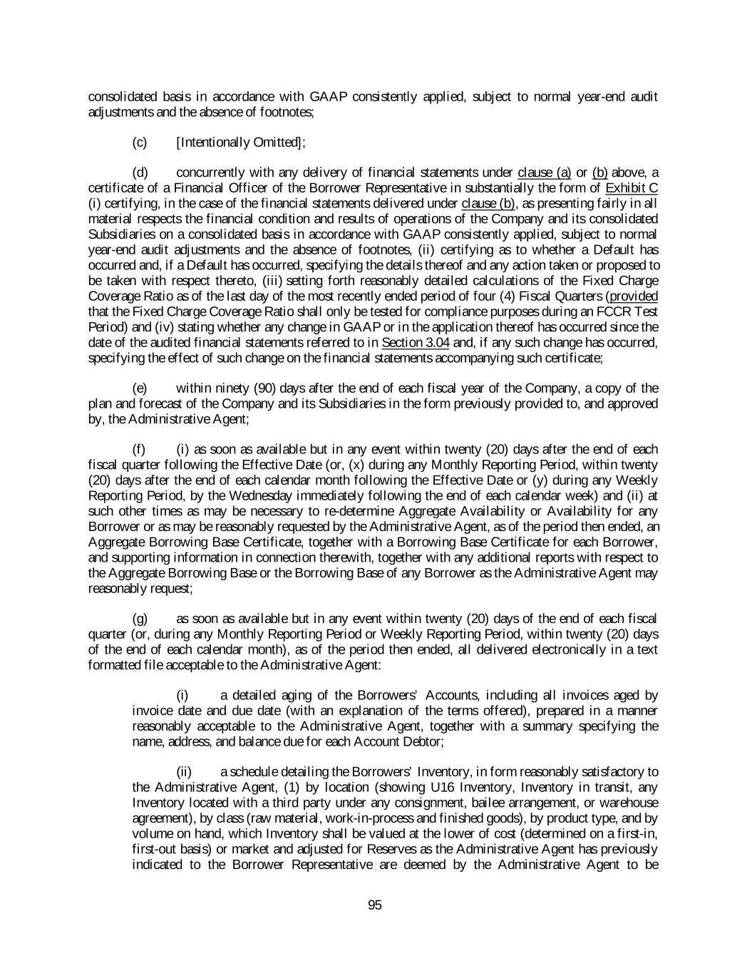 consolidated basis in accordance with GAAP consistently applied, subject to normal year-end audit adjustments and the absence of footnotes; (c) [Intentionally Omitted]; (d) concurrently with any delivery of financial statements under clause (a) or (b) above, a certificate of a Financial Officer of the Borrower Representative in substantially the form of Exhibit C (i) certifying, in the case of the financial statements delivered under clause (b), as presenting fairly in all material respects the financial condition and results of operations of the Company and its consolidated Subsidiaries on a consolidated basis in accordance with GAAP consistently applied, subject to normal year-end audit adjustments and the absence of footnotes, (ii) certifying as to whether a Default has occurred and, if a Default has occurred, specifying the details thereof and any action taken or proposed to be taken with respect thereto, (iii) setting forth reasonably detailed calculations of the Fixed Charge Coverage Ratio as of the last day of the most recently ended period of four (4) Fiscal Quarters (provided that the Fixed Charge Coverage Ratio shall only be tested for compliance purposes during an FCCR Test Period) and (iv) stating whether any change in GAAP or in the application thereof has occurred since the date of the audited financial statements referred to in Section 3.04 and, if any such change has occurred, specifying the effect of such change on the financial statements accompanying such certificate; (e) within ninety (90) days after the end of each fiscal year of the Company, a copy of the plan and forecast of the Company and its Subsidiaries in the form previously provided to, and approved by, the Administrative Agent; (f) (i) as soon as available but in any event within twenty (20) days after the end of each fiscal quarter following the Effective Date (or, (x) during any Monthly Reporting Period, within twenty (20) days after the end of each calendar month following the Effective Date or (y) during any Weekly Reporting Period, by the Wednesday immediately following the end of each calendar week) and (ii) at such other times as may be necessary to re-determine Aggregate Availability or Availability for any Borrower or as may be reasonably requested by the Administrative Agent, as of the period then ended, an Aggregate Borrowing Base Certificate, together with a Borrowing Base Certificate for each Borrower, and supporting information in connection therewith, together with any additional reports with respect to the Aggregate Borrowing Base or the Borrowing Base of any Borrower as the Administrative Agent may reasonably request; (g) as soon as available but in any event within twenty (20) days of the end of each fiscal quarter (or, during any Monthly Reporting Period or Weekly Reporting Period, within twenty (20) days of the end of each calendar month), as of the period then ended, all delivered electronically in a text formatted file acceptable to the Administrative Agent: (i) a detailed aging of the Borrowers’ Accounts, including all invoices aged by invoice date and due date (with an explanation of the terms offered), prepared in a manner reasonably acceptable to the Administrative Agent, together with a summary specifying the name, address, and balance due for each Account Debtor; (ii) a schedule detailing the Borrowers’ Inventory, in form reasonably satisfactory to the Administrative Agent, (1) by location (showing U16 Inventory, Inventory in transit, any Inventory located with a third party under any consignment, bailee arrangement, or warehouse agreement), by class (raw material, work-in-process and finished goods), by product type, and by volume on hand, which Inventory shall be valued at the lower of cost (determined on a first-in, first-out basis) or market and adjusted for Reserves as the Administrative Agent has previously indicated to the Borrower Representative are deemed by the Administrative Agent to be 95