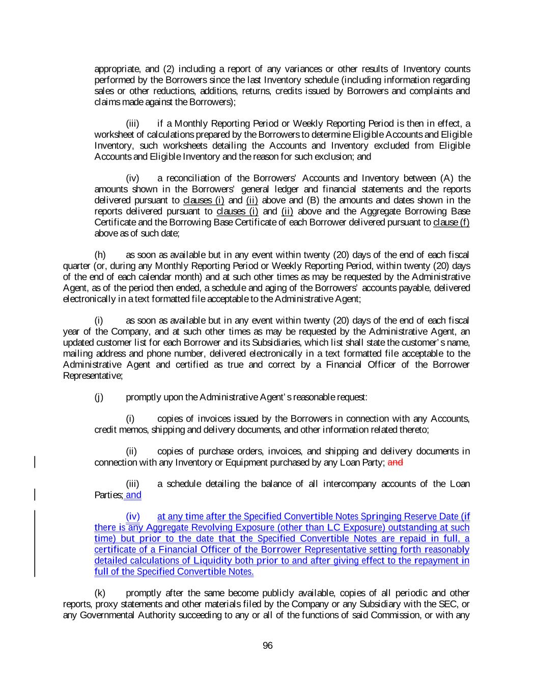 appropriate, and (2) including a report of any variances or other results of Inventory counts performed by the Borrowers since the last Inventory schedule (including information regarding sales or other reductions, additions, returns, credits issued by Borrowers and complaints and claims made against the Borrowers); (iii) if a Monthly Reporting Period or Weekly Reporting Period is then in effect, a worksheet of calculations prepared by the Borrowers to determine Eligible Accounts and Eligible Inventory, such worksheets detailing the Accounts and Inventory excluded from Eligible Accounts and Eligible Inventory and the reason for such exclusion; and (iv) a reconciliation of the Borrowers’ Accounts and Inventory between (A) the amounts shown in the Borrowers’ general ledger and financial statements and the reports delivered pursuant to clauses (i) and (ii) above and (B) the amounts and dates shown in the reports delivered pursuant to clauses (i) and (ii) above and the Aggregate Borrowing Base Certificate and the Borrowing Base Certificate of each Borrower delivered pursuant to clause (f) above as of such date; (h) as soon as available but in any event within twenty (20) days of the end of each fiscal quarter (or, during any Monthly Reporting Period or Weekly Reporting Period, within twenty (20) days of the end of each calendar month) and at such other times as may be requested by the Administrative Agent, as of the period then ended, a schedule and aging of the Borrowers’ accounts payable, delivered electronically in a text formatted file acceptable to the Administrative Agent; (i) as soon as available but in any event within twenty (20) days of the end of each fiscal year of the Company, and at such other times as may be requested by the Administrative Agent, an updated customer list for each Borrower and its Subsidiaries, which list shall state the customer’s name, mailing address and phone number, delivered electronically in a text formatted file acceptable to the Administrative Agent and certified as true and correct by a Financial Officer of the Borrower Representative; (j) promptly upon the Administrative Agent’s reasonable request: (i) copies of invoices issued by the Borrowers in connection with any Accounts, credit memos, shipping and delivery documents, and other information related thereto; (ii) copies of purchase orders, invoices, and shipping and delivery documents in connection with any Inventory or Equipment purchased by any Loan Party; and (iii) a schedule detailing the balance of all intercompany accounts of the Loan Parties; and (iv) at any time after the Specified Convertible Notes Springing Reserve Date (if there is any Aggregate Revolving Exposure (other than LC Exposure) outstanding at such time) but prior to the date that the Specified Convertible Notes are repaid in full, a certificate of a Financial Officer of the Borrower Representative setting forth reasonably detailed calculations of Liquidity both prior to and after giving effect to the repayment in full of the Specified Convertible Notes. (k) promptly after the same become publicly available, copies of all periodic and other reports, proxy statements and other materials filed by the Company or any Subsidiary with the SEC, or any Governmental Authority succeeding to any or all of the functions of said Commission, or with any 96