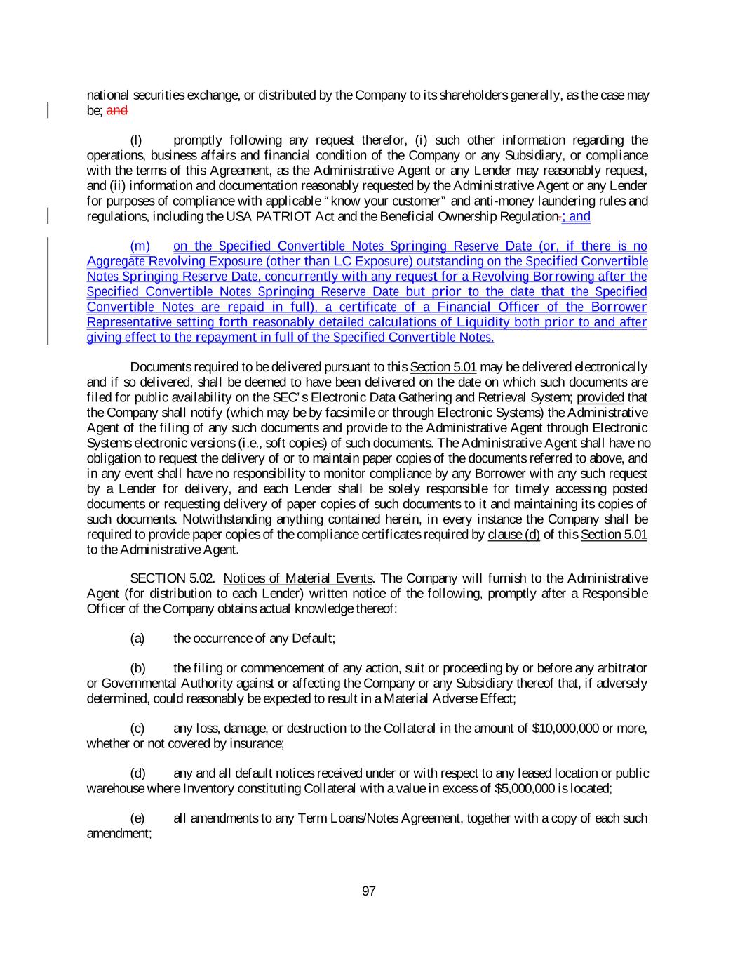 national securities exchange, or distributed by the Company to its shareholders generally, as the case may be; and (l) promptly following any request therefor, (i) such other information regarding the operations, business affairs and financial condition of the Company or any Subsidiary, or compliance with the terms of this Agreement, as the Administrative Agent or any Lender may reasonably request, and (ii) information and documentation reasonably requested by the Administrative Agent or any Lender for purposes of compliance with applicable “know your customer” and anti-money laundering rules and regulations, including the USA PATRIOT Act and the Beneficial Ownership Regulation.; and (m) on the Specified Convertible Notes Springing Reserve Date (or, if there is no Aggregate Revolving Exposure (other than LC Exposure) outstanding on the Specified Convertible Notes Springing Reserve Date, concurrently with any request for a Revolving Borrowing after the Specified Convertible Notes Springing Reserve Date but prior to the date that the Specified Convertible Notes are repaid in full), a certificate of a Financial Officer of the Borrower Representative setting forth reasonably detailed calculations of Liquidity both prior to and after giving effect to the repayment in full of the Specified Convertible Notes. Documents required to be delivered pursuant to this Section 5.01 may be delivered electronically and if so delivered, shall be deemed to have been delivered on the date on which such documents are filed for public availability on the SEC’s Electronic Data Gathering and Retrieval System; provided that the Company shall notify (which may be by facsimile or through Electronic Systems) the Administrative Agent of the filing of any such documents and provide to the Administrative Agent through Electronic Systems electronic versions (i.e., soft copies) of such documents. The Administrative Agent shall have no obligation to request the delivery of or to maintain paper copies of the documents referred to above, and in any event shall have no responsibility to monitor compliance by any Borrower with any such request by a Lender for delivery, and each Lender shall be solely responsible for timely accessing posted documents or requesting delivery of paper copies of such documents to it and maintaining its copies of such documents. Notwithstanding anything contained herein, in every instance the Company shall be required to provide paper copies of the compliance certificates required by clause (d) of this Section 5.01 to the Administrative Agent. SECTION 5.02. Notices of Material Events. The Company will furnish to the Administrative Agent (for distribution to each Lender) written notice of the following, promptly after a Responsible Officer of the Company obtains actual knowledge thereof: (a) the occurrence of any Default; (b) the filing or commencement of any action, suit or proceeding by or before any arbitrator or Governmental Authority against or affecting the Company or any Subsidiary thereof that, if adversely determined, could reasonably be expected to result in a Material Adverse Effect; (c) any loss, damage, or destruction to the Collateral in the amount of $10,000,000 or more, whether or not covered by insurance; (d) any and all default notices received under or with respect to any leased location or public warehouse where Inventory constituting Collateral with a value in excess of $5,000,000 is located; (e) all amendments to any Term Loans/Notes Agreement, together with a copy of each such amendment; 97