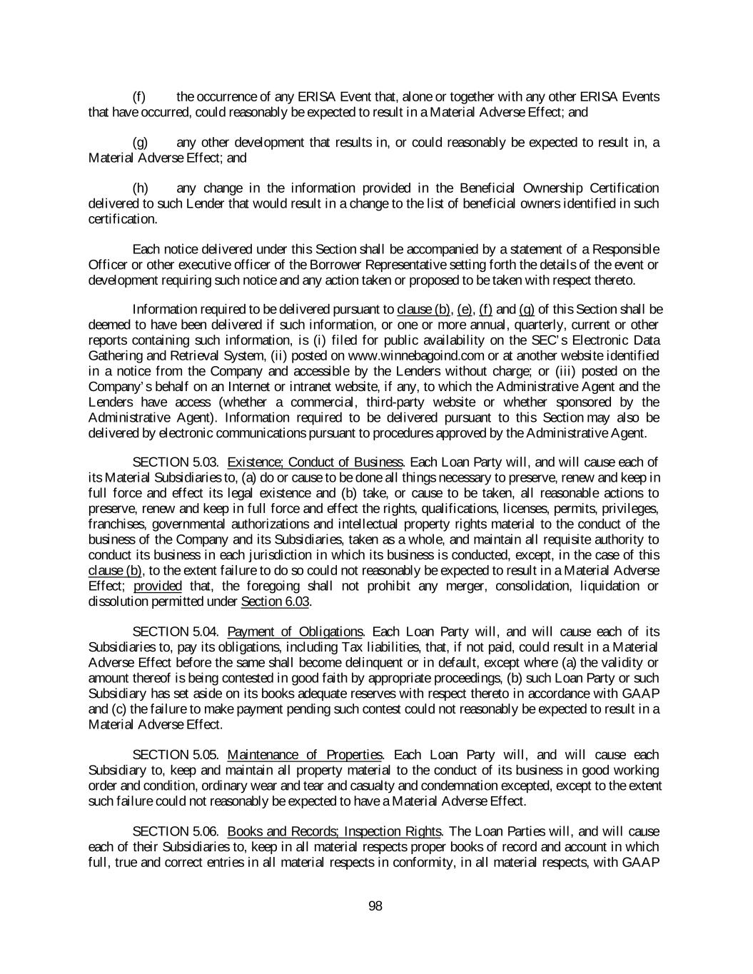 (f) the occurrence of any ERISA Event that, alone or together with any other ERISA Events that have occurred, could reasonably be expected to result in a Material Adverse Effect; and (g) any other development that results in, or could reasonably be expected to result in, a Material Adverse Effect; and (h) any change in the information provided in the Beneficial Ownership Certification delivered to such Lender that would result in a change to the list of beneficial owners identified in such certification. Each notice delivered under this Section shall be accompanied by a statement of a Responsible Officer or other executive officer of the Borrower Representative setting forth the details of the event or development requiring such notice and any action taken or proposed to be taken with respect thereto. Information required to be delivered pursuant to clause (b), (e), (f) and (g) of this Section shall be deemed to have been delivered if such information, or one or more annual, quarterly, current or other reports containing such information, is (i) filed for public availability on the SEC’s Electronic Data Gathering and Retrieval System, (ii) posted on www.winnebagoind.com or at another website identified in a notice from the Company and accessible by the Lenders without charge; or (iii) posted on the Company’s behalf on an Internet or intranet website, if any, to which the Administrative Agent and the Lenders have access (whether a commercial, third-party website or whether sponsored by the Administrative Agent). Information required to be delivered pursuant to this Section may also be delivered by electronic communications pursuant to procedures approved by the Administrative Agent. SECTION 5.03. Existence; Conduct of Business. Each Loan Party will, and will cause each of its Material Subsidiaries to, (a) do or cause to be done all things necessary to preserve, renew and keep in full force and effect its legal existence and (b) take, or cause to be taken, all reasonable actions to preserve, renew and keep in full force and effect the rights, qualifications, licenses, permits, privileges, franchises, governmental authorizations and intellectual property rights material to the conduct of the business of the Company and its Subsidiaries, taken as a whole, and maintain all requisite authority to conduct its business in each jurisdiction in which its business is conducted, except, in the case of this clause (b), to the extent failure to do so could not reasonably be expected to result in a Material Adverse Effect; provided that, the foregoing shall not prohibit any merger, consolidation, liquidation or dissolution permitted under Section 6.03. SECTION 5.04. Payment of Obligations. Each Loan Party will, and will cause each of its Subsidiaries to, pay its obligations, including Tax liabilities, that, if not paid, could result in a Material Adverse Effect before the same shall become delinquent or in default, except where (a) the validity or amount thereof is being contested in good faith by appropriate proceedings, (b) such Loan Party or such Subsidiary has set aside on its books adequate reserves with respect thereto in accordance with GAAP and (c) the failure to make payment pending such contest could not reasonably be expected to result in a Material Adverse Effect. SECTION 5.05. Maintenance of Properties. Each Loan Party will, and will cause each Subsidiary to, keep and maintain all property material to the conduct of its business in good working order and condition, ordinary wear and tear and casualty and condemnation excepted, except to the extent such failure could not reasonably be expected to have a Material Adverse Effect. SECTION 5.06. Books and Records; Inspection Rights. The Loan Parties will, and will cause each of their Subsidiaries to, keep in all material respects proper books of record and account in which full, true and correct entries in all material respects in conformity, in all material respects, with GAAP 98