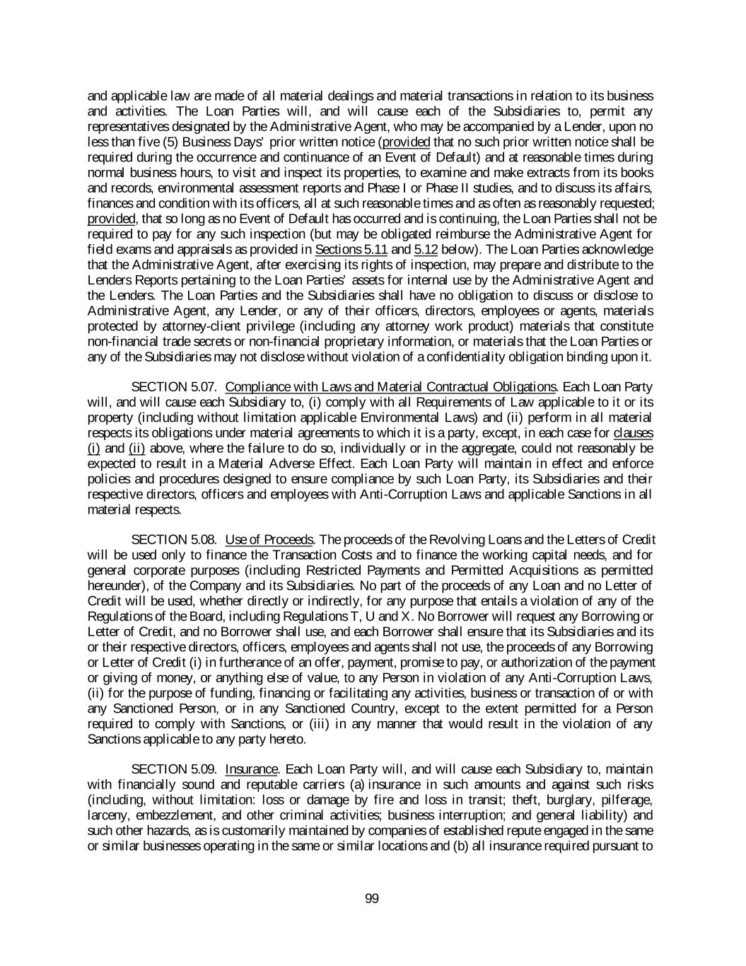 and applicable law are made of all material dealings and material transactions in relation to its business and activities. The Loan Parties will, and will cause each of the Subsidiaries to, permit any representatives designated by the Administrative Agent, who may be accompanied by a Lender, upon no less than five (5) Business Days’ prior written notice (provided that no such prior written notice shall be required during the occurrence and continuance of an Event of Default) and at reasonable times during normal business hours, to visit and inspect its properties, to examine and make extracts from its books and records, environmental assessment reports and Phase I or Phase II studies, and to discuss its affairs, finances and condition with its officers, all at such reasonable times and as often as reasonably requested; provided, that so long as no Event of Default has occurred and is continuing, the Loan Parties shall not be required to pay for any such inspection (but may be obligated reimburse the Administrative Agent for field exams and appraisals as provided in Sections 5.11 and 5.12 below). The Loan Parties acknowledge that the Administrative Agent, after exercising its rights of inspection, may prepare and distribute to the Lenders Reports pertaining to the Loan Parties’ assets for internal use by the Administrative Agent and the Lenders. The Loan Parties and the Subsidiaries shall have no obligation to discuss or disclose to Administrative Agent, any Lender, or any of their officers, directors, employees or agents, materials protected by attorney-client privilege (including any attorney work product) materials that constitute non-financial trade secrets or non-financial proprietary information, or materials that the Loan Parties or any of the Subsidiaries may not disclose without violation of a confidentiality obligation binding upon it. SECTION 5.07. Compliance with Laws and Material Contractual Obligations. Each Loan Party will, and will cause each Subsidiary to, (i) comply with all Requirements of Law applicable to it or its property (including without limitation applicable Environmental Laws) and (ii) perform in all material respects its obligations under material agreements to which it is a party, except, in each case for clauses (i) and (ii) above, where the failure to do so, individually or in the aggregate, could not reasonably be expected to result in a Material Adverse Effect. Each Loan Party will maintain in effect and enforce policies and procedures designed to ensure compliance by such Loan Party, its Subsidiaries and their respective directors, officers and employees with Anti-Corruption Laws and applicable Sanctions in all material respects. SECTION 5.08. Use of Proceeds. The proceeds of the Revolving Loans and the Letters of Credit will be used only to finance the Transaction Costs and to finance the working capital needs, and for general corporate purposes (including Restricted Payments and Permitted Acquisitions as permitted hereunder), of the Company and its Subsidiaries. No part of the proceeds of any Loan and no Letter of Credit will be used, whether directly or indirectly, for any purpose that entails a violation of any of the Regulations of the Board, including Regulations T, U and X. No Borrower will request any Borrowing or Letter of Credit, and no Borrower shall use, and each Borrower shall ensure that its Subsidiaries and its or their respective directors, officers, employees and agents shall not use, the proceeds of any Borrowing or Letter of Credit (i) in furtherance of an offer, payment, promise to pay, or authorization of the payment or giving of money, or anything else of value, to any Person in violation of any Anti-Corruption Laws, (ii) for the purpose of funding, financing or facilitating any activities, business or transaction of or with any Sanctioned Person, or in any Sanctioned Country, except to the extent permitted for a Person required to comply with Sanctions, or (iii) in any manner that would result in the violation of any Sanctions applicable to any party hereto. SECTION 5.09. Insurance. Each Loan Party will, and will cause each Subsidiary to, maintain with financially sound and reputable carriers (a) insurance in such amounts and against such risks (including, without limitation: loss or damage by fire and loss in transit; theft, burglary, pilferage, larceny, embezzlement, and other criminal activities; business interruption; and general liability) and such other hazards, as is customarily maintained by companies of established repute engaged in the same or similar businesses operating in the same or similar locations and (b) all insurance required pursuant to 99