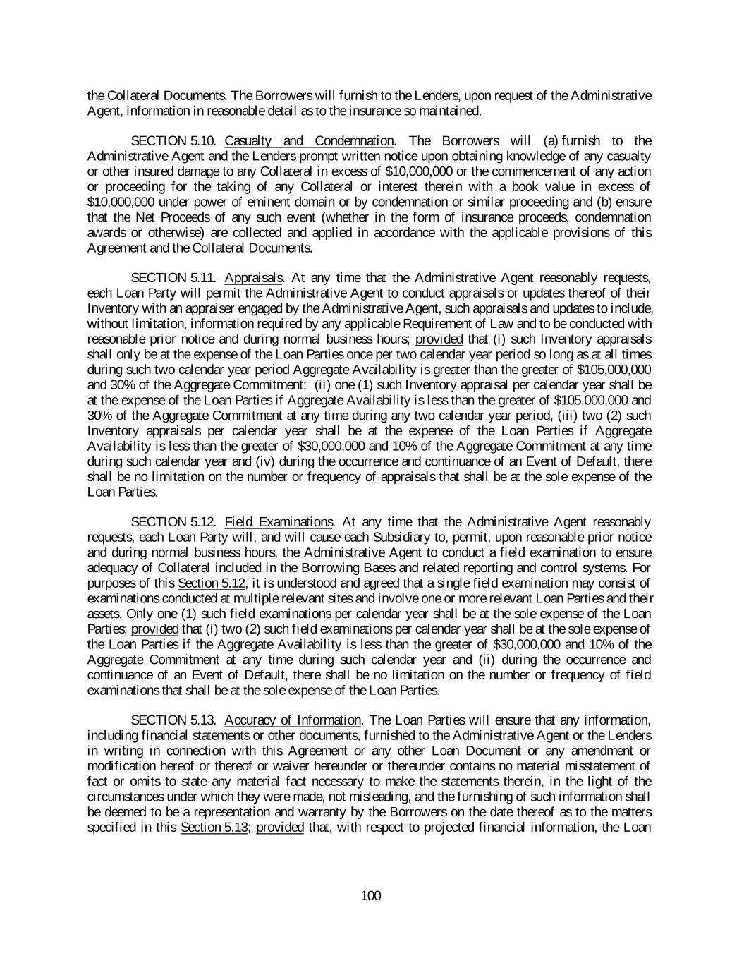 the Collateral Documents. The Borrowers will furnish to the Lenders, upon request of the Administrative Agent, information in reasonable detail as to the insurance so maintained. SECTION 5.10. Casualty and Condemnation. The Borrowers will (a) furnish to the Administrative Agent and the Lenders prompt written notice upon obtaining knowledge of any casualty or other insured damage to any Collateral in excess of $10,000,000 or the commencement of any action or proceeding for the taking of any Collateral or interest therein with a book value in excess of $10,000,000 under power of eminent domain or by condemnation or similar proceeding and (b) ensure that the Net Proceeds of any such event (whether in the form of insurance proceeds, condemnation awards or otherwise) are collected and applied in accordance with the applicable provisions of this Agreement and the Collateral Documents. SECTION 5.11. Appraisals. At any time that the Administrative Agent reasonably requests, each Loan Party will permit the Administrative Agent to conduct appraisals or updates thereof of their Inventory with an appraiser engaged by the Administrative Agent, such appraisals and updates to include, without limitation, information required by any applicable Requirement of Law and to be conducted with reasonable prior notice and during normal business hours; provided that (i) such Inventory appraisals shall only be at the expense of the Loan Parties once per two calendar year period so long as at all times during such two calendar year period Aggregate Availability is greater than the greater of $105,000,000 and 30% of the Aggregate Commitment; (ii) one (1) such Inventory appraisal per calendar year shall be at the expense of the Loan Parties if Aggregate Availability is less than the greater of $105,000,000 and 30% of the Aggregate Commitment at any time during any two calendar year period, (iii) two (2) such Inventory appraisals per calendar year shall be at the expense of the Loan Parties if Aggregate Availability is less than the greater of $30,000,000 and 10% of the Aggregate Commitment at any time during such calendar year and (iv) during the occurrence and continuance of an Event of Default, there shall be no limitation on the number or frequency of appraisals that shall be at the sole expense of the Loan Parties. SECTION 5.12. Field Examinations. At any time that the Administrative Agent reasonably requests, each Loan Party will, and will cause each Subsidiary to, permit, upon reasonable prior notice and during normal business hours, the Administrative Agent to conduct a field examination to ensure adequacy of Collateral included in the Borrowing Bases and related reporting and control systems. For purposes of this Section 5.12, it is understood and agreed that a single field examination may consist of examinations conducted at multiple relevant sites and involve one or more relevant Loan Parties and their assets. Only one (1) such field examinations per calendar year shall be at the sole expense of the Loan Parties; provided that (i) two (2) such field examinations per calendar year shall be at the sole expense of the Loan Parties if the Aggregate Availability is less than the greater of $30,000,000 and 10% of the Aggregate Commitment at any time during such calendar year and (ii) during the occurrence and continuance of an Event of Default, there shall be no limitation on the number or frequency of field examinations that shall be at the sole expense of the Loan Parties. SECTION 5.13. Accuracy of Information. The Loan Parties will ensure that any information, including financial statements or other documents, furnished to the Administrative Agent or the Lenders in writing in connection with this Agreement or any other Loan Document or any amendment or modification hereof or thereof or waiver hereunder or thereunder contains no material misstatement of fact or omits to state any material fact necessary to make the statements therein, in the light of the circumstances under which they were made, not misleading, and the furnishing of such information shall be deemed to be a representation and warranty by the Borrowers on the date thereof as to the matters specified in this Section 5.13; provided that, with respect to projected financial information, the Loan 100