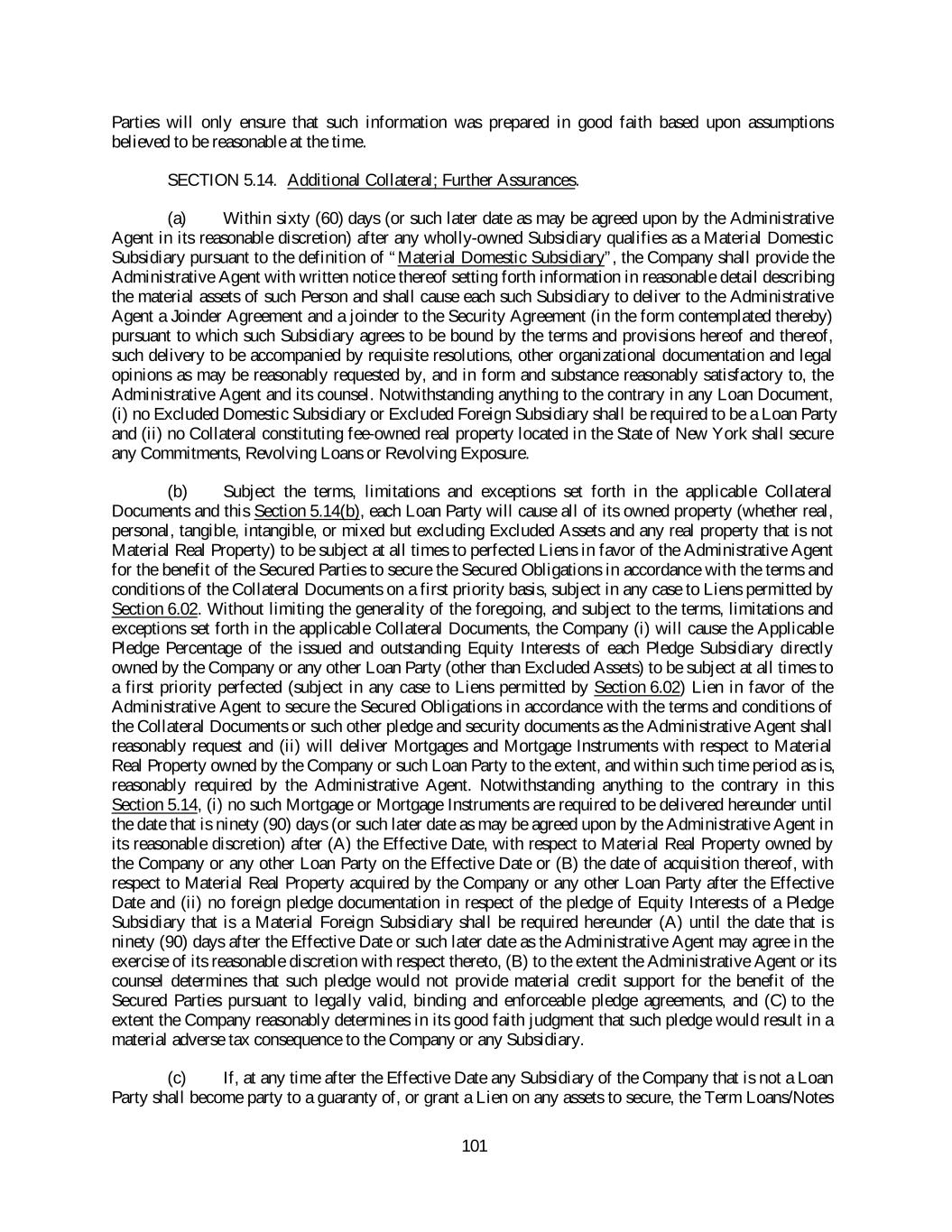 Parties will only ensure that such information was prepared in good faith based upon assumptions believed to be reasonable at the time. SECTION 5.14. Additional Collateral; Further Assurances. (a) Within sixty (60) days (or such later date as may be agreed upon by the Administrative Agent in its reasonable discretion) after any wholly-owned Subsidiary qualifies as a Material Domestic Subsidiary pursuant to the definition of “Material Domestic Subsidiary”, the Company shall provide the Administrative Agent with written notice thereof setting forth information in reasonable detail describing the material assets of such Person and shall cause each such Subsidiary to deliver to the Administrative Agent a Joinder Agreement and a joinder to the Security Agreement (in the form contemplated thereby) pursuant to which such Subsidiary agrees to be bound by the terms and provisions hereof and thereof, such delivery to be accompanied by requisite resolutions, other organizational documentation and legal opinions as may be reasonably requested by, and in form and substance reasonably satisfactory to, the Administrative Agent and its counsel. Notwithstanding anything to the contrary in any Loan Document, (i) no Excluded Domestic Subsidiary or Excluded Foreign Subsidiary shall be required to be a Loan Party and (ii) no Collateral constituting fee-owned real property located in the State of New York shall secure any Commitments, Revolving Loans or Revolving Exposure. (b) Subject the terms, limitations and exceptions set forth in the applicable Collateral Documents and this Section 5.14(b), each Loan Party will cause all of its owned property (whether real, personal, tangible, intangible, or mixed but excluding Excluded Assets and any real property that is not Material Real Property) to be subject at all times to perfected Liens in favor of the Administrative Agent for the benefit of the Secured Parties to secure the Secured Obligations in accordance with the terms and conditions of the Collateral Documents on a first priority basis, subject in any case to Liens permitted by Section 6.02. Without limiting the generality of the foregoing, and subject to the terms, limitations and exceptions set forth in the applicable Collateral Documents, the Company (i) will cause the Applicable Pledge Percentage of the issued and outstanding Equity Interests of each Pledge Subsidiary directly owned by the Company or any other Loan Party (other than Excluded Assets) to be subject at all times to a first priority perfected (subject in any case to Liens permitted by Section 6.02) Lien in favor of the Administrative Agent to secure the Secured Obligations in accordance with the terms and conditions of the Collateral Documents or such other pledge and security documents as the Administrative Agent shall reasonably request and (ii) will deliver Mortgages and Mortgage Instruments with respect to Material Real Property owned by the Company or such Loan Party to the extent, and within such time period as is, reasonably required by the Administrative Agent. Notwithstanding anything to the contrary in this Section 5.14, (i) no such Mortgage or Mortgage Instruments are required to be delivered hereunder until the date that is ninety (90) days (or such later date as may be agreed upon by the Administrative Agent in its reasonable discretion) after (A) the Effective Date, with respect to Material Real Property owned by the Company or any other Loan Party on the Effective Date or (B) the date of acquisition thereof, with respect to Material Real Property acquired by the Company or any other Loan Party after the Effective Date and (ii) no foreign pledge documentation in respect of the pledge of Equity Interests of a Pledge Subsidiary that is a Material Foreign Subsidiary shall be required hereunder (A) until the date that is ninety (90) days after the Effective Date or such later date as the Administrative Agent may agree in the exercise of its reasonable discretion with respect thereto, (B) to the extent the Administrative Agent or its counsel determines that such pledge would not provide material credit support for the benefit of the Secured Parties pursuant to legally valid, binding and enforceable pledge agreements, and (C) to the extent the Company reasonably determines in its good faith judgment that such pledge would result in a material adverse tax consequence to the Company or any Subsidiary. (c) If, at any time after the Effective Date any Subsidiary of the Company that is not a Loan Party shall become party to a guaranty of, or grant a Lien on any assets to secure, the Term Loans/Notes 101