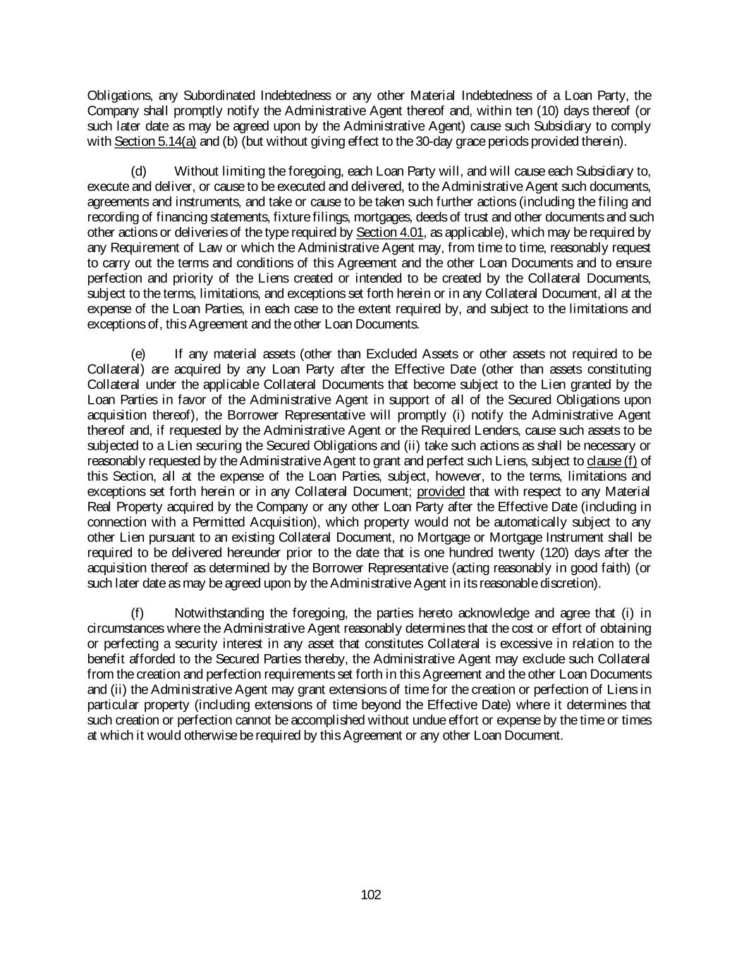 Obligations, any Subordinated Indebtedness or any other Material Indebtedness of a Loan Party, the Company shall promptly notify the Administrative Agent thereof and, within ten (10) days thereof (or such later date as may be agreed upon by the Administrative Agent) cause such Subsidiary to comply with Section 5.14(a) and (b) (but without giving effect to the 30-day grace periods provided therein). (d) Without limiting the foregoing, each Loan Party will, and will cause each Subsidiary to, execute and deliver, or cause to be executed and delivered, to the Administrative Agent such documents, agreements and instruments, and take or cause to be taken such further actions (including the filing and recording of financing statements, fixture filings, mortgages, deeds of trust and other documents and such other actions or deliveries of the type required by Section 4.01, as applicable), which may be required by any Requirement of Law or which the Administrative Agent may, from time to time, reasonably request to carry out the terms and conditions of this Agreement and the other Loan Documents and to ensure perfection and priority of the Liens created or intended to be created by the Collateral Documents, subject to the terms, limitations, and exceptions set forth herein or in any Collateral Document, all at the expense of the Loan Parties, in each case to the extent required by, and subject to the limitations and exceptions of, this Agreement and the other Loan Documents. (e) If any material assets (other than Excluded Assets or other assets not required to be Collateral) are acquired by any Loan Party after the Effective Date (other than assets constituting Collateral under the applicable Collateral Documents that become subject to the Lien granted by the Loan Parties in favor of the Administrative Agent in support of all of the Secured Obligations upon acquisition thereof), the Borrower Representative will promptly (i) notify the Administrative Agent thereof and, if requested by the Administrative Agent or the Required Lenders, cause such assets to be subjected to a Lien securing the Secured Obligations and (ii) take such actions as shall be necessary or reasonably requested by the Administrative Agent to grant and perfect such Liens, subject to clause (f) of this Section, all at the expense of the Loan Parties, subject, however, to the terms, limitations and exceptions set forth herein or in any Collateral Document; provided that with respect to any Material Real Property acquired by the Company or any other Loan Party after the Effective Date (including in connection with a Permitted Acquisition), which property would not be automatically subject to any other Lien pursuant to an existing Collateral Document, no Mortgage or Mortgage Instrument shall be required to be delivered hereunder prior to the date that is one hundred twenty (120) days after the acquisition thereof as determined by the Borrower Representative (acting reasonably in good faith) (or such later date as may be agreed upon by the Administrative Agent in its reasonable discretion). (f) Notwithstanding the foregoing, the parties hereto acknowledge and agree that (i) in circumstances where the Administrative Agent reasonably determines that the cost or effort of obtaining or perfecting a security interest in any asset that constitutes Collateral is excessive in relation to the benefit afforded to the Secured Parties thereby, the Administrative Agent may exclude such Collateral from the creation and perfection requirements set forth in this Agreement and the other Loan Documents and (ii) the Administrative Agent may grant extensions of time for the creation or perfection of Liens in particular property (including extensions of time beyond the Effective Date) where it determines that such creation or perfection cannot be accomplished without undue effort or expense by the time or times at which it would otherwise be required by this Agreement or any other Loan Document. 102