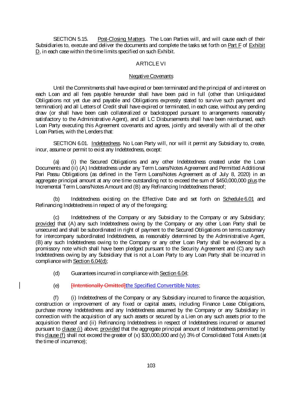SECTION 5.15. Post-Closing Matters. The Loan Parties will, and will cause each of their Subsidiaries to, execute and deliver the documents and complete the tasks set forth on Part F of Exhibit D, in each case within the time limits specified on such Exhibit. ARTICLE VI Negative Covenants Until the Commitments shall have expired or been terminated and the principal of and interest on each Loan and all fees payable hereunder shall have been paid in full (other than Unliquidated Obligations not yet due and payable and Obligations expressly stated to survive such payment and termination) and all Letters of Credit shall have expired or terminated, in each case, without any pending draw (or shall have been cash collateralized or backstopped pursuant to arrangements reasonably satisfactory to the Administrative Agent), and all LC Disbursements shall have been reimbursed, each Loan Party executing this Agreement covenants and agrees, jointly and severally with all of the other Loan Parties, with the Lenders that: SECTION 6.01. Indebtedness. No Loan Party will, nor will it permit any Subsidiary to, create, incur, assume or permit to exist any Indebtedness, except: (a) (i) the Secured Obligations and any other Indebtedness created under the Loan Documents and (ii) (A) Indebtedness under any Term Loans/Notes Agreement and Permitted Additional Pari Passu Obligations (as defined in the Term Loans/Notes Agreement as of July 8, 2020) in an aggregate principal amount at any one time outstanding not to exceed the sum of $450,000,000 plus the Incremental Term Loans/Notes Amount and (B) any Refinancing Indebtedness thereof; (b) Indebtedness existing on the Effective Date and set forth on Schedule 6.01 and Refinancing Indebtedness in respect of any of the foregoing; (c) Indebtedness of the Company or any Subsidiary to the Company or any Subsidiary; provided that (A) any such Indebtedness owing by the Company or any other Loan Party shall be unsecured and shall be subordinated in right of payment to the Secured Obligations on terms customary for intercompany subordinated Indebtedness, as reasonably determined by the Administrative Agent, (B) any such Indebtedness owing to the Company or any other Loan Party shall be evidenced by a promissory note which shall have been pledged pursuant to the Security Agreement and (C) any such Indebtedness owing by any Subsidiary that is not a Loan Party to any Loan Party shall be incurred in compliance with Section 6.04(d); (d) Guarantees incurred in compliance with Section 6.04; (e) [Intentionally Omitted]the Specified Convertible Notes; (f) (i) Indebtedness of the Company or any Subsidiary incurred to finance the acquisition, construction or improvement of any fixed or capital assets, including Finance Lease Obligations, purchase money Indebtedness and any Indebtedness assumed by the Company or any Subsidiary in connection with the acquisition of any such assets or secured by a Lien on any such assets prior to the acquisition thereof and (ii) Refinancing Indebtedness in respect of Indebtedness incurred or assumed pursuant to clause (i) above; provided that the aggregate principal amount of Indebtedness permitted by this clause (f) shall not exceed the greater of (x) $30,000,000 and (y) 3% of Consolidated Total Assets (at the time of incurrence); 103