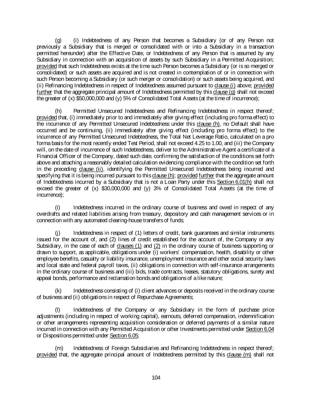 (g) (i) Indebtedness of any Person that becomes a Subsidiary (or of any Person not previously a Subsidiary that is merged or consolidated with or into a Subsidiary in a transaction permitted hereunder) after the Effective Date, or Indebtedness of any Person that is assumed by any Subsidiary in connection with an acquisition of assets by such Subsidiary in a Permitted Acquisition; provided that such Indebtedness exists at the time such Person becomes a Subsidiary (or is so merged or consolidated) or such assets are acquired and is not created in contemplation of or in connection with such Person becoming a Subsidiary (or such merger or consolidation) or such assets being acquired, and (ii) Refinancing Indebtedness in respect of Indebtedness assumed pursuant to clause (i) above; provided further that the aggregate principal amount of Indebtedness permitted by this clause (g) shall not exceed the greater of (x) $50,000,000 and (y) 5% of Consolidated Total Assets (at the time of incurrence); (h) Permitted Unsecured Indebtedness and Refinancing Indebtedness in respect thereof; provided that, (i) immediately prior to and immediately after giving effect (including pro forma effect) to the incurrence of any Permitted Unsecured Indebtedness under this clause (h), no Default shall have occurred and be continuing, (ii) immediately after giving effect (including pro forma effect) to the incurrence of any Permitted Unsecured Indebtedness, the Total Net Leverage Ratio, calculated on a pro forma basis for the most recently ended Test Period, shall not exceed 4.25 to 1.00, and (iii) the Company will, on the date of incurrence of such Indebtedness, deliver to the Administrative Agent a certificate of a Financial Officer of the Company, dated such date, confirming the satisfaction of the conditions set forth above and attaching a reasonably detailed calculation evidencing compliance with the condition set forth in the preceding clause (ii), identifying the Permitted Unsecured Indebtedness being incurred and specifying that it is being incurred pursuant to this clause (h); provided further that the aggregate amount of Indebtedness incurred by a Subsidiary that is not a Loan Party under this Section 6.01(h) shall not exceed the greater of (x) $30,000,000 and (y) 3% of Consolidated Total Assets (at the time of incurrence); (i) Indebtedness incurred in the ordinary course of business and owed in respect of any overdrafts and related liabilities arising from treasury, depository and cash management services or in connection with any automated clearing-house transfers of funds; (j) Indebtedness in respect of (1) letters of credit, bank guarantees and similar instruments issued for the account of, and (2) lines of credit established for the account of, the Company or any Subsidiary, in the case of each of clauses (1) and (2) in the ordinary course of business supporting or drawn to support, as applicable, obligations under (i) workers’ compensation, health, disability or other employee benefits, casualty or liability insurance, unemployment insurance and other social security laws and local state and federal payroll taxes, (ii) obligations in connection with self-insurance arrangements in the ordinary course of business and (iii) bids, trade contracts, leases, statutory obligations, surety and appeal bonds, performance and reclamation bonds and obligations of a like nature; (k) Indebtedness consisting of (i) client advances or deposits received in the ordinary course of business and (ii) obligations in respect of Repurchase Agreements; (l) Indebtedness of the Company or any Subsidiary in the form of purchase price adjustments (including in respect of working capital), earnouts, deferred compensation, indemnification or other arrangements representing acquisition consideration or deferred payments of a similar nature incurred in connection with any Permitted Acquisition or other Investments permitted under Section 6.04 or Dispositions permitted under Section 6.05; (m) Indebtedness of Foreign Subsidiaries and Refinancing Indebtedness in respect thereof; provided that, the aggregate principal amount of Indebtedness permitted by this clause (m) shall not 104