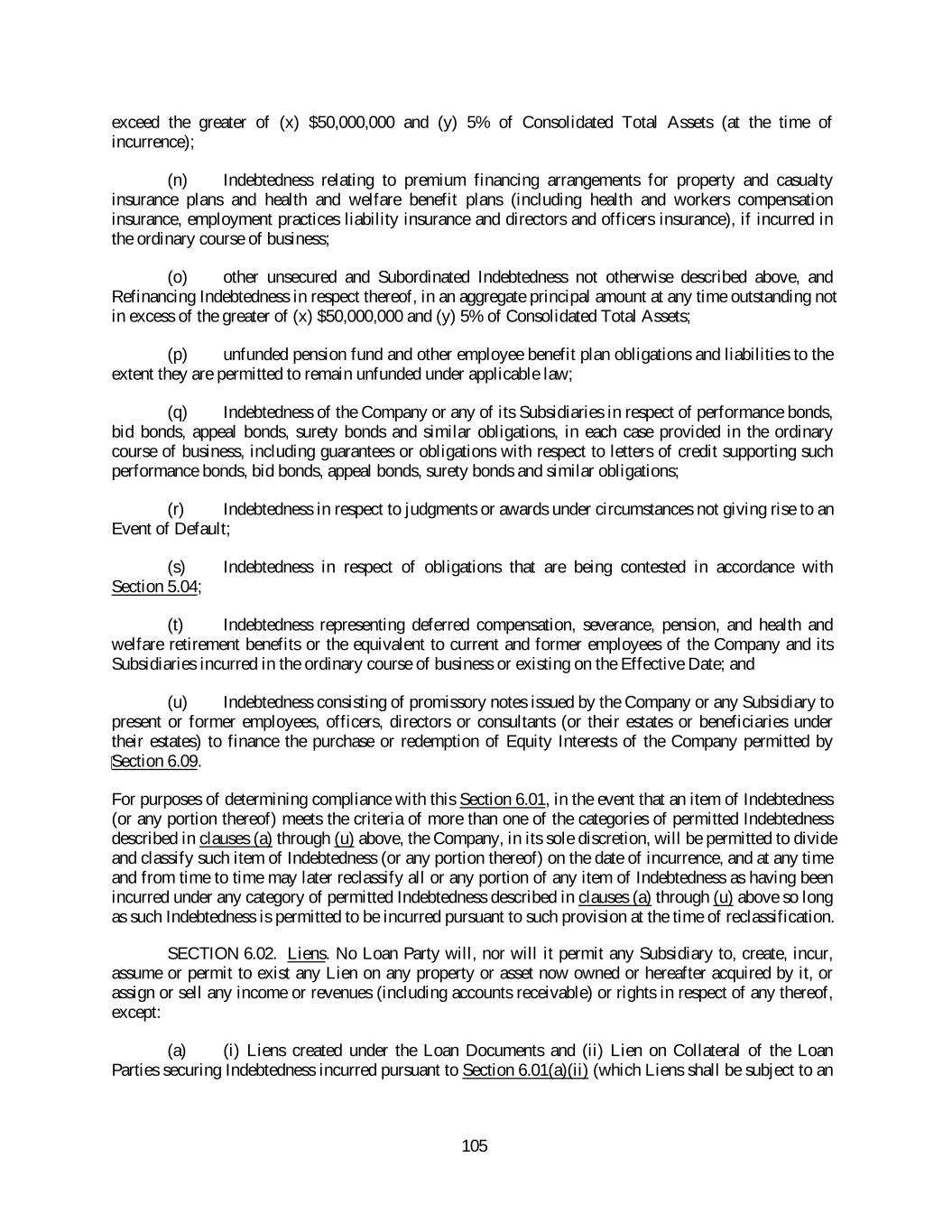 exceed the greater of (x) $50,000,000 and (y) 5% of Consolidated Total Assets (at the time of incurrence); (n) Indebtedness relating to premium financing arrangements for property and casualty insurance plans and health and welfare benefit plans (including health and workers compensation insurance, employment practices liability insurance and directors and officers insurance), if incurred in the ordinary course of business; (o) other unsecured and Subordinated Indebtedness not otherwise described above, and Refinancing Indebtedness in respect thereof, in an aggregate principal amount at any time outstanding not in excess of the greater of (x) $50,000,000 and (y) 5% of Consolidated Total Assets; (p) unfunded pension fund and other employee benefit plan obligations and liabilities to the extent they are permitted to remain unfunded under applicable law; (q) Indebtedness of the Company or any of its Subsidiaries in respect of performance bonds, bid bonds, appeal bonds, surety bonds and similar obligations, in each case provided in the ordinary course of business, including guarantees or obligations with respect to letters of credit supporting such performance bonds, bid bonds, appeal bonds, surety bonds and similar obligations; (r) Indebtedness in respect to judgments or awards under circumstances not giving rise to an Event of Default; (s) Indebtedness in respect of obligations that are being contested in accordance with Section 5.04; (t) Indebtedness representing deferred compensation, severance, pension, and health and welfare retirement benefits or the equivalent to current and former employees of the Company and its Subsidiaries incurred in the ordinary course of business or existing on the Effective Date; and (u) Indebtedness consisting of promissory notes issued by the Company or any Subsidiary to present or former employees, officers, directors or consultants (or their estates or beneficiaries under their estates) to finance the purchase or redemption of Equity Interests of the Company permitted by Section 6.09. For purposes of determining compliance with this Section 6.01, in the event that an item of Indebtedness (or any portion thereof) meets the criteria of more than one of the categories of permitted Indebtedness described in clauses (a) through (u) above, the Company, in its sole discretion, will be permitted to divide and classify such item of Indebtedness (or any portion thereof) on the date of incurrence, and at any time and from time to time may later reclassify all or any portion of any item of Indebtedness as having been incurred under any category of permitted Indebtedness described in clauses (a) through (u) above so long as such Indebtedness is permitted to be incurred pursuant to such provision at the time of reclassification. SECTION 6.02. Liens. No Loan Party will, nor will it permit any Subsidiary to, create, incur, assume or permit to exist any Lien on any property or asset now owned or hereafter acquired by it, or assign or sell any income or revenues (including accounts receivable) or rights in respect of any thereof, except: (a) (i) Liens created under the Loan Documents and (ii) Lien on Collateral of the Loan Parties securing Indebtedness incurred pursuant to Section 6.01(a)(ii) (which Liens shall be subject to an 105