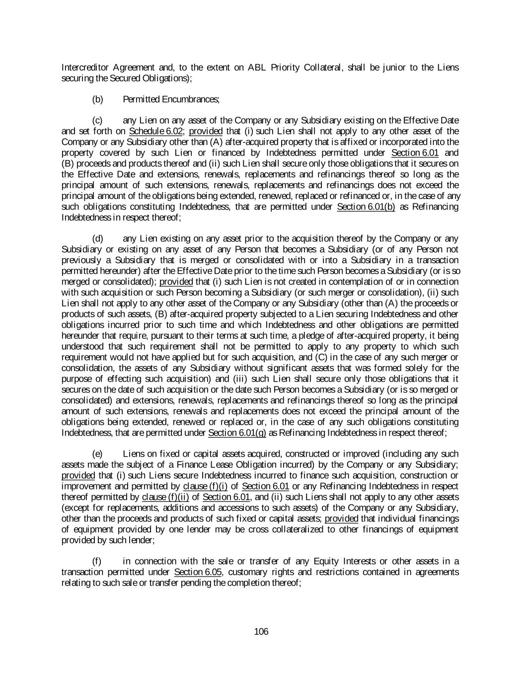 Intercreditor Agreement and, to the extent on ABL Priority Collateral, shall be junior to the Liens securing the Secured Obligations); (b) Permitted Encumbrances; (c) any Lien on any asset of the Company or any Subsidiary existing on the Effective Date and set forth on Schedule 6.02; provided that (i) such Lien shall not apply to any other asset of the Company or any Subsidiary other than (A) after-acquired property that is affixed or incorporated into the property covered by such Lien or financed by Indebtedness permitted under Section 6.01 and (B) proceeds and products thereof and (ii) such Lien shall secure only those obligations that it secures on the Effective Date and extensions, renewals, replacements and refinancings thereof so long as the principal amount of such extensions, renewals, replacements and refinancings does not exceed the principal amount of the obligations being extended, renewed, replaced or refinanced or, in the case of any such obligations constituting Indebtedness, that are permitted under Section 6.01(b) as Refinancing Indebtedness in respect thereof; (d) any Lien existing on any asset prior to the acquisition thereof by the Company or any Subsidiary or existing on any asset of any Person that becomes a Subsidiary (or of any Person not previously a Subsidiary that is merged or consolidated with or into a Subsidiary in a transaction permitted hereunder) after the Effective Date prior to the time such Person becomes a Subsidiary (or is so merged or consolidated); provided that (i) such Lien is not created in contemplation of or in connection with such acquisition or such Person becoming a Subsidiary (or such merger or consolidation), (ii) such Lien shall not apply to any other asset of the Company or any Subsidiary (other than (A) the proceeds or products of such assets, (B) after-acquired property subjected to a Lien securing Indebtedness and other obligations incurred prior to such time and which Indebtedness and other obligations are permitted hereunder that require, pursuant to their terms at such time, a pledge of after-acquired property, it being understood that such requirement shall not be permitted to apply to any property to which such requirement would not have applied but for such acquisition, and (C) in the case of any such merger or consolidation, the assets of any Subsidiary without significant assets that was formed solely for the purpose of effecting such acquisition) and (iii) such Lien shall secure only those obligations that it secures on the date of such acquisition or the date such Person becomes a Subsidiary (or is so merged or consolidated) and extensions, renewals, replacements and refinancings thereof so long as the principal amount of such extensions, renewals and replacements does not exceed the principal amount of the obligations being extended, renewed or replaced or, in the case of any such obligations constituting Indebtedness, that are permitted under Section 6.01(g) as Refinancing Indebtedness in respect thereof; (e) Liens on fixed or capital assets acquired, constructed or improved (including any such assets made the subject of a Finance Lease Obligation incurred) by the Company or any Subsidiary; provided that (i) such Liens secure Indebtedness incurred to finance such acquisition, construction or improvement and permitted by clause (f)(i) of Section 6.01 or any Refinancing Indebtedness in respect thereof permitted by clause (f)(ii) of Section 6.01, and (ii) such Liens shall not apply to any other assets (except for replacements, additions and accessions to such assets) of the Company or any Subsidiary, other than the proceeds and products of such fixed or capital assets; provided that individual financings of equipment provided by one lender may be cross collateralized to other financings of equipment provided by such lender; (f) in connection with the sale or transfer of any Equity Interests or other assets in a transaction permitted under Section 6.05, customary rights and restrictions contained in agreements relating to such sale or transfer pending the completion thereof; 106