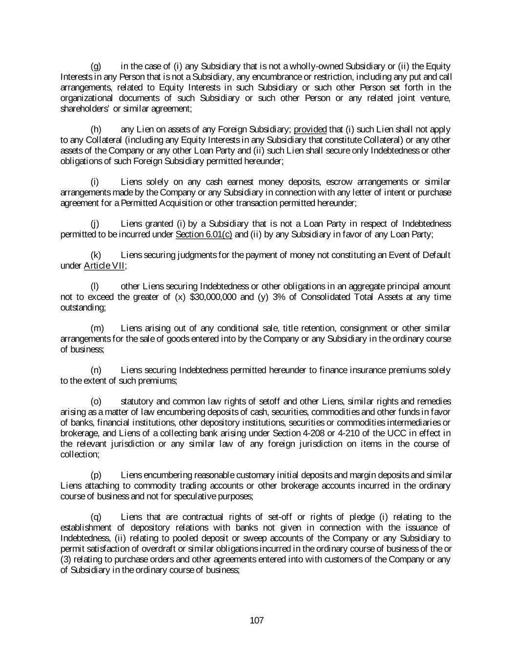(g) in the case of (i) any Subsidiary that is not a wholly-owned Subsidiary or (ii) the Equity Interests in any Person that is not a Subsidiary, any encumbrance or restriction, including any put and call arrangements, related to Equity Interests in such Subsidiary or such other Person set forth in the organizational documents of such Subsidiary or such other Person or any related joint venture, shareholders’ or similar agreement; (h) any Lien on assets of any Foreign Subsidiary; provided that (i) such Lien shall not apply to any Collateral (including any Equity Interests in any Subsidiary that constitute Collateral) or any other assets of the Company or any other Loan Party and (ii) such Lien shall secure only Indebtedness or other obligations of such Foreign Subsidiary permitted hereunder; (i) Liens solely on any cash earnest money deposits, escrow arrangements or similar arrangements made by the Company or any Subsidiary in connection with any letter of intent or purchase agreement for a Permitted Acquisition or other transaction permitted hereunder; (j) Liens granted (i) by a Subsidiary that is not a Loan Party in respect of Indebtedness permitted to be incurred under Section 6.01(c) and (ii) by any Subsidiary in favor of any Loan Party; (k) Liens securing judgments for the payment of money not constituting an Event of Default under Article VII; (l) other Liens securing Indebtedness or other obligations in an aggregate principal amount not to exceed the greater of (x) $30,000,000 and (y) 3% of Consolidated Total Assets at any time outstanding; (m) Liens arising out of any conditional sale, title retention, consignment or other similar arrangements for the sale of goods entered into by the Company or any Subsidiary in the ordinary course of business; (n) Liens securing Indebtedness permitted hereunder to finance insurance premiums solely to the extent of such premiums; (o) statutory and common law rights of setoff and other Liens, similar rights and remedies arising as a matter of law encumbering deposits of cash, securities, commodities and other funds in favor of banks, financial institutions, other depository institutions, securities or commodities intermediaries or brokerage, and Liens of a collecting bank arising under Section 4-208 or 4-210 of the UCC in effect in the relevant jurisdiction or any similar law of any foreign jurisdiction on items in the course of collection; (p) Liens encumbering reasonable customary initial deposits and margin deposits and similar Liens attaching to commodity trading accounts or other brokerage accounts incurred in the ordinary course of business and not for speculative purposes; (q) Liens that are contractual rights of set-off or rights of pledge (i) relating to the establishment of depository relations with banks not given in connection with the issuance of Indebtedness, (ii) relating to pooled deposit or sweep accounts of the Company or any Subsidiary to permit satisfaction of overdraft or similar obligations incurred in the ordinary course of business of the or (3) relating to purchase orders and other agreements entered into with customers of the Company or any of Subsidiary in the ordinary course of business; 107