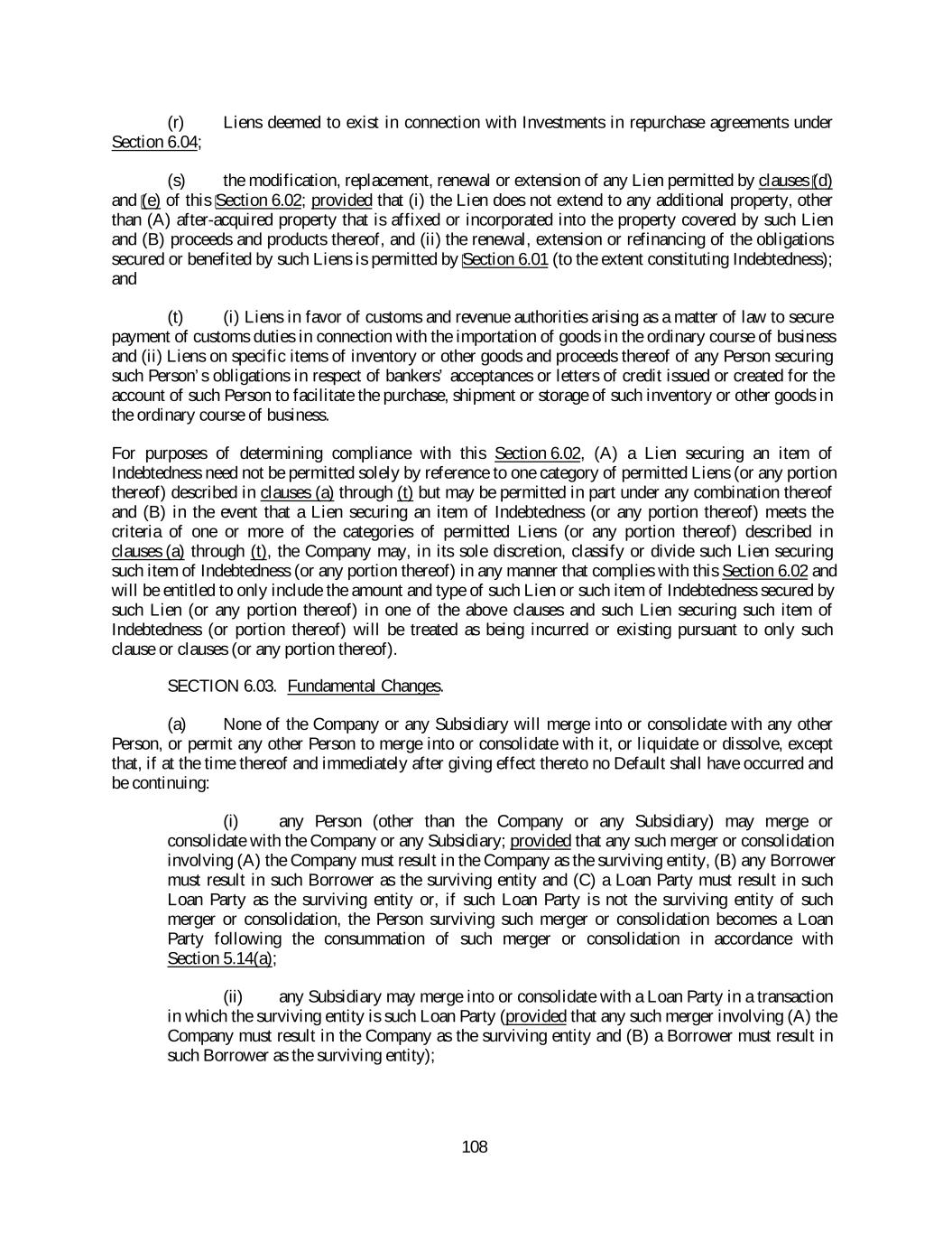 (r) Liens deemed to exist in connection with Investments in repurchase agreements under Section 6.04; (s) the modification, replacement, renewal or extension of any Lien permitted by clauses (d) and (e) of this Section 6.02; provided that (i) the Lien does not extend to any additional property, other than (A) after-acquired property that is affixed or incorporated into the property covered by such Lien and (B) proceeds and products thereof, and (ii) the renewal, extension or refinancing of the obligations secured or benefited by such Liens is permitted by Section 6.01 (to the extent constituting Indebtedness); and (t) (i) Liens in favor of customs and revenue authorities arising as a matter of law to secure payment of customs duties in connection with the importation of goods in the ordinary course of business and (ii) Liens on specific items of inventory or other goods and proceeds thereof of any Person securing such Person’s obligations in respect of bankers’ acceptances or letters of credit issued or created for the account of such Person to facilitate the purchase, shipment or storage of such inventory or other goods in the ordinary course of business. For purposes of determining compliance with this Section 6.02, (A) a Lien securing an item of Indebtedness need not be permitted solely by reference to one category of permitted Liens (or any portion thereof) described in clauses (a) through (t) but may be permitted in part under any combination thereof and (B) in the event that a Lien securing an item of Indebtedness (or any portion thereof) meets the criteria of one or more of the categories of permitted Liens (or any portion thereof) described in clauses (a) through (t), the Company may, in its sole discretion, classify or divide such Lien securing such item of Indebtedness (or any portion thereof) in any manner that complies with this Section 6.02 and will be entitled to only include the amount and type of such Lien or such item of Indebtedness secured by such Lien (or any portion thereof) in one of the above clauses and such Lien securing such item of Indebtedness (or portion thereof) will be treated as being incurred or existing pursuant to only such clause or clauses (or any portion thereof). SECTION 6.03. Fundamental Changes. (a) None of the Company or any Subsidiary will merge into or consolidate with any other Person, or permit any other Person to merge into or consolidate with it, or liquidate or dissolve, except that, if at the time thereof and immediately after giving effect thereto no Default shall have occurred and be continuing: (i) any Person (other than the Company or any Subsidiary) may merge or consolidate with the Company or any Subsidiary; provided that any such merger or consolidation involving (A) the Company must result in the Company as the surviving entity, (B) any Borrower must result in such Borrower as the surviving entity and (C) a Loan Party must result in such Loan Party as the surviving entity or, if such Loan Party is not the surviving entity of such merger or consolidation, the Person surviving such merger or consolidation becomes a Loan Party following the consummation of such merger or consolidation in accordance with Section 5.14(a); (ii) any Subsidiary may merge into or consolidate with a Loan Party in a transaction in which the surviving entity is such Loan Party (provided that any such merger involving (A) the Company must result in the Company as the surviving entity and (B) a Borrower must result in such Borrower as the surviving entity); 108